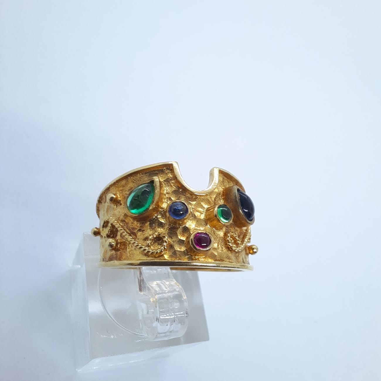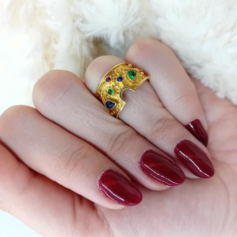 Με έμπνευση κατευθείαν από βυζαντινό αυτοκρατορικό διάδημα, ένα πραγματικά πολύτιμο δαχτυλίδι ,από χρυσό 14 καρατίων , με φαρδιά γάμπα, σφυρήλατη επιφάνεια και λεπτομερές ανάγλυφο σκάλισμα. Στην μπροστινή όψη του 5 πολύτιμοι λίθοι, ρουμπίνι, σμαράγδι και ζαφείρι. Ένα διαχρονικό κόσμημα που θα προκαλεί θαυμασμό σε κάθε εμφάνισή σας.