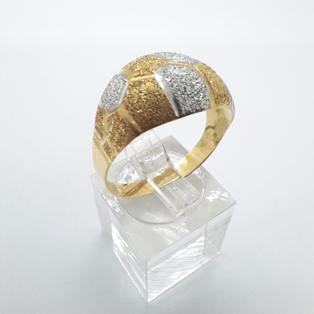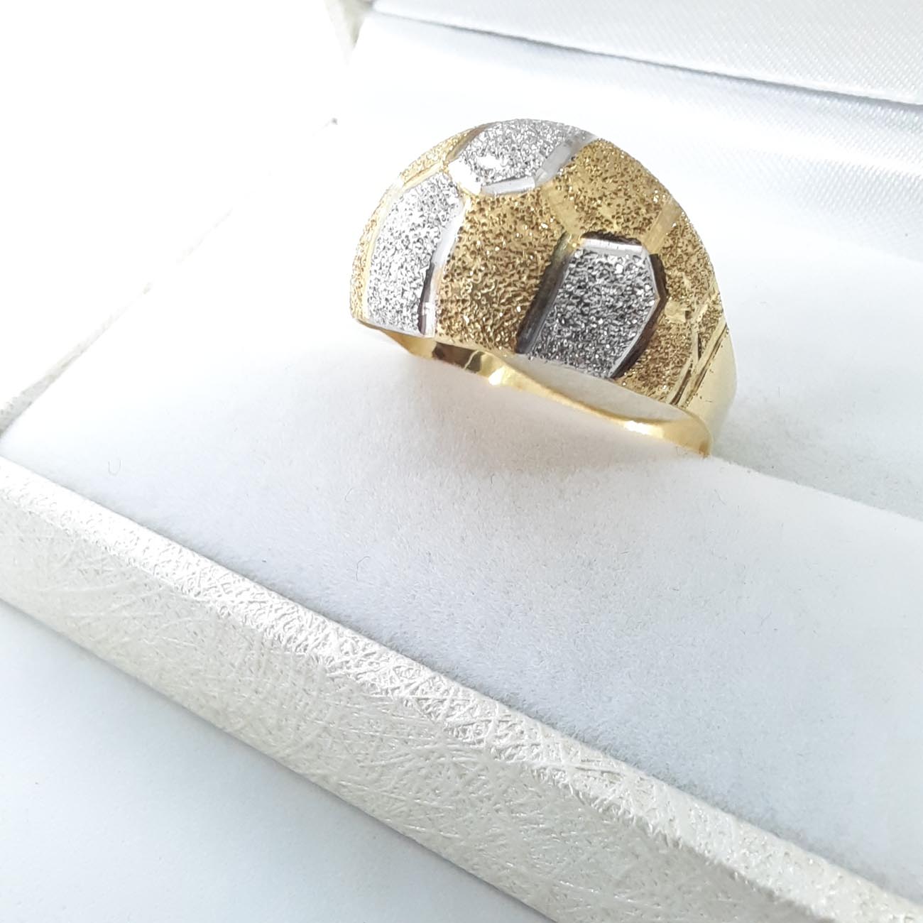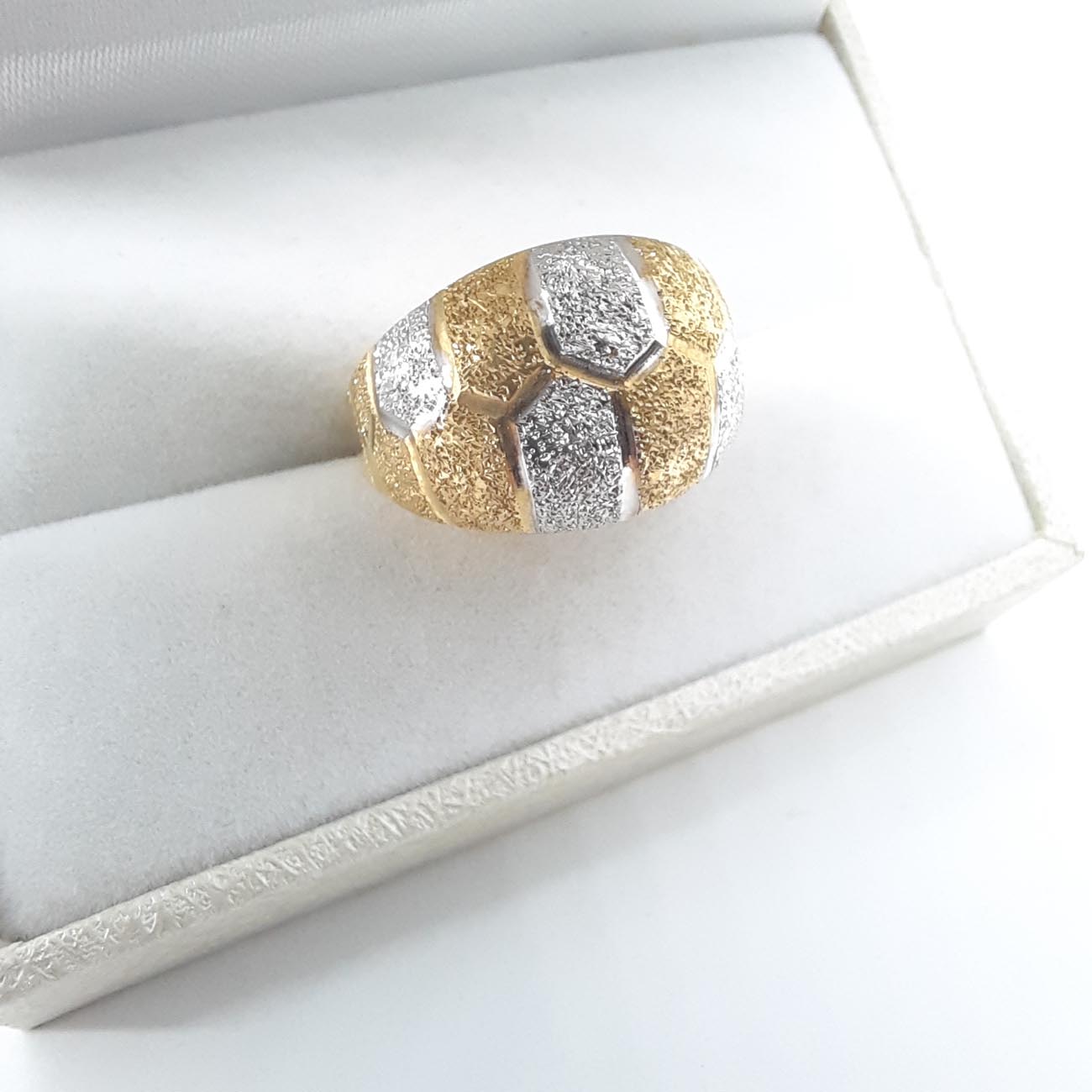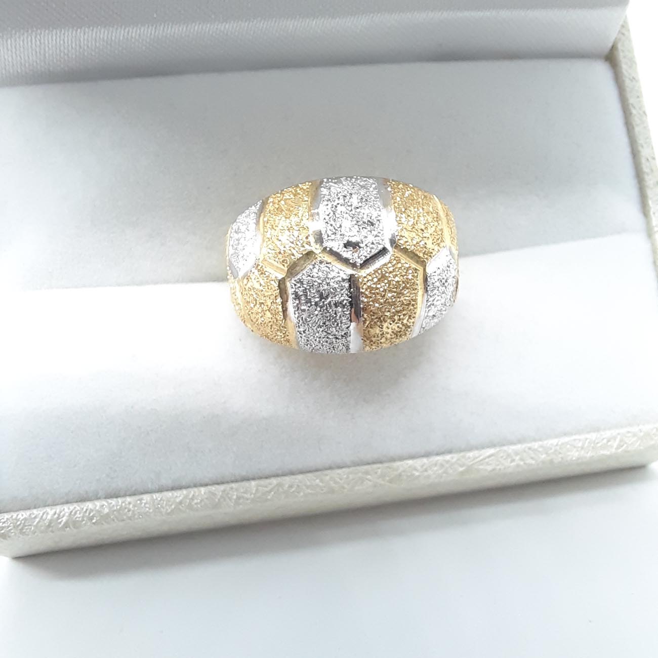 Υπέροχο και πραγματικά βασιλικό δαχτυλίδι με φαρδιά και εντυπωσιακή επιφάνεια, ζαγρέ επεξεργασία και λουστρέ γάμπες , οβάλ design , δίχρωμο, 14 καρατίων.