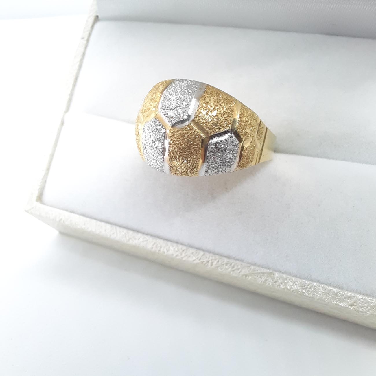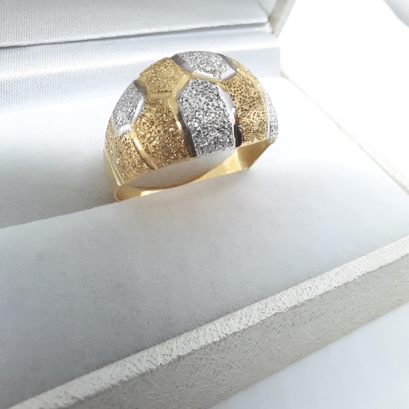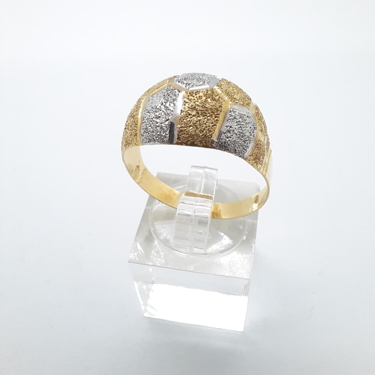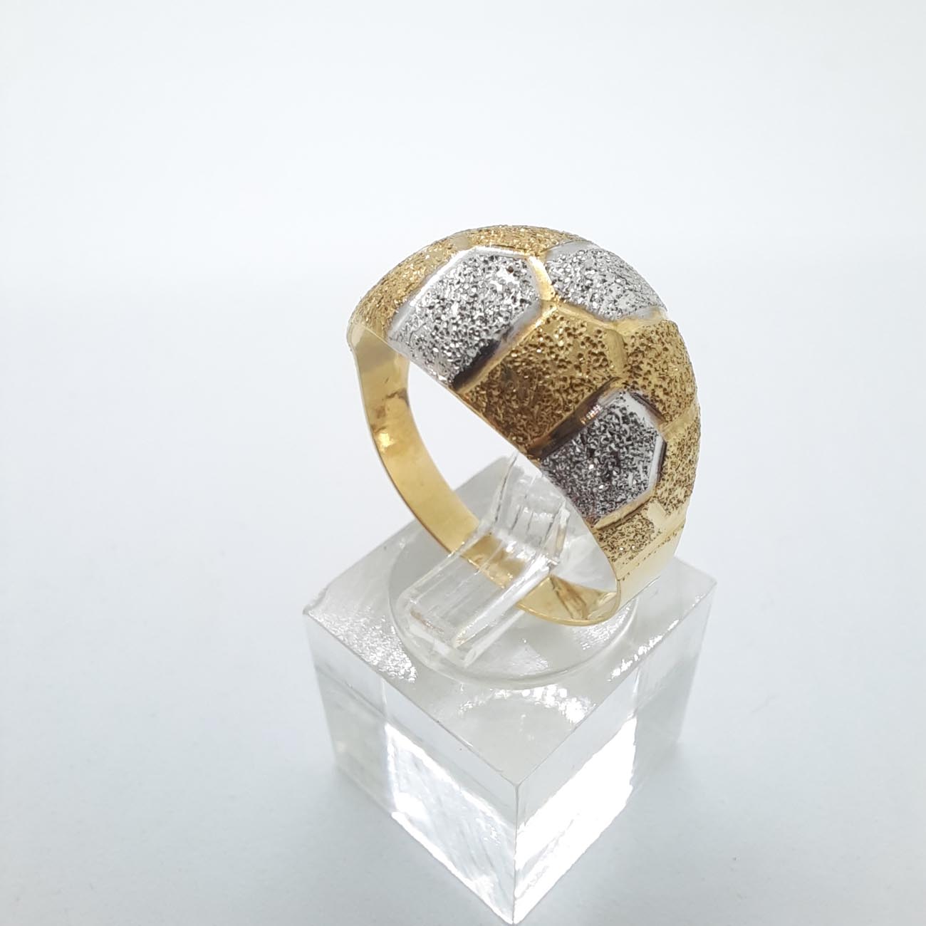 Υπέροχο και πραγματικά βασιλικό δαχτυλίδι με φαρδιά και εντυπωσιακή επιφάνεια, ζαγρέ επεξεργασία και λουστρέ γάμπες , οβάλ design , δίχρωμο, 14 καρατίων.