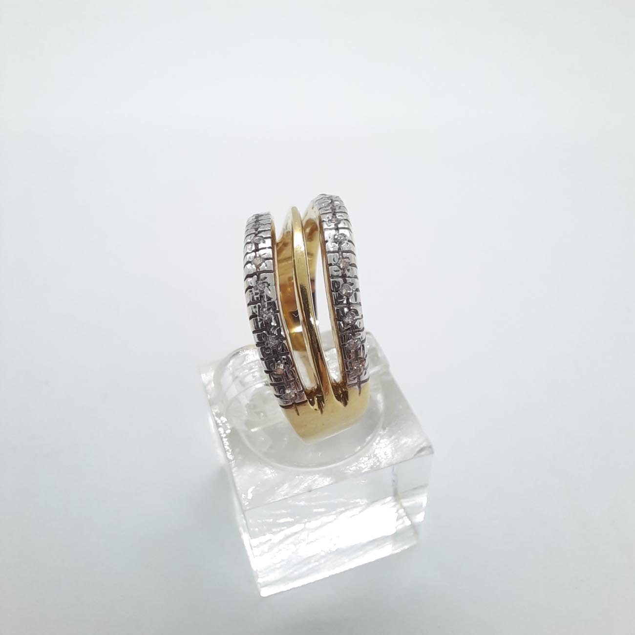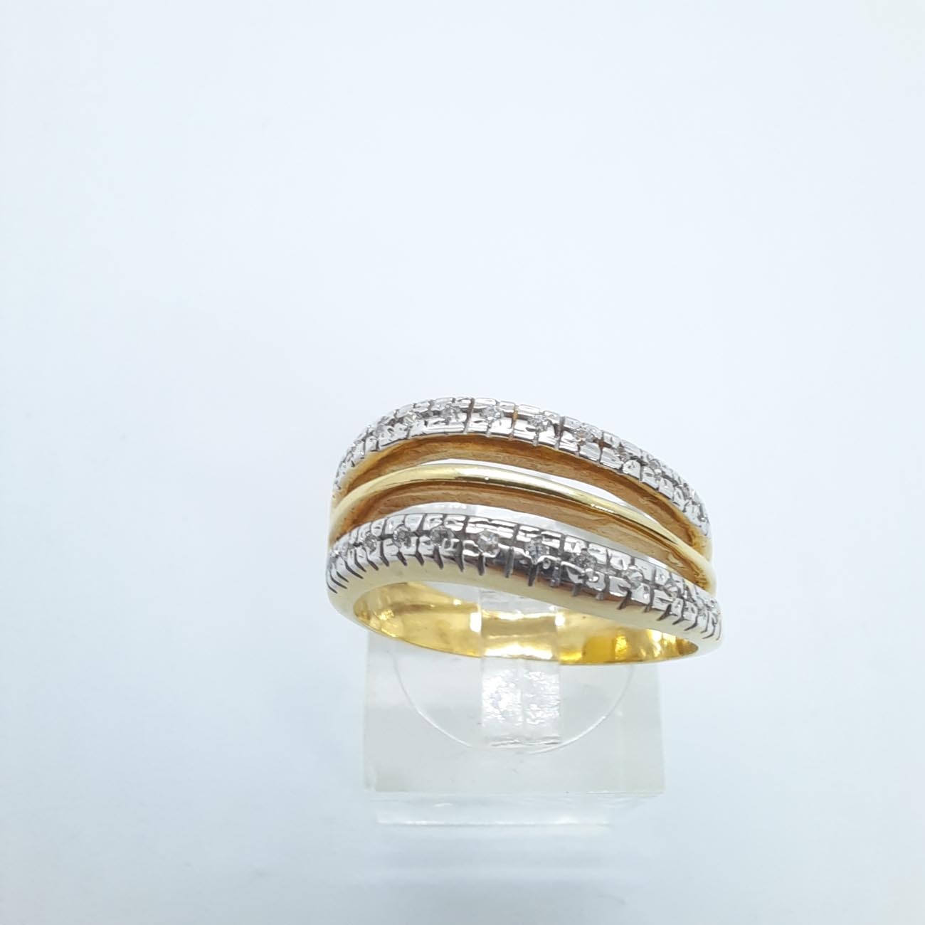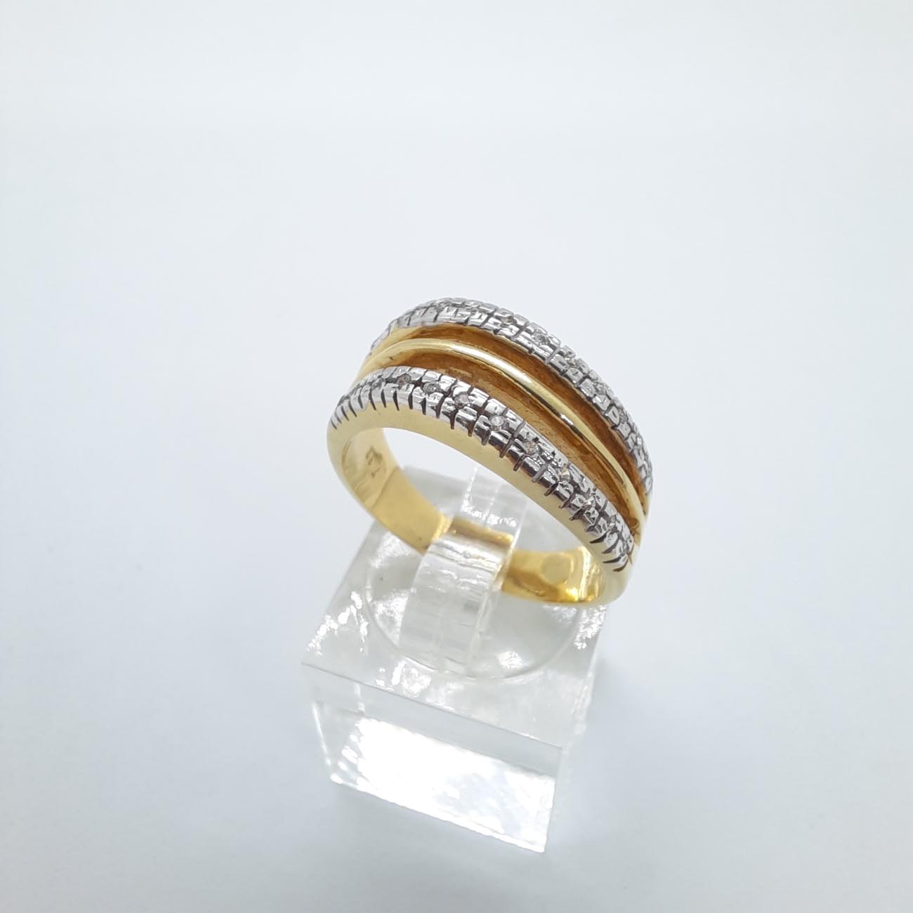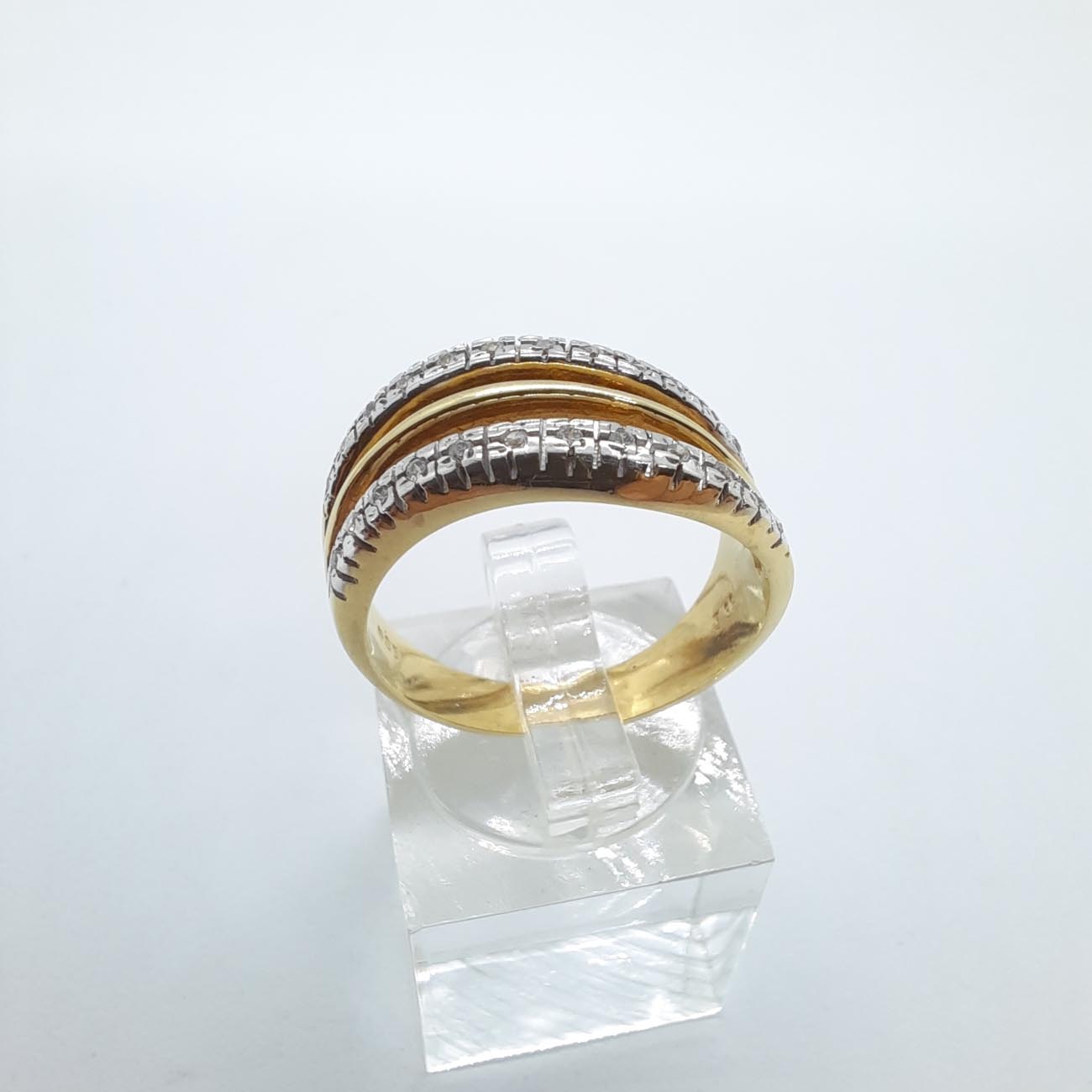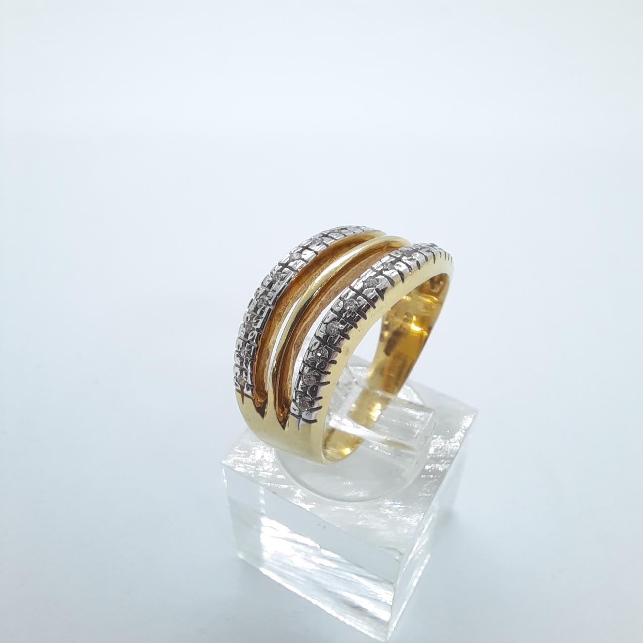 Ένα πολύτιμο κόσμημα, από χρυσό 14 καρατίων, με ένα πολύ γοητευτικό και διαχρονικό design , λουστρέ γάμπες, 2 σειρές ζιργκόν που ανάμεσά τους προβάλλει μια παράλληλη λεπτή φινετσάτη γραμμή από χρυσάφι.