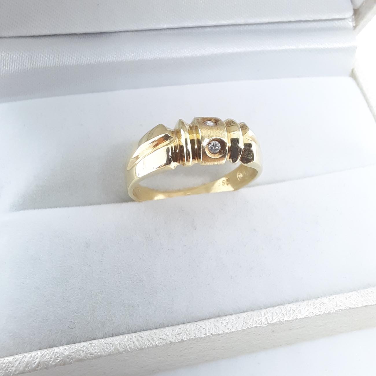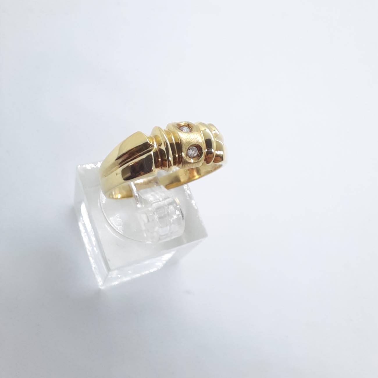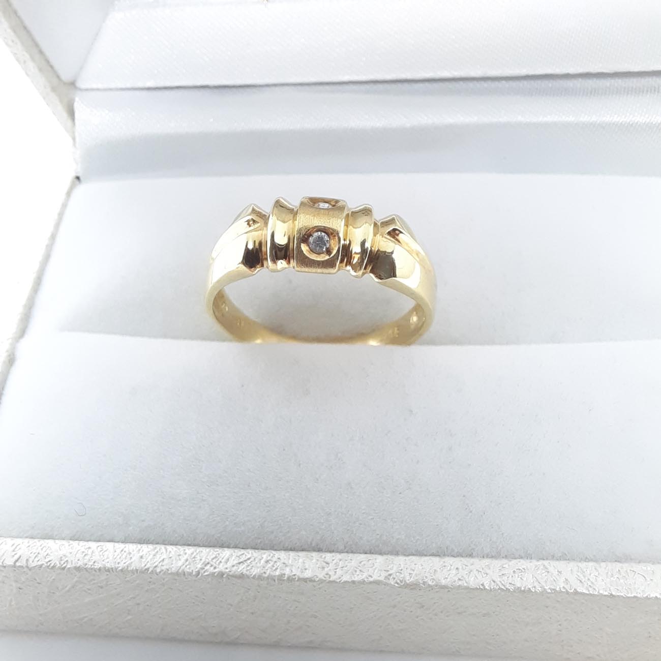 Λιτό και μίνιμαλ design από χρυσό 14 καράτια εμπνευσμένο από ΑΡΧΑΙΑ ΕΛΛΑΔΑ, με λουστρέ πλευρές και ματ μπροστινό καστόνι με 2 μικρά λευκά ζιργκόν, διακριτικό και πολύ κομψό.