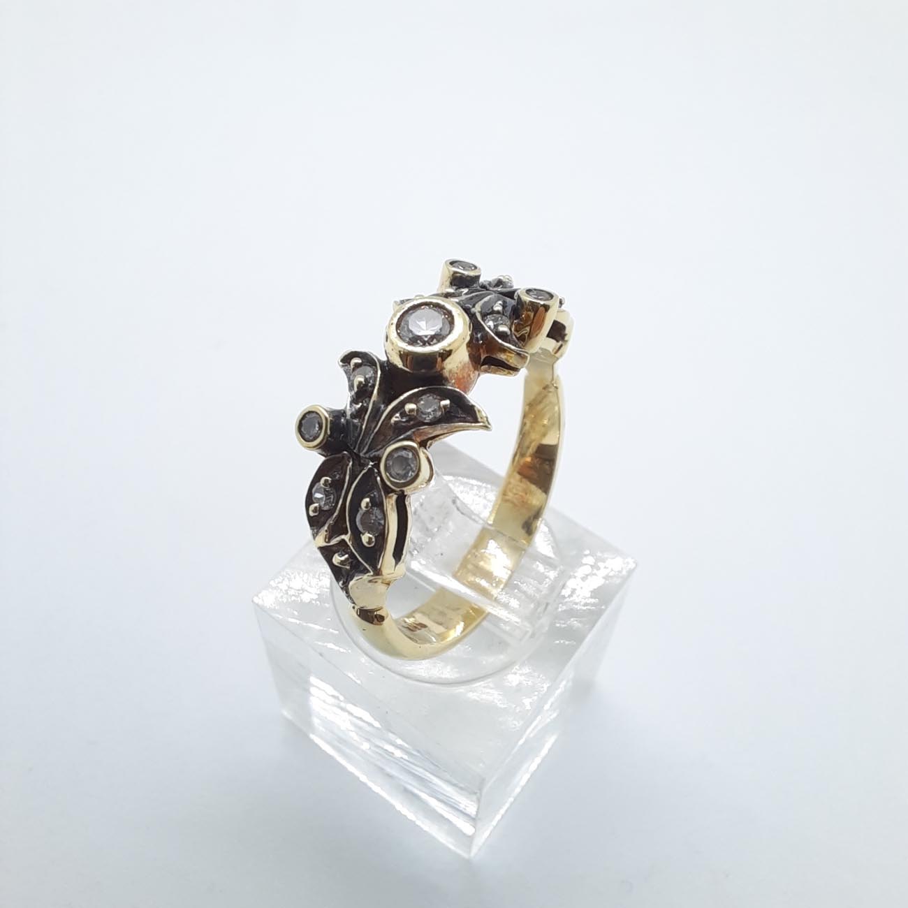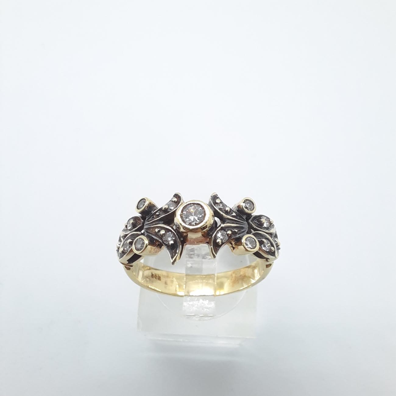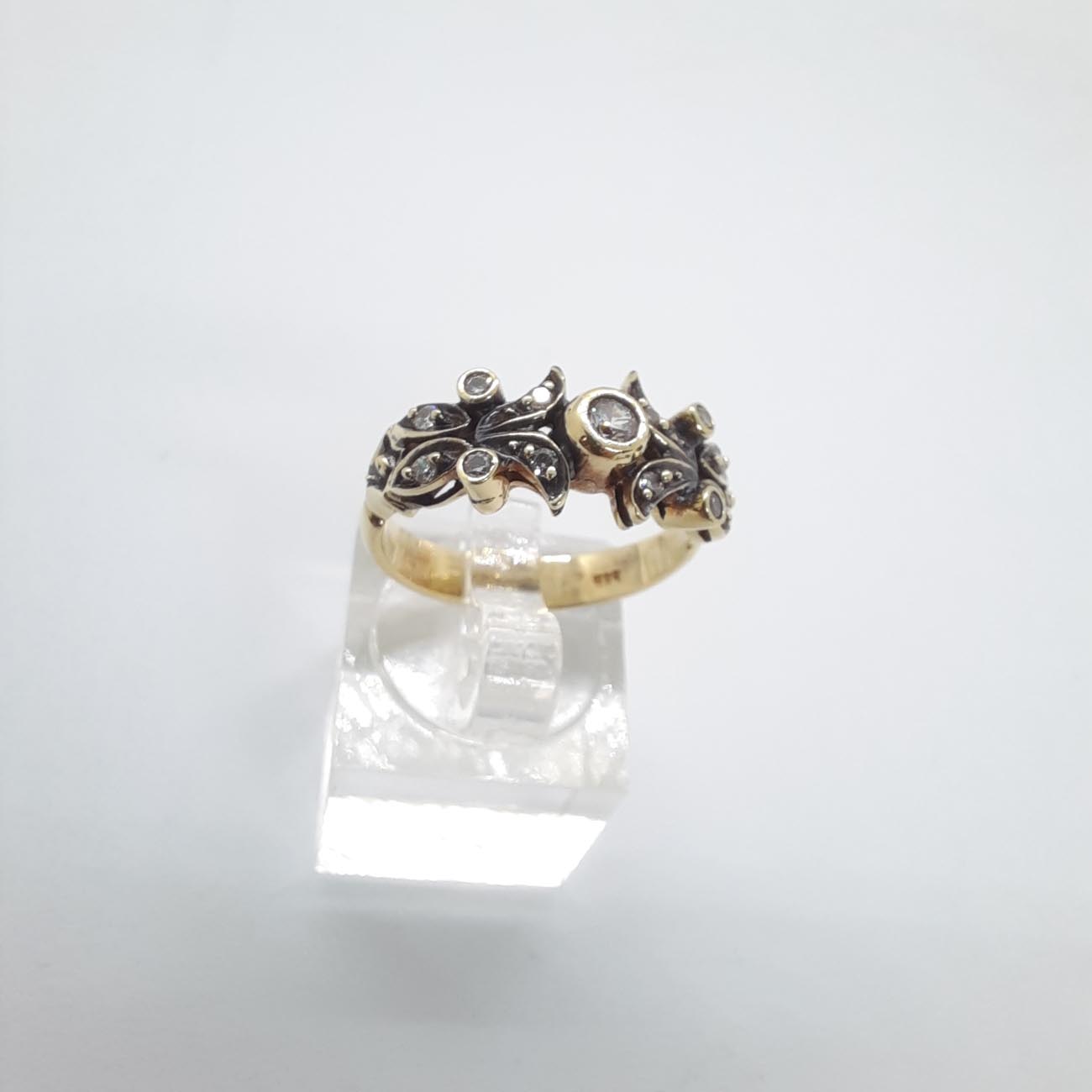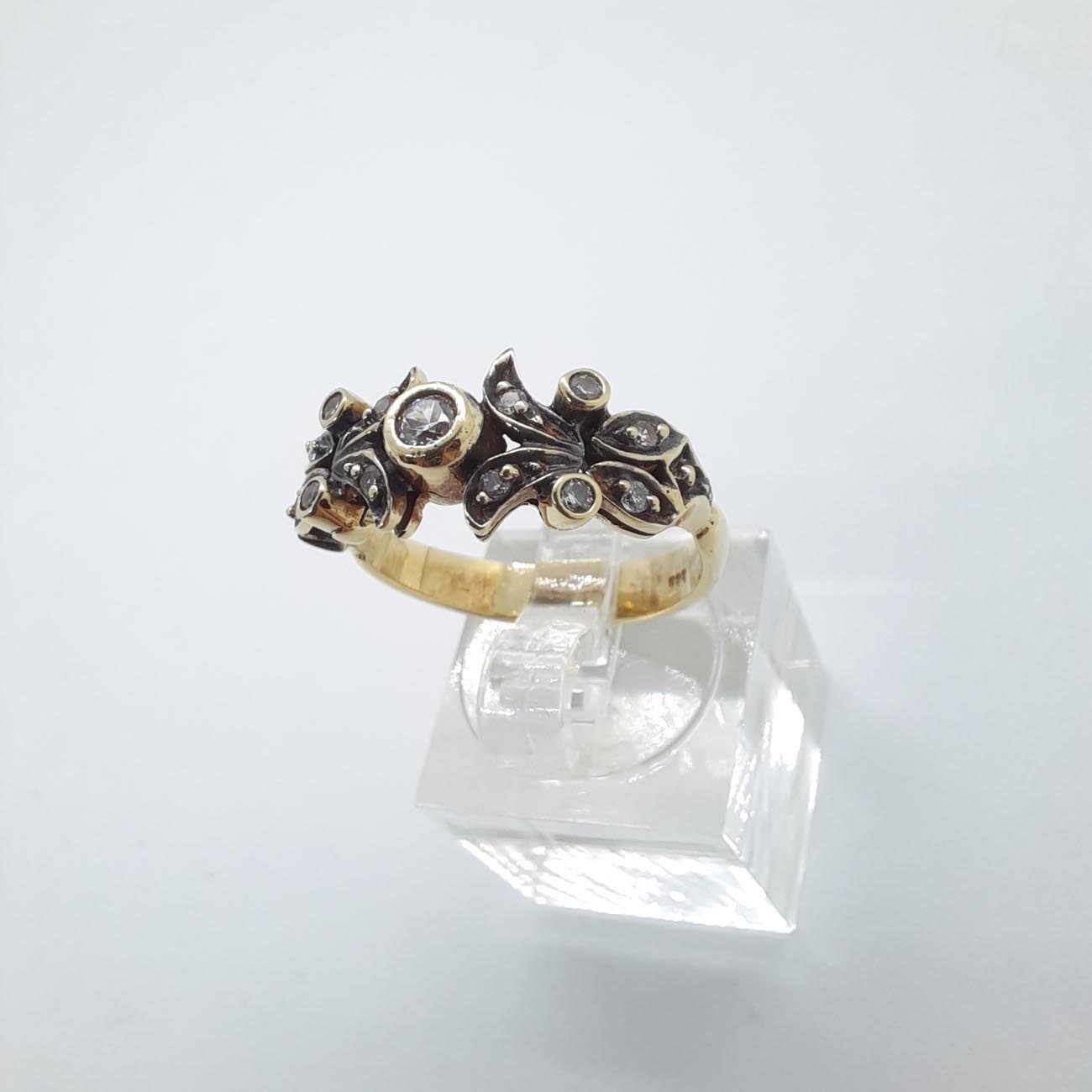Με ένα αστραφτερό λευκό ζιργκόν στο κέντρο, το δαχτυλίδι αυτό σαν βγαλμένο από παραμύθι, πολύτιμο, χρυσό 14 καράτια, με μοναδικό σκάλισμα από φυλλαράκια και κλαδί, με άφθονα μικρά ζιργκόν, θυμίζει στέμμα νεράιδας, ρομαντικό και τρυφερό δώρο αγάπης.