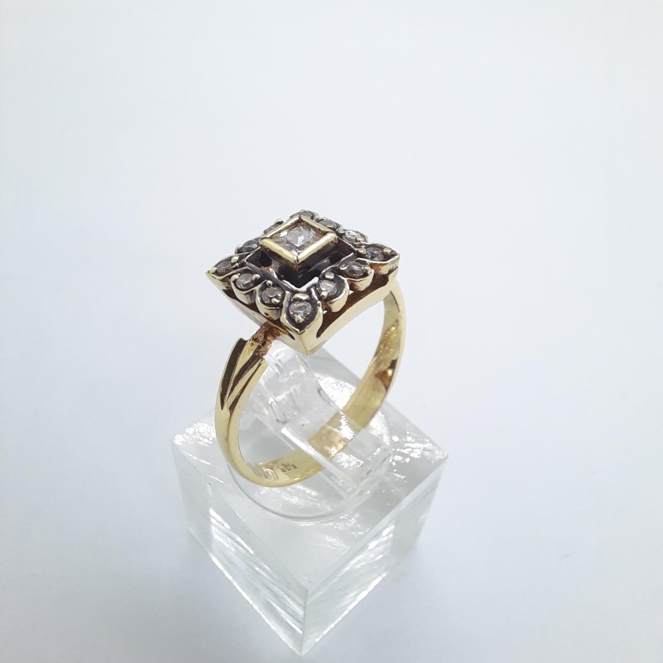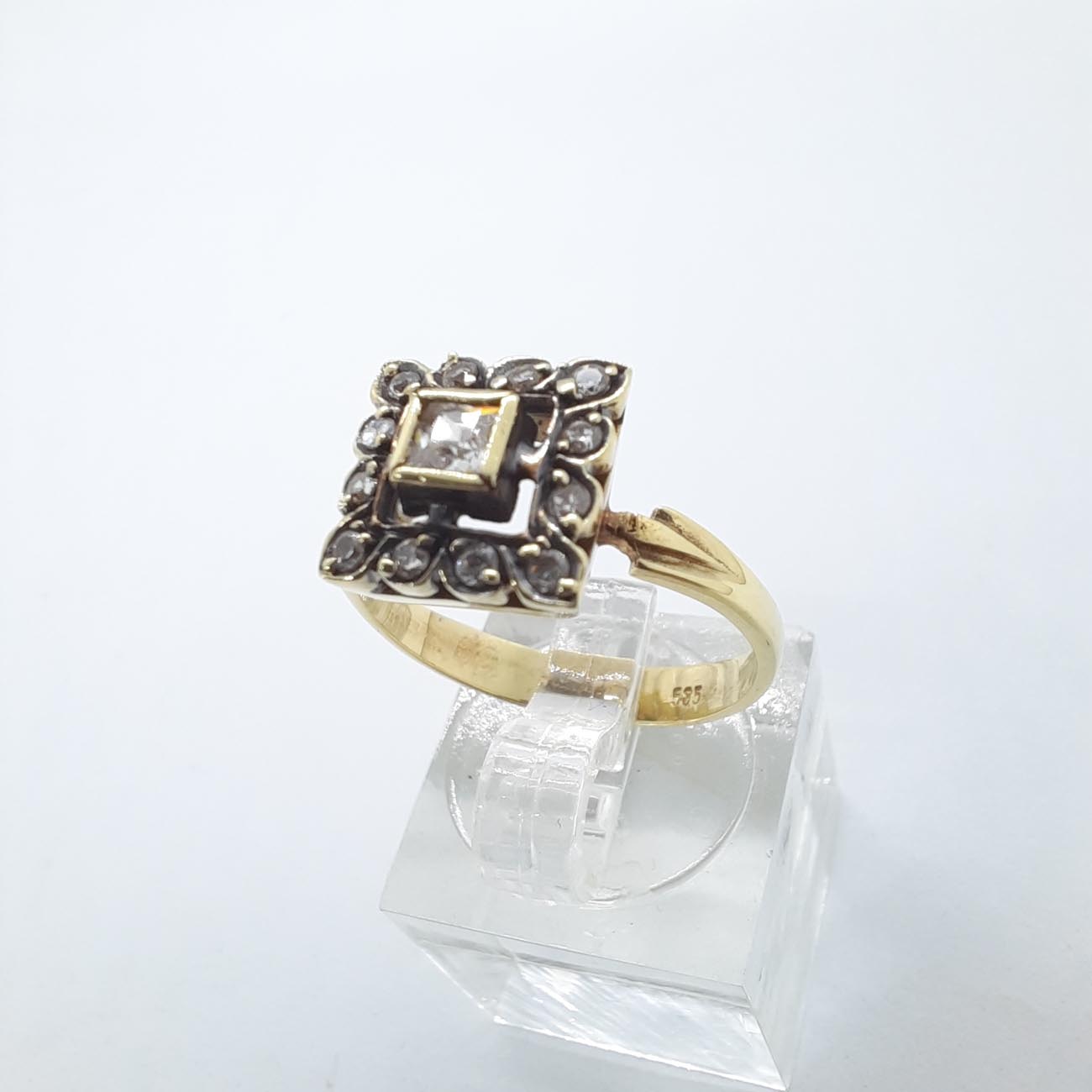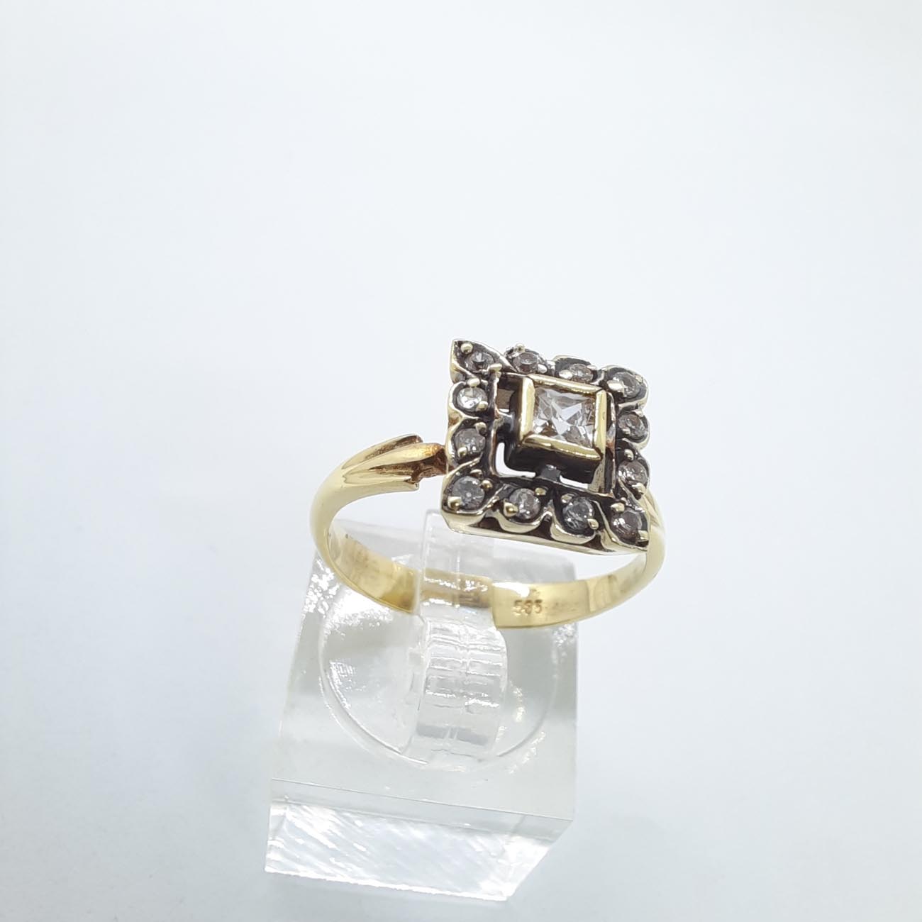 Για μια ρομαντική λαίδη που αγαπά την κλασική ομορφιά, πανέμορφο χρυσό δαχτυλίδι, με λεπτή φινετσάτη γάμπα, μεγάλο κεντρικό λευκό ζιργκόν σε τετράγωνο καστόνι , αγκαλιασμένο από 12 μικρότερα λευκά ζιργκόν, ιδανικό για αρραβώνα ή επέτειο.