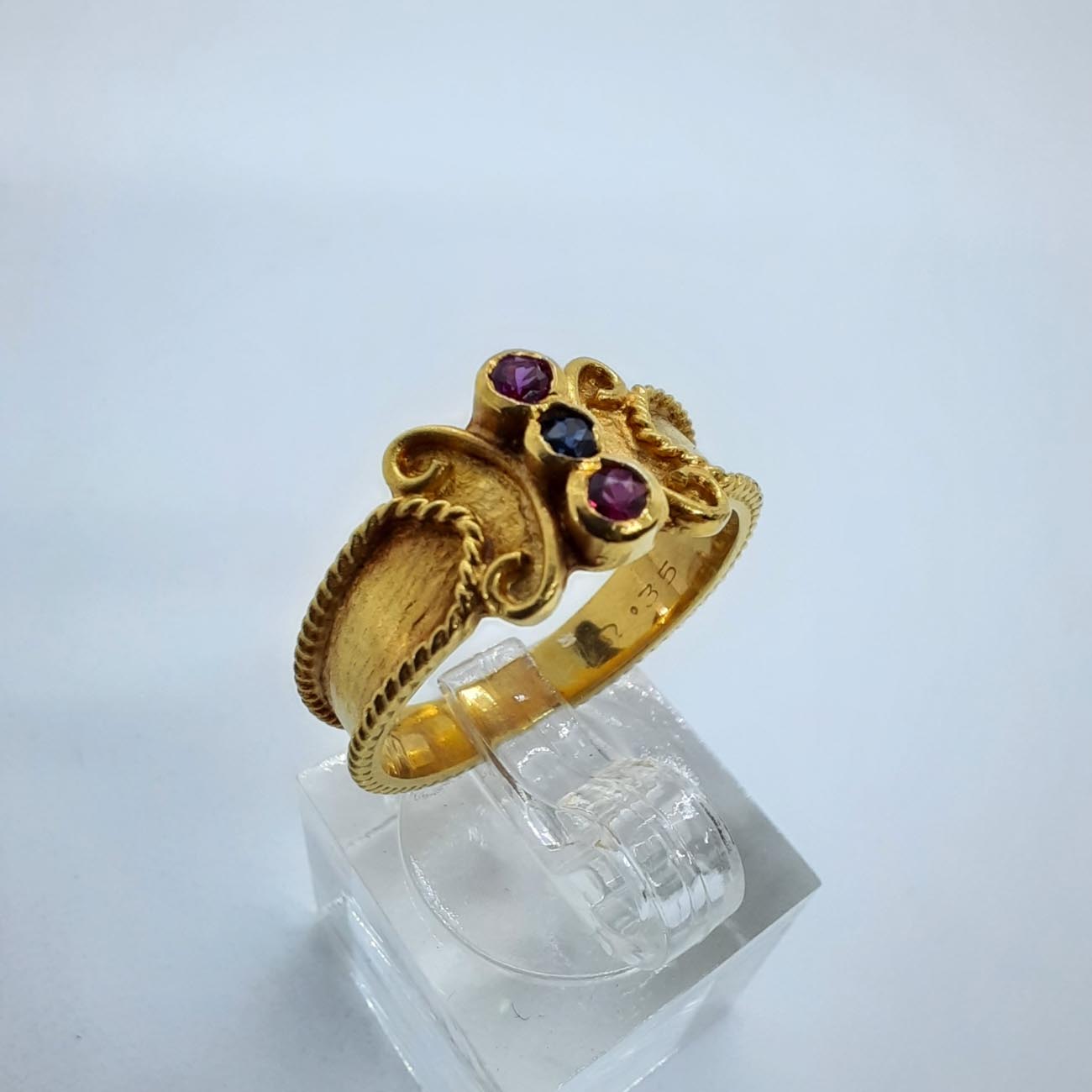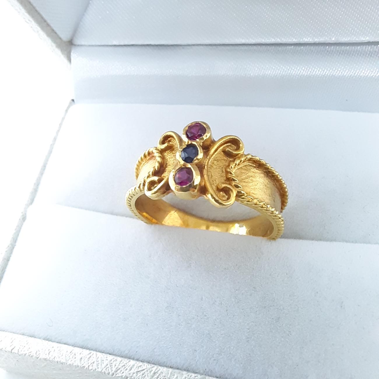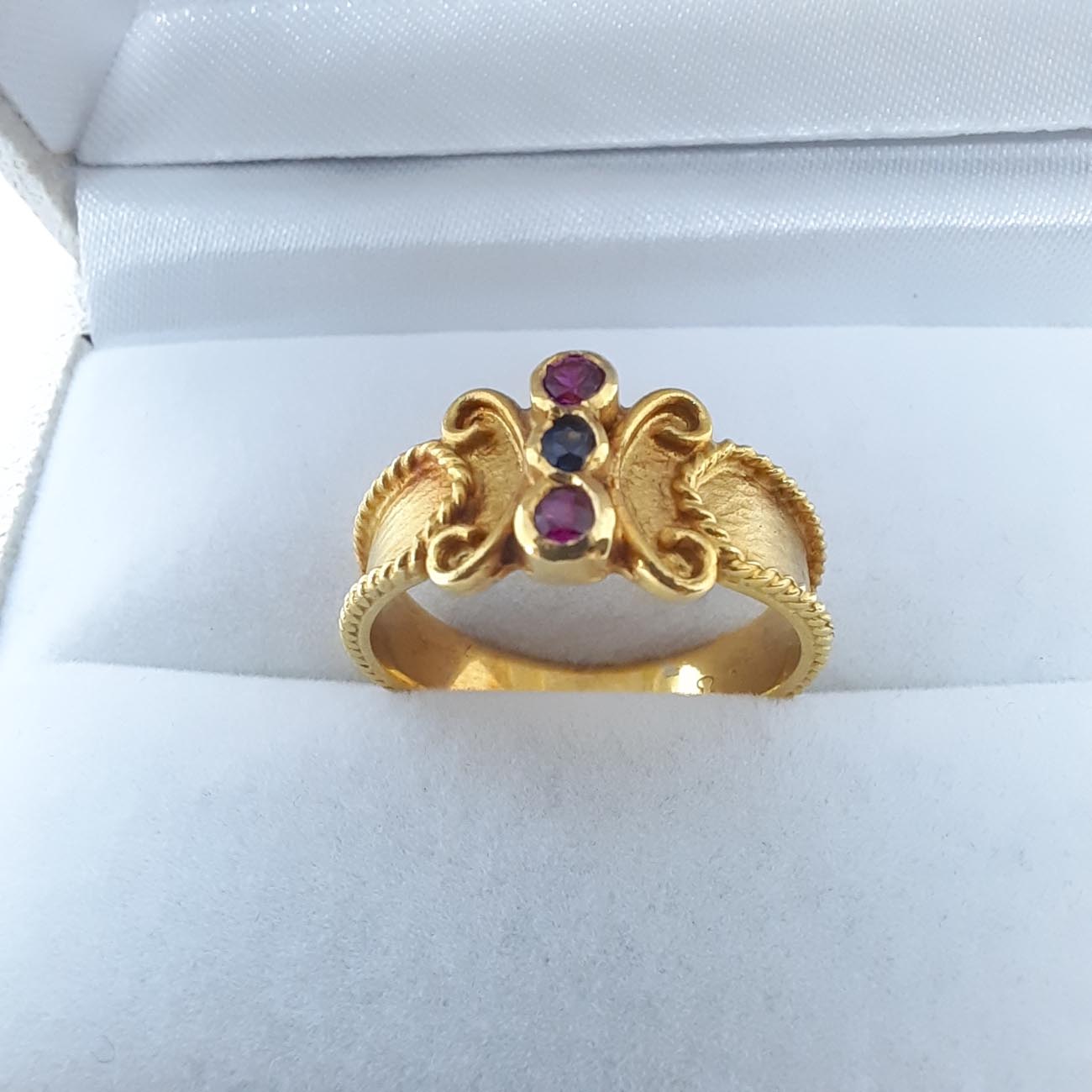 Υπέροχο δαχτυλίδι με έμπνευση απο την Αρχαία Ελλάδα, σε ματ επεξεργασία, με σχέδιο πεταλούδα στο κέντρο, πολύτιμα ρουμπίνια και διακριτικό σκάλισμα.