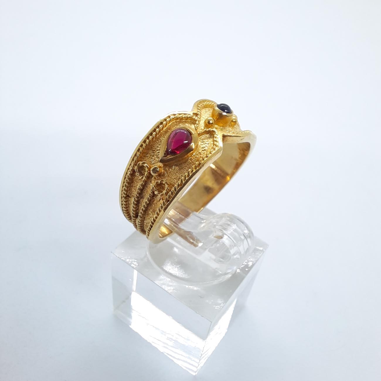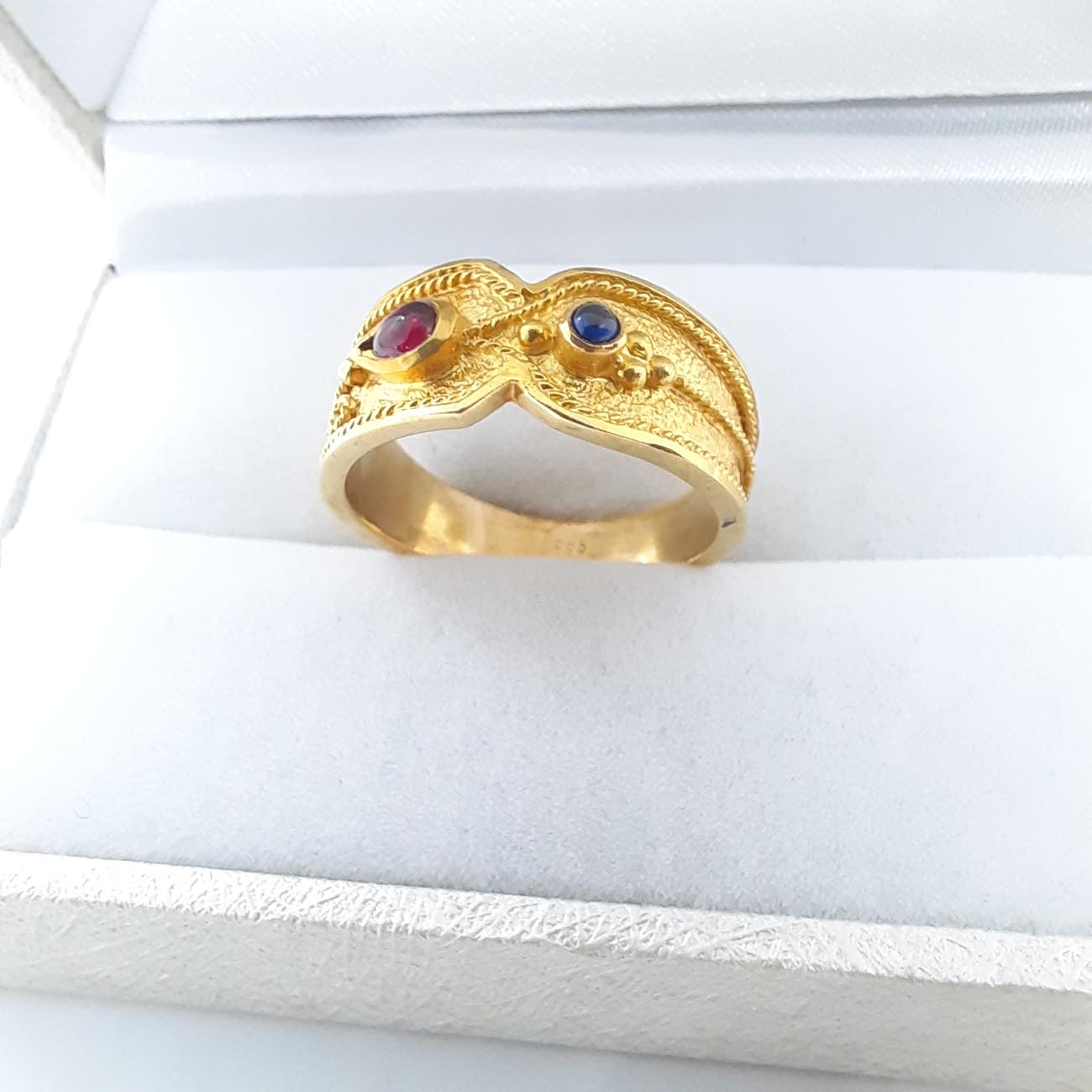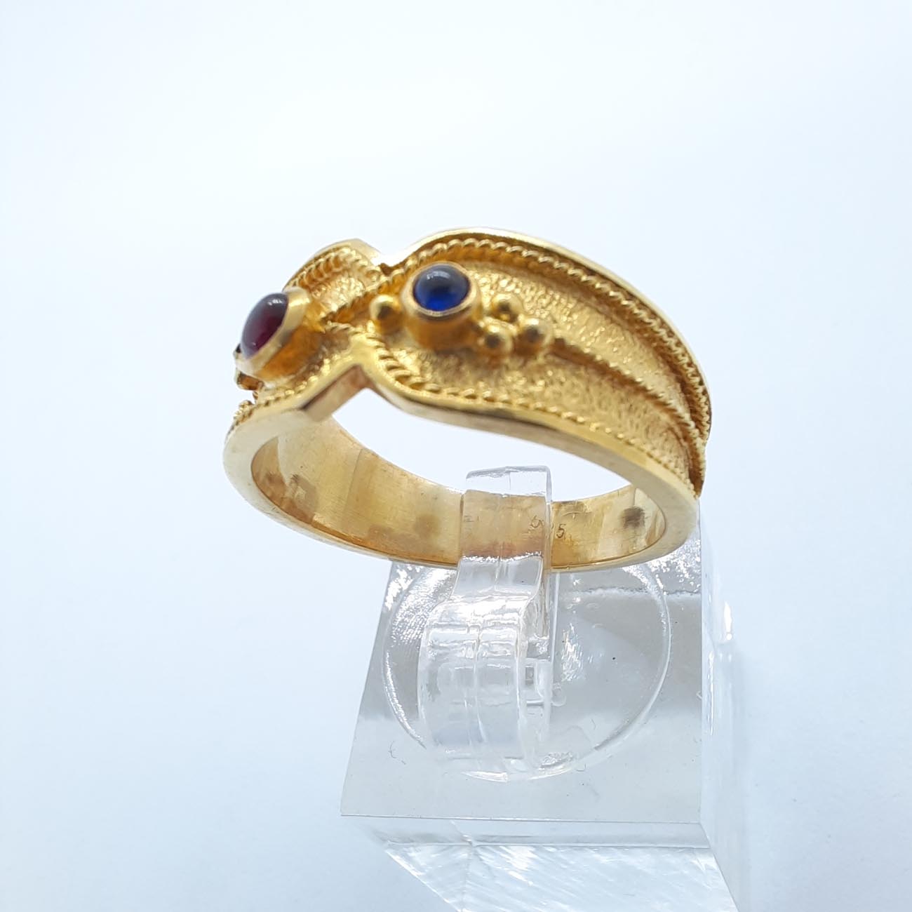Υπέροχο δαχτυλίδι, πολύτιμο και αρχοντικό, εμπνευσμένο από την Αρχαία Ελλάδα, από χρυσό 14 καρατίων, με λεπτομερές σκάλισμα σε ολόκληρη την επιφάνεια, φαρδιά γάμπα και πολύτιμους λίθους ρουμπίνι και ζαφείρι στο κέντρο.