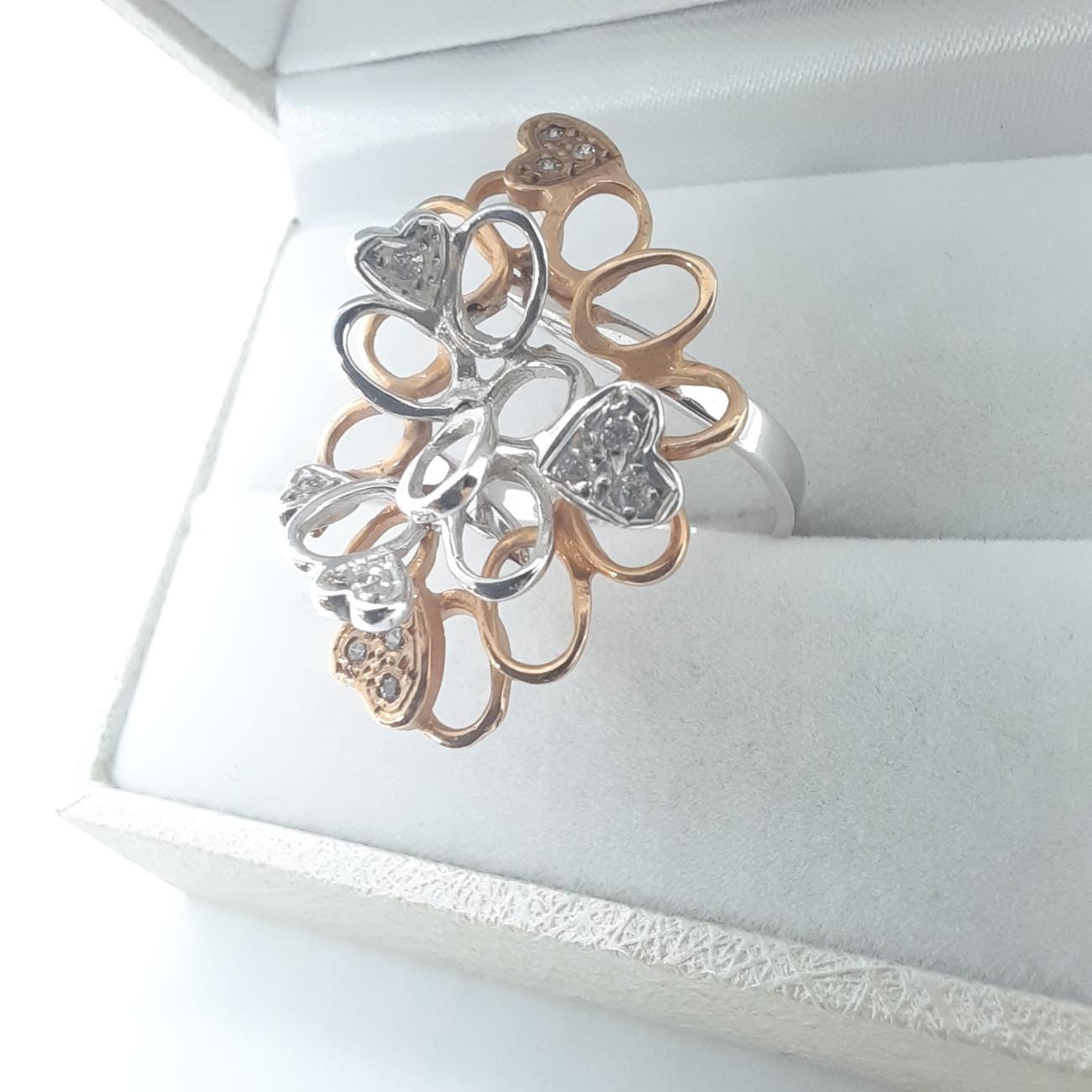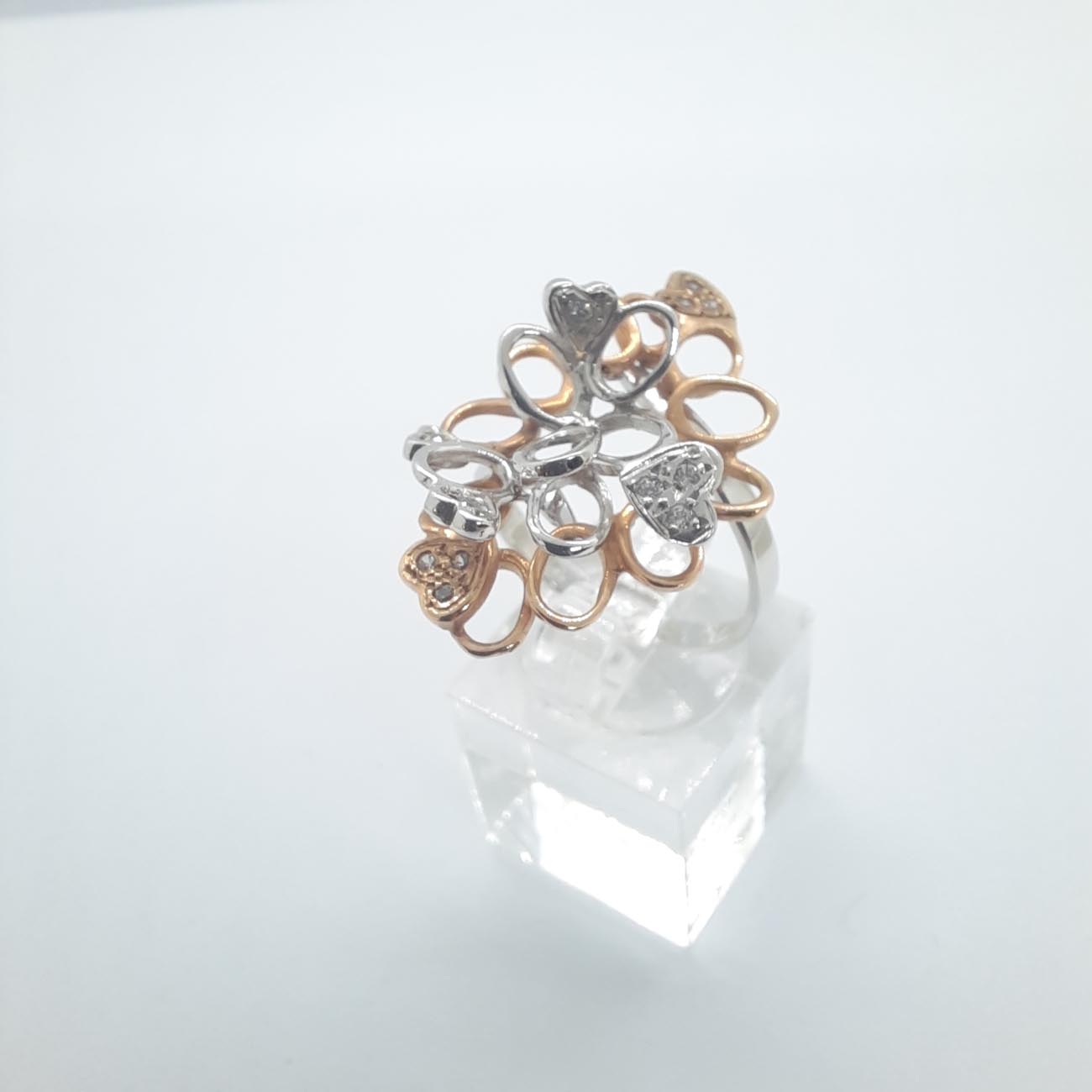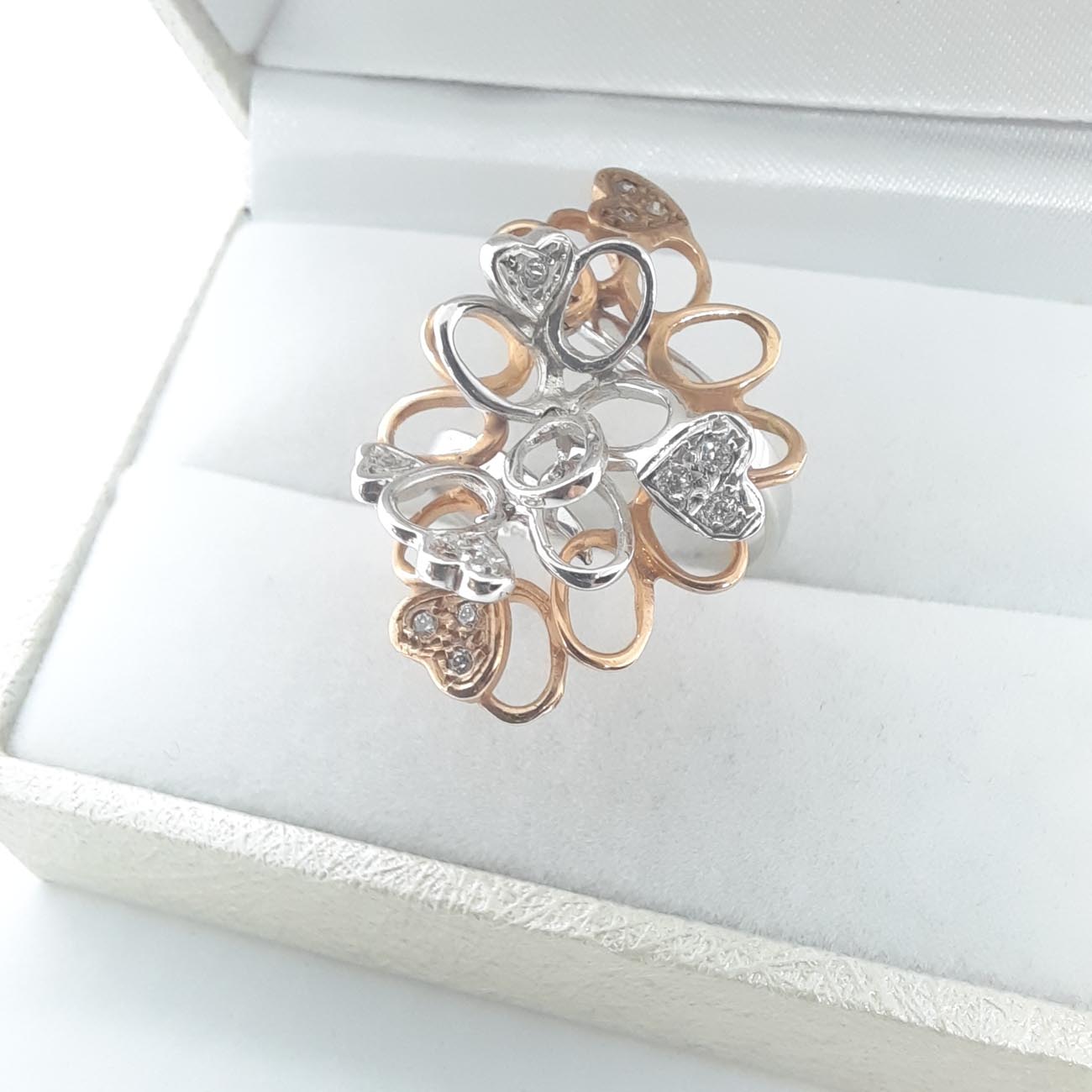 Ένα από τα πιο φαντασμαγορικά δαχτυλίδια στα χέρια σας! Με ιδιαίτερο design, ένας περίτεχνος συνδυασμός λευκού και ροζ χρυσού , 14 καρατίων, με διακριτικά λευκά ζιργκόν και 6 καρδιές, μεγάλο και εντυπωσιακό μέγεθος, ένα πολύτιμο κόσμημα, η απόλυτη εκδήλωση αγάπης για μια ξεχωριστή γυναίκα.