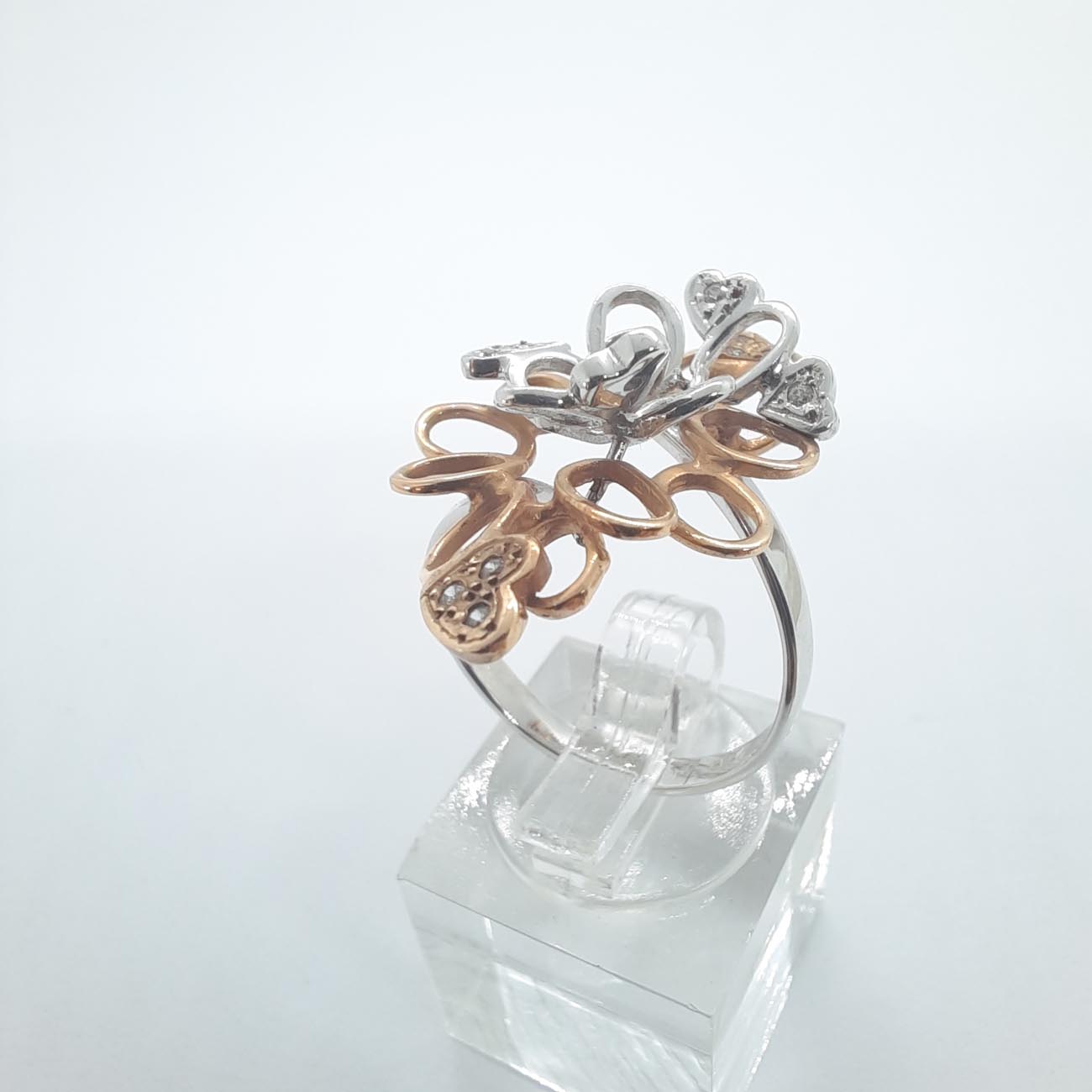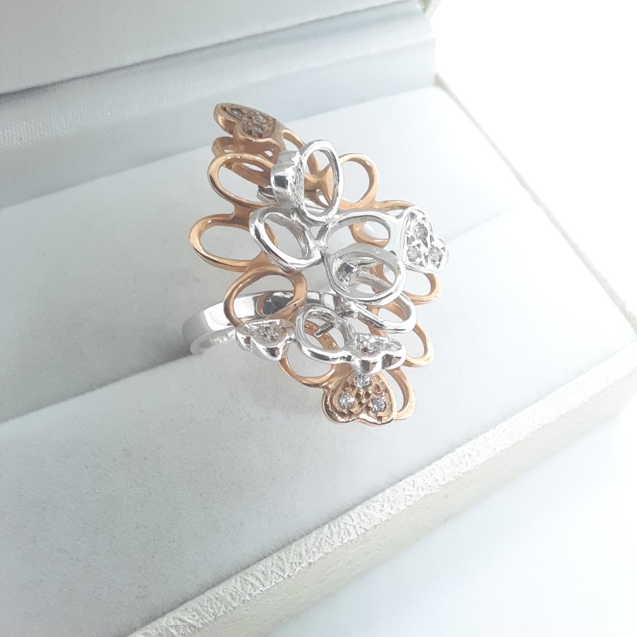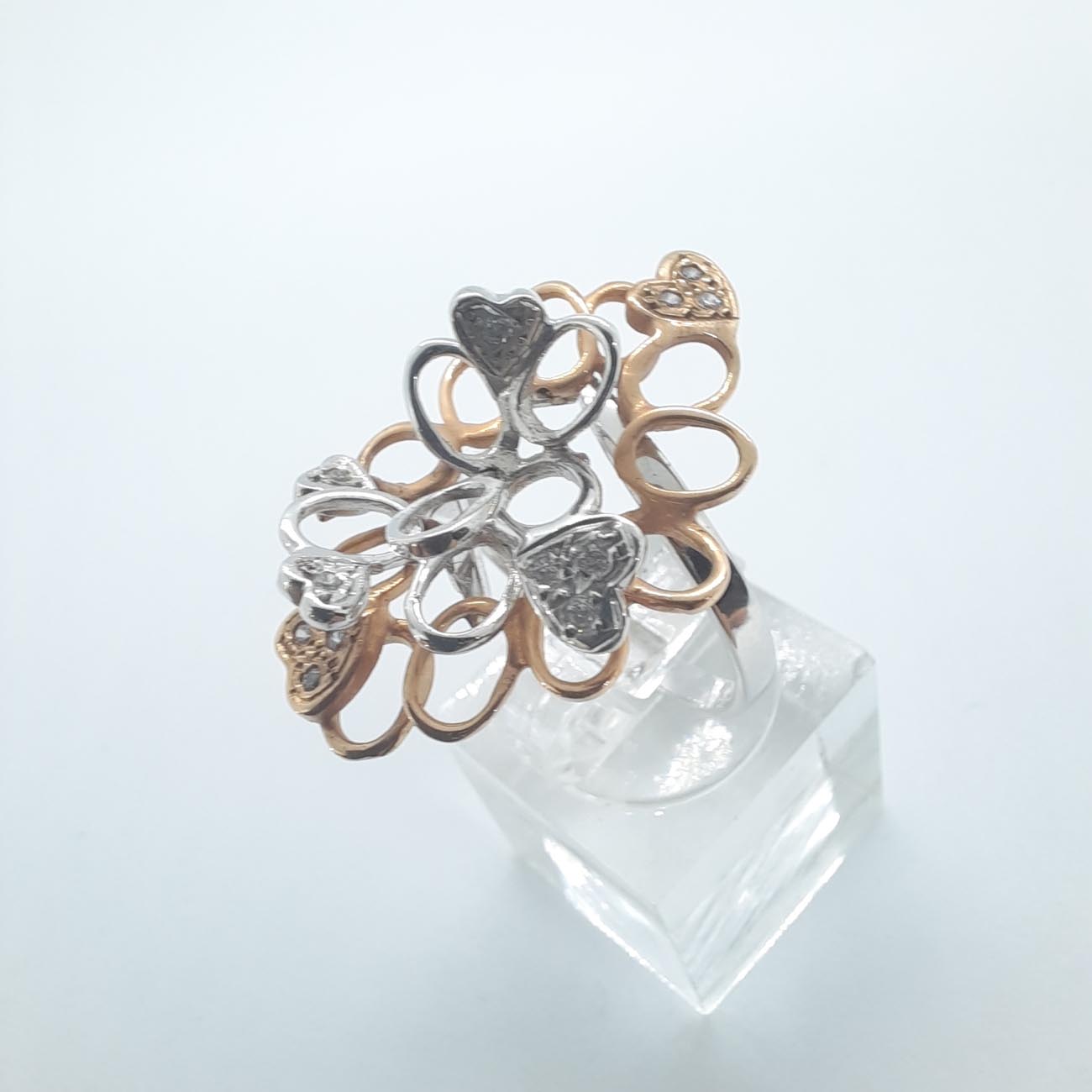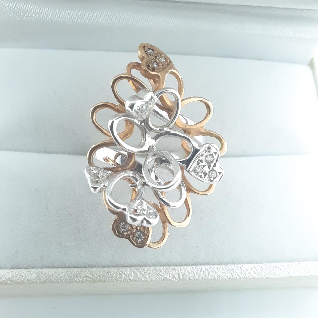 Ένα από τα πιο φαντασμαγορικά δαχτυλίδια στα χέρια σας! Με ιδιαίτερο design, ένας περίτεχνος συνδυασμός λευκού και ροζ χρυσού , 14 καρατίων, με διακριτικά λευκά ζιργκόν και 6 καρδιές, μεγάλο και εντυπωσιακό μέγεθος, ένα πολύτιμο κόσμημα, η απόλυτη εκδήλωση αγάπης για μια ξεχωριστή γυναίκα.