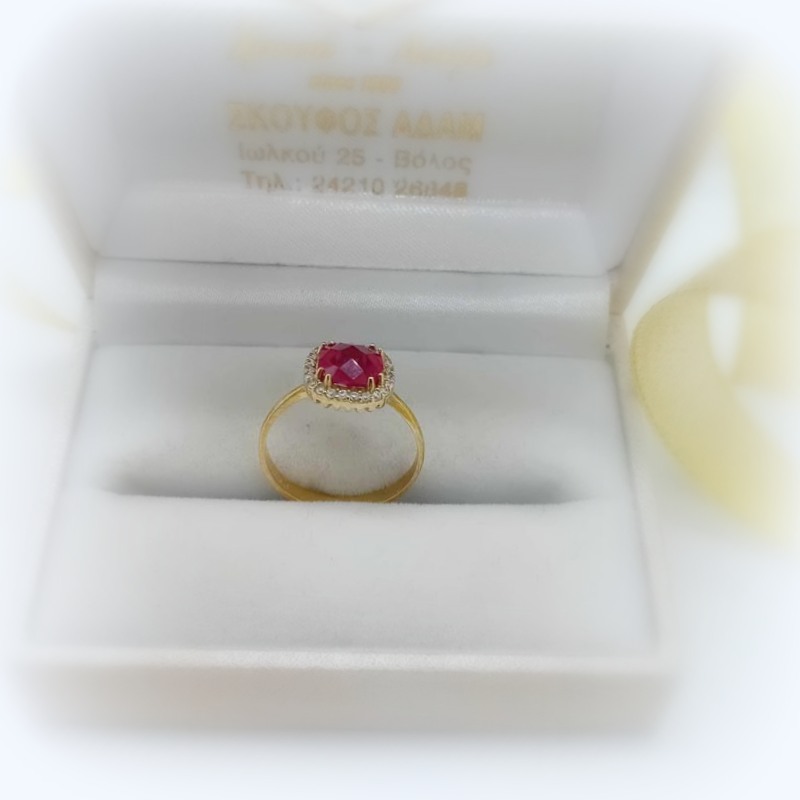 Κόκκινο το χρώμα της αγάπης! Ένα εκτυφλωτικό κόσμημα , δαχτυλίδι μονόπετρο, με όμορφη γάμπα που ξεκινάει λεπτή και φαρδαίνει σταδιακά, από χρυσό Κ9, με ένα πελώριο κεντρικό ζιργκόν σε τετράγωνο υπερυψωμένο καστόνι, περιστοιχισμένο από μικρά λευκά ζιργκονάκια !