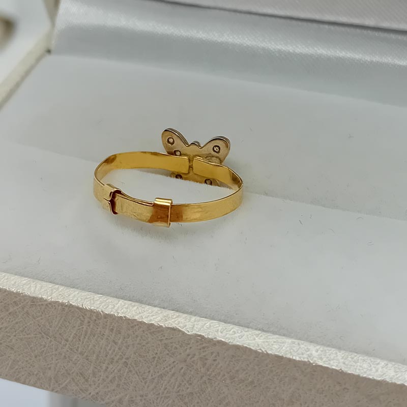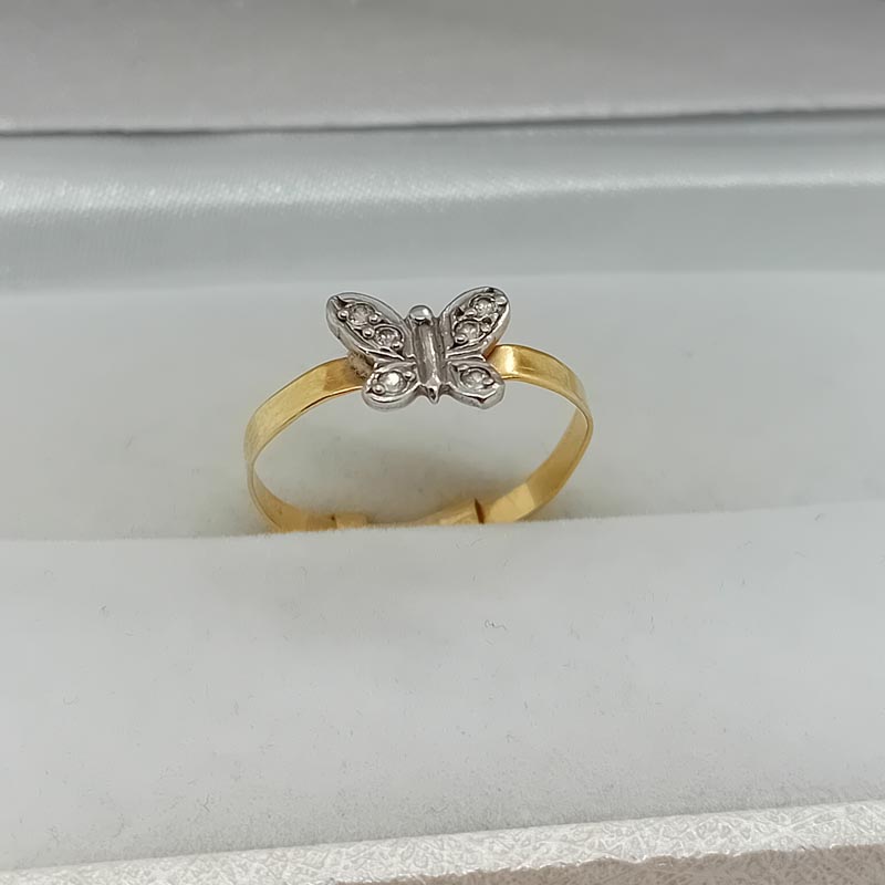 Χρυσό 14 καρατίων δαχτυλίδι παιδικό-νεανικό με πεταλούδα στολισμένη με λευκά ζιργκόν και αυξομειούμενη γάμπα.