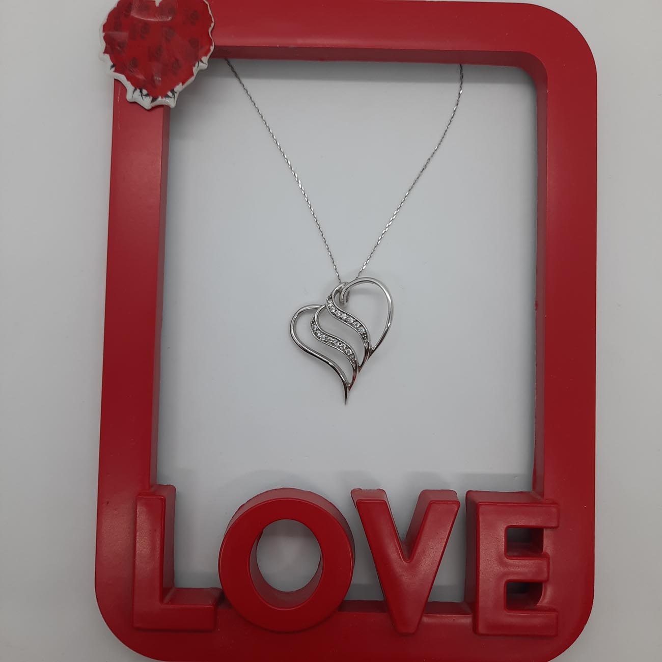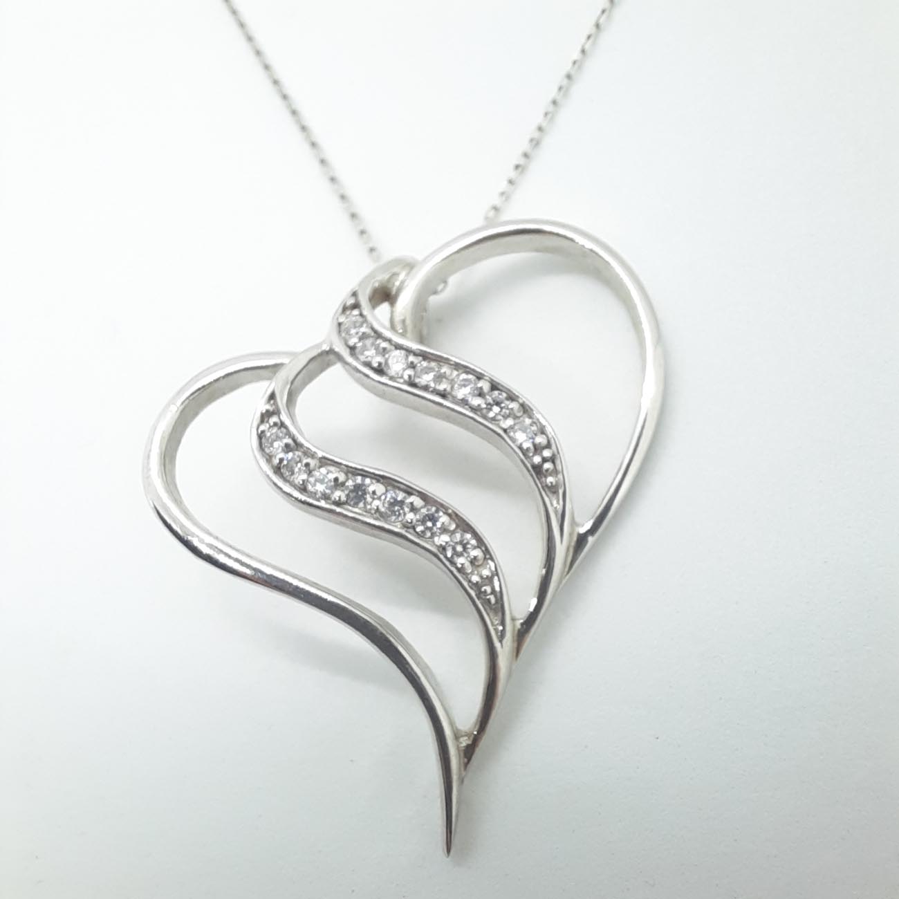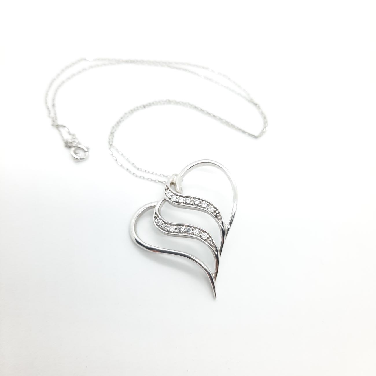 Μια υπέροχη καρδιά σε εντυπωσιακό μέγεθος, από επιπλατινωμένο ασήμι 9.25, σε μοντέρνο γραμμικό design, λουστρέ θηλυκές καμπύλες και δύο σειρές λευκά ζιργκόν. Ιδανικό δώρο έρωτα το κολιέ με την καρδιά, βρίσκεται ανάμεσα στις πρώτες προτιμήσεις για την γιορτή του Αγίου Βαλεντίνου!