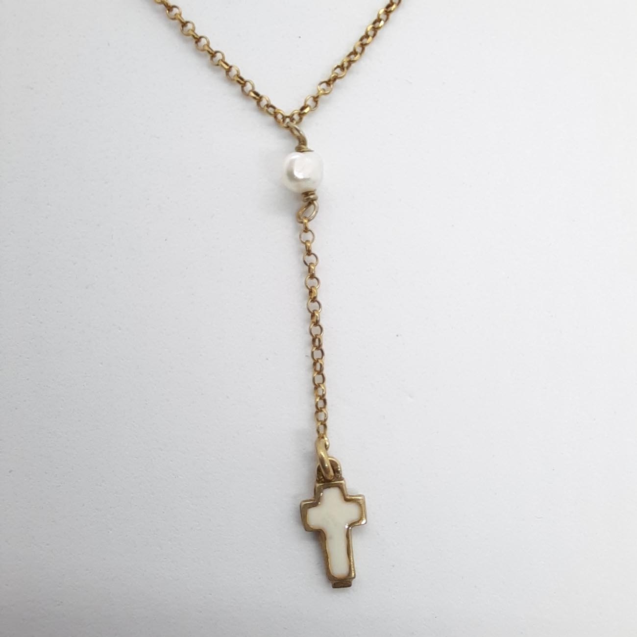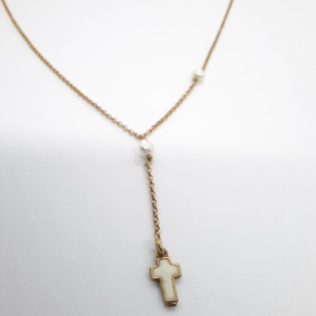 Πολύ ιδιαίτερος σταυρός από επιχρυσωμένο ασήμι με λευκό σμάλτο και 2 πέρλες, ένα κολιέ για την κομψή φινετσάτη γυναίκα που αγαπάμε !