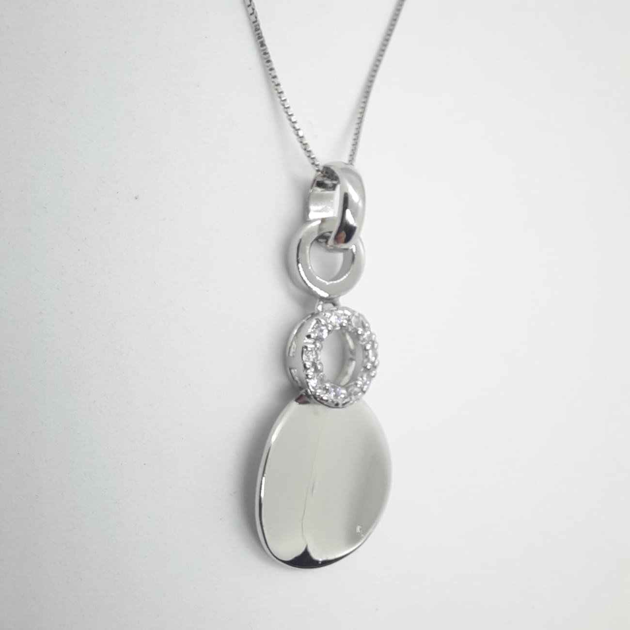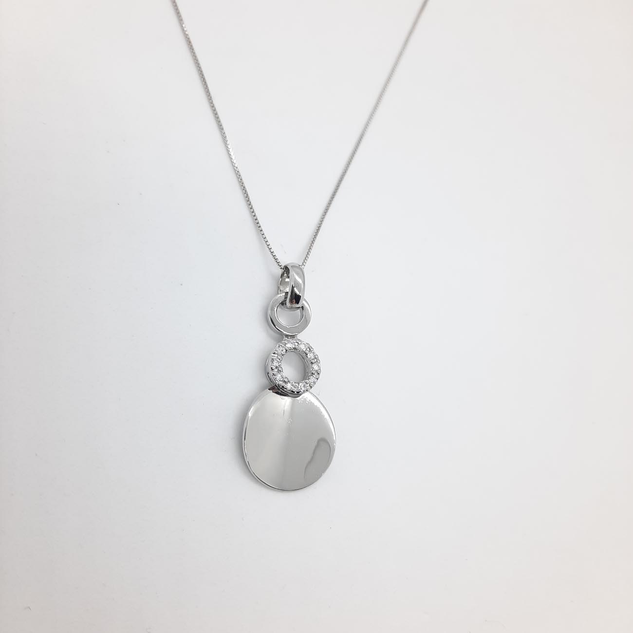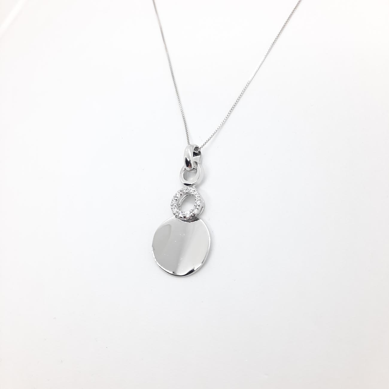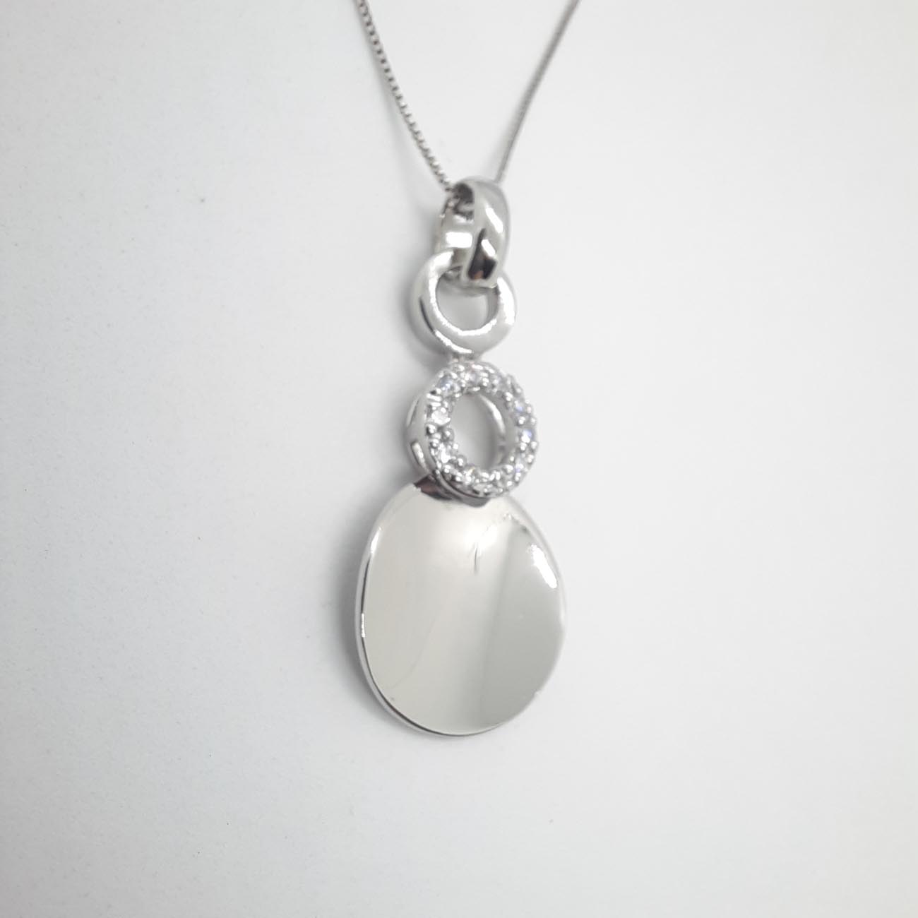 Ένα εκπληκτικό design κολιέ από ασήμι με έμπνευση από το πιο αγαπημένο αντικείμενο κάθε γυναίκας, τον καθρέφτη της! Μεγάλος δίσκος λουστρέ όψης ελαφρώς καμπυλωτός και στρογγυλός μικρότερος κρίκος με λαμπερά λευκά ζιργκόν και δύο λουστρέ κρικάκια για την αλυσίδα του.