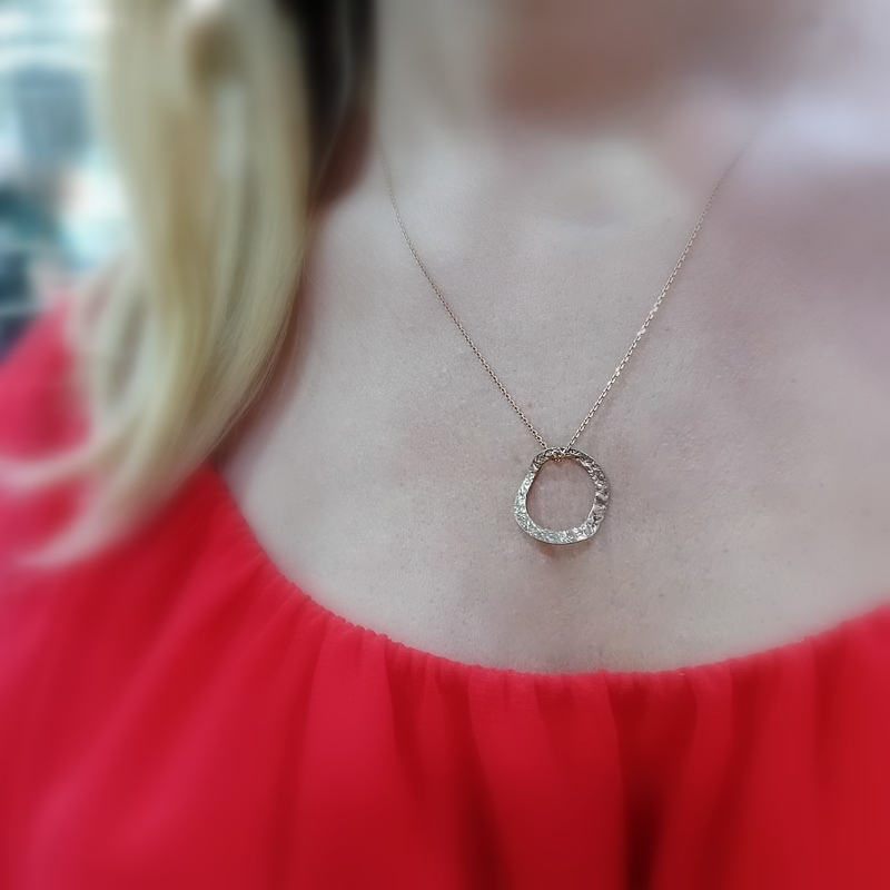 Κύκλος σφυρήλατος , με ελαφριά καμπύλη, από επιχρυσωμένο ασήμι, περασμένος σε λεπτή αλυσίδα. Ένα πολύ καλλιτεχνικό design για την σύγχρονη γυναίκα.