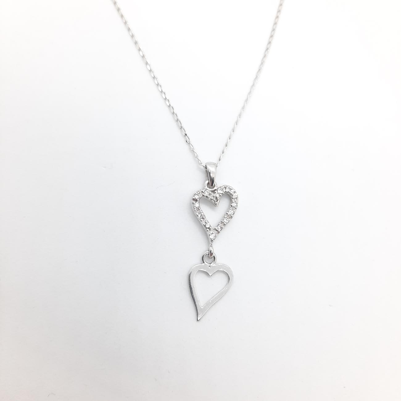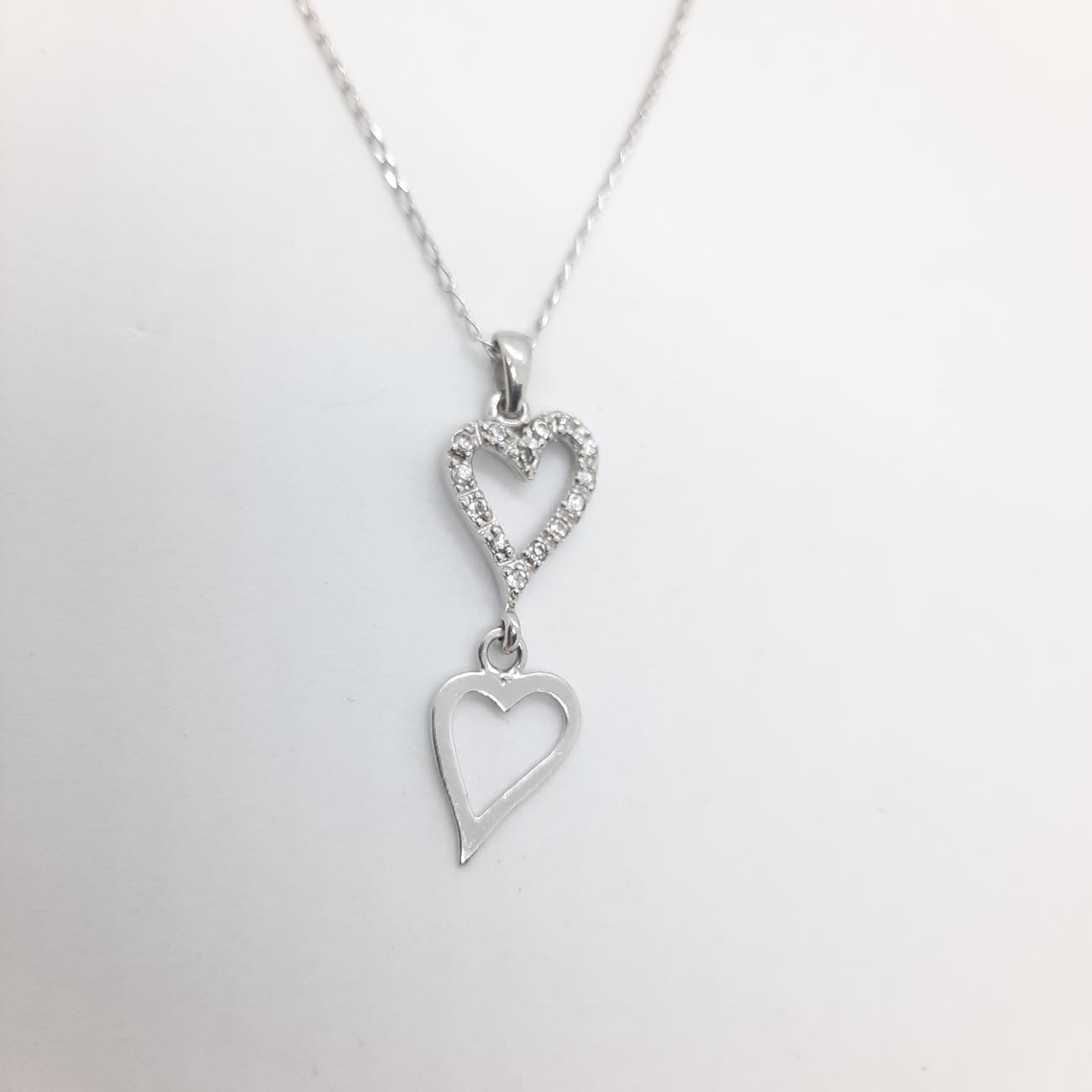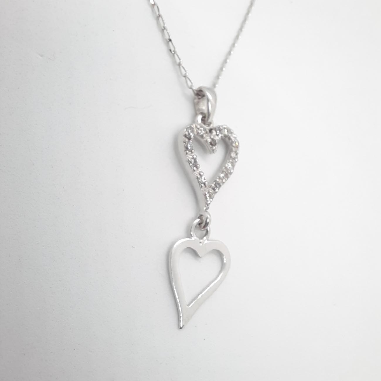 Ένα υπέροχο κολιέ από ασήμι, ιδανικό για την γιορτή του Αγίου Βαλεντίνου και όχι μόνο!!! Δύο καρδιές που η μια συγκρατεί την άλλη, η επάνω καρδιά με λευκά διακριτικά ζιργκόν και η κάτω καρδιά λουστρέ επιφάνεια.