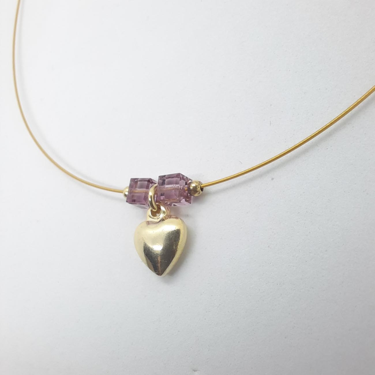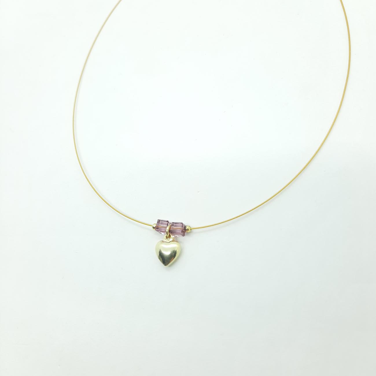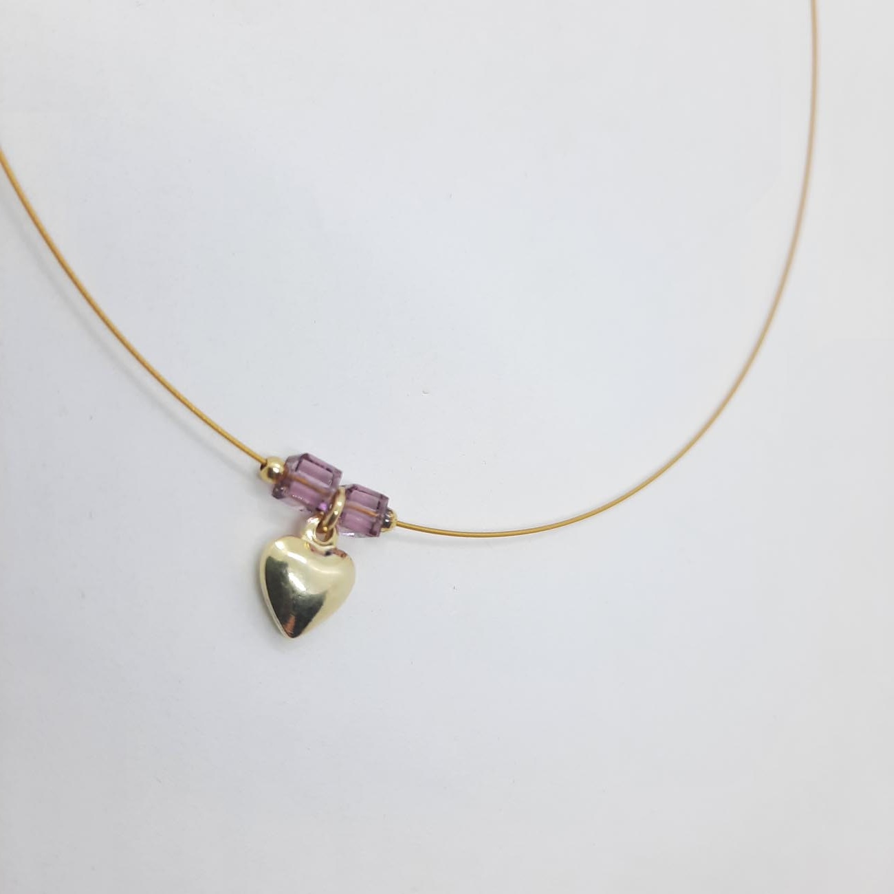 Κολιέ με ατσαλόσυρμα, με επίχρυση ασημένια καρδιά και δύο μικρά διαφανή κυβάκια σε λιλά απόχρωση.