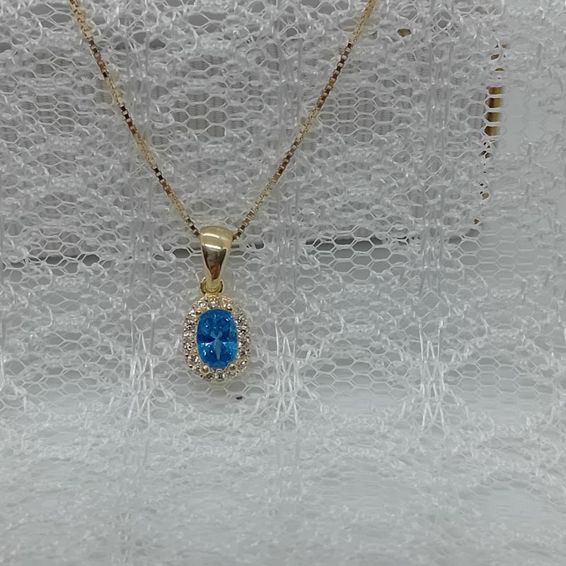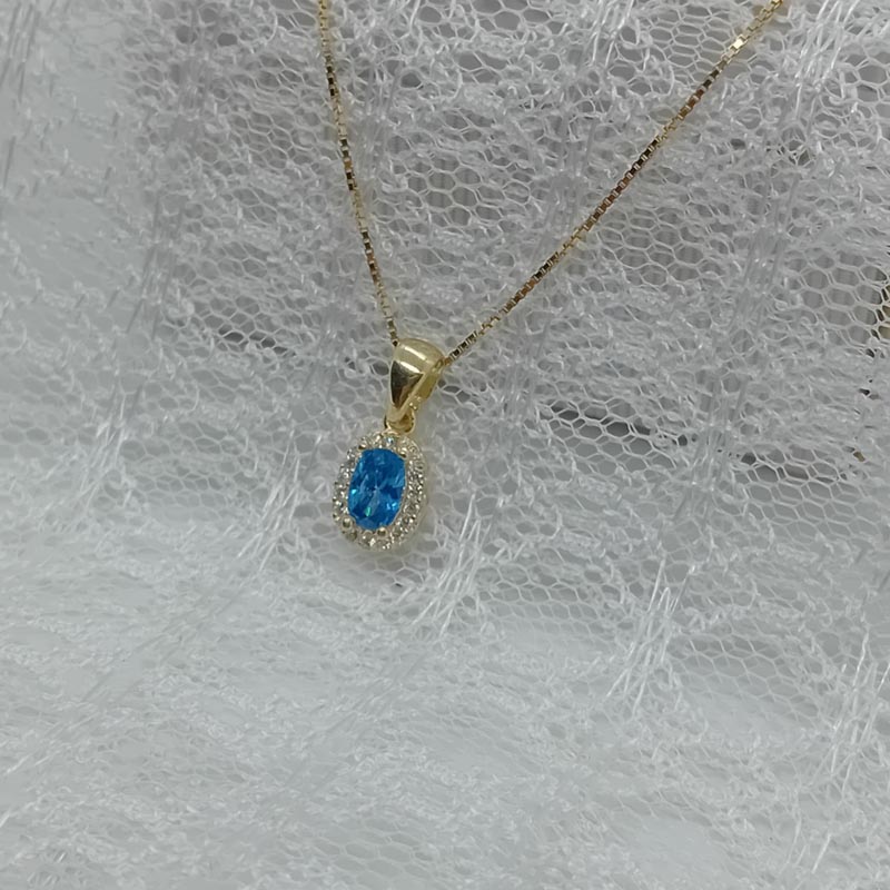 Απίστευτα ρομαντικό κολιέ από επιχρυσωμένο ασήμι, με λεπτή φινετσάτη αλυσίδα, μεγάλο κρικάκι και μοτίφ σχήματος οβάλ με κεντρική πέτρα γαλάζιο ζιργκόν περιτριγυρισμένη από μικροσκοπικά λευκά ζιργκόν για ένα αστραφτερό συνδυασμό ομορφιάς !