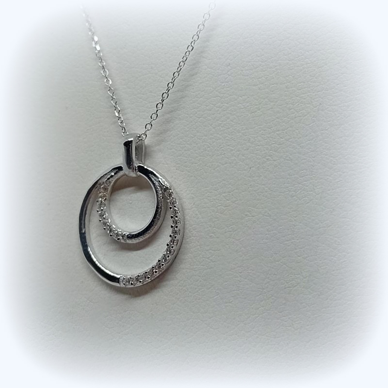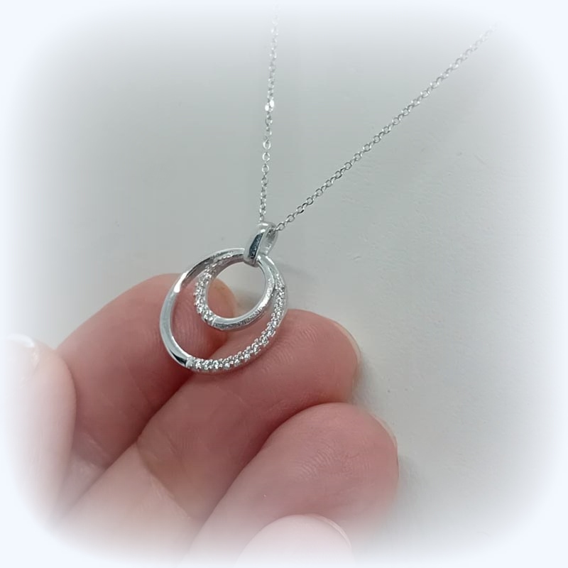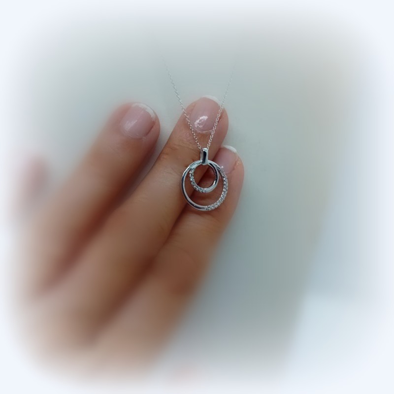 Σύμβολο αγάπης και ένωσης δύο λουστρέ κύκλοι, ο ένας μέσα στον άλλον, από λευκόχρυσο Κ9 με μικρά διακριτικά ζιργκόν στην μισή τους πλευρά και λεπτή αλυσίδα.