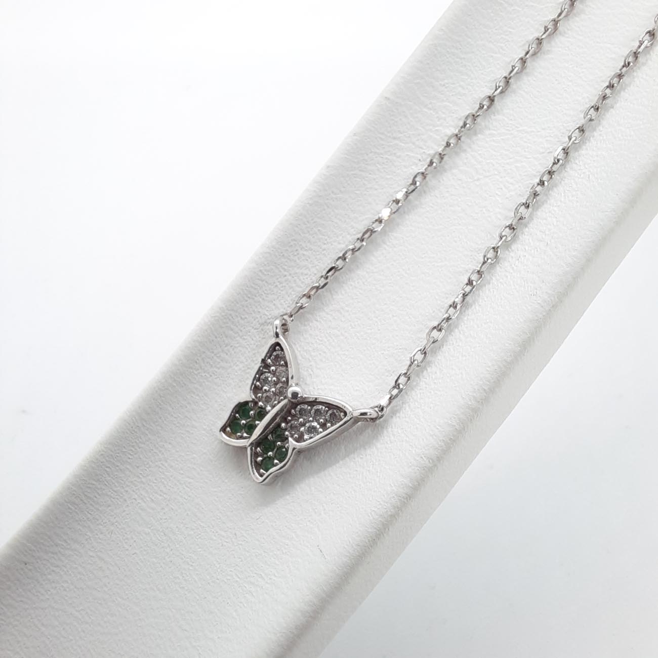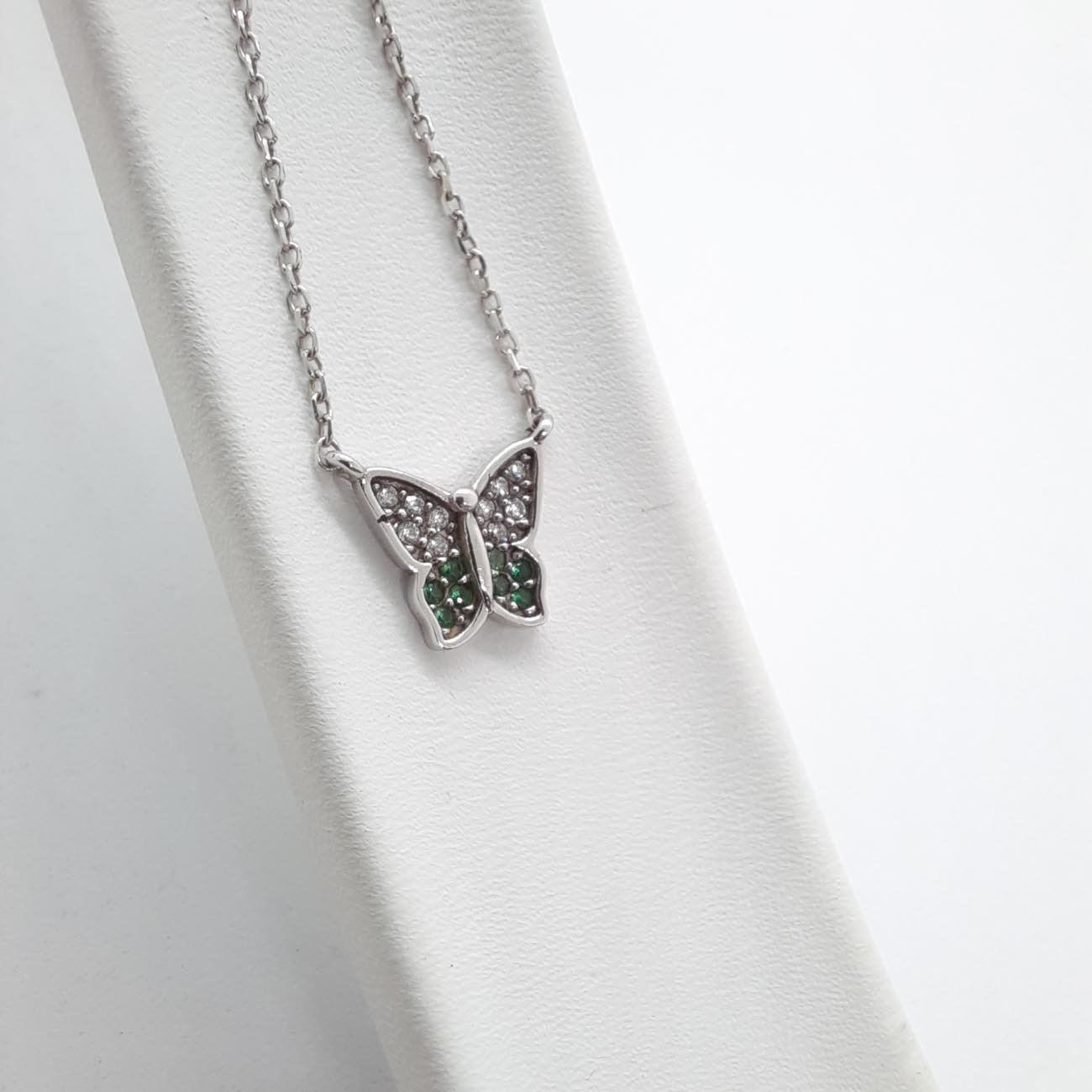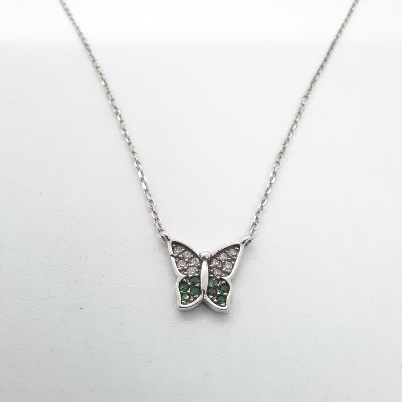 Νεανικό ανέμελο κόσμημα, όμορφη πεταλούδα από λευκόχρυσο 9 καρατίων με λευκά και πράσινα ζιργκόν, ένα λαμπερό κολιέ για όλες τις ώρες!
