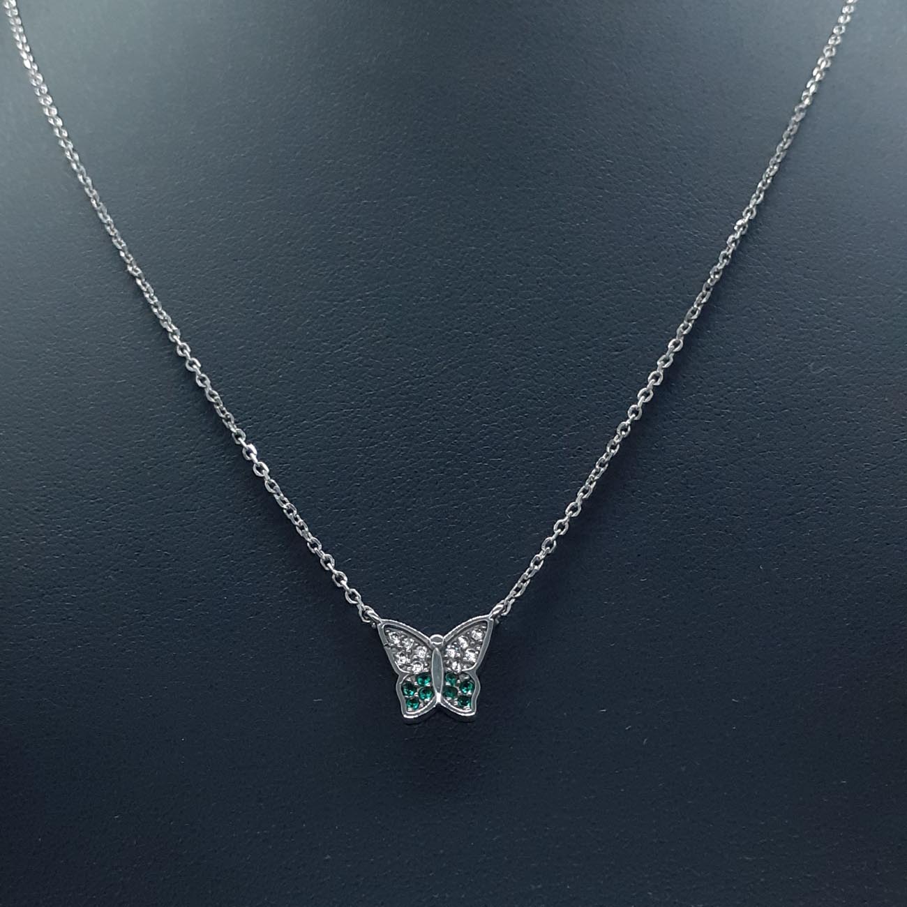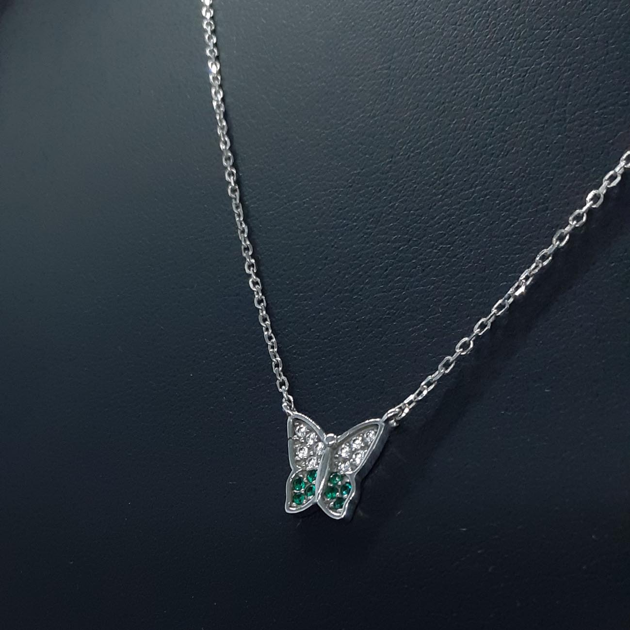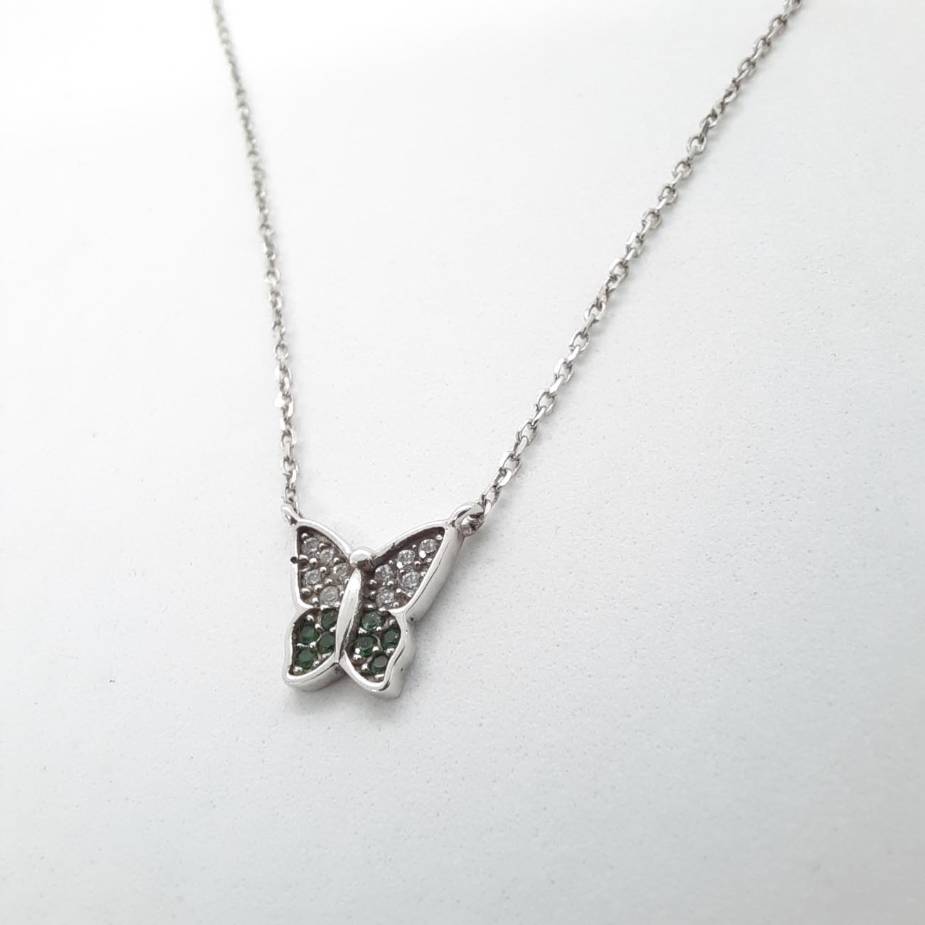 Νεανικό ανέμελο κόσμημα, όμορφη πεταλούδα από λευκόχρυσο 9 καρατίων με λευκά και πράσινα ζιργκόν, ένα λαμπερό κολιέ για όλες τις ώρες!