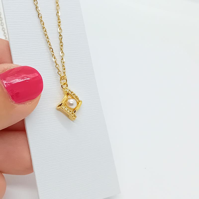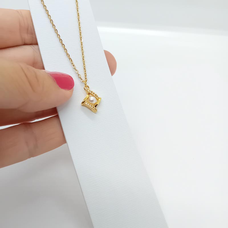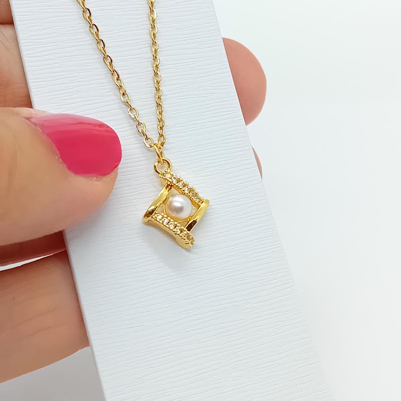 Φινετσάτο και μοναιδκό κολιέ! Μοντέρνο design ρόμβου με ρομαντική πέρλα στο κέντρο και διακριτικά λευκά ζιργκόν στις 2 πλευρές.