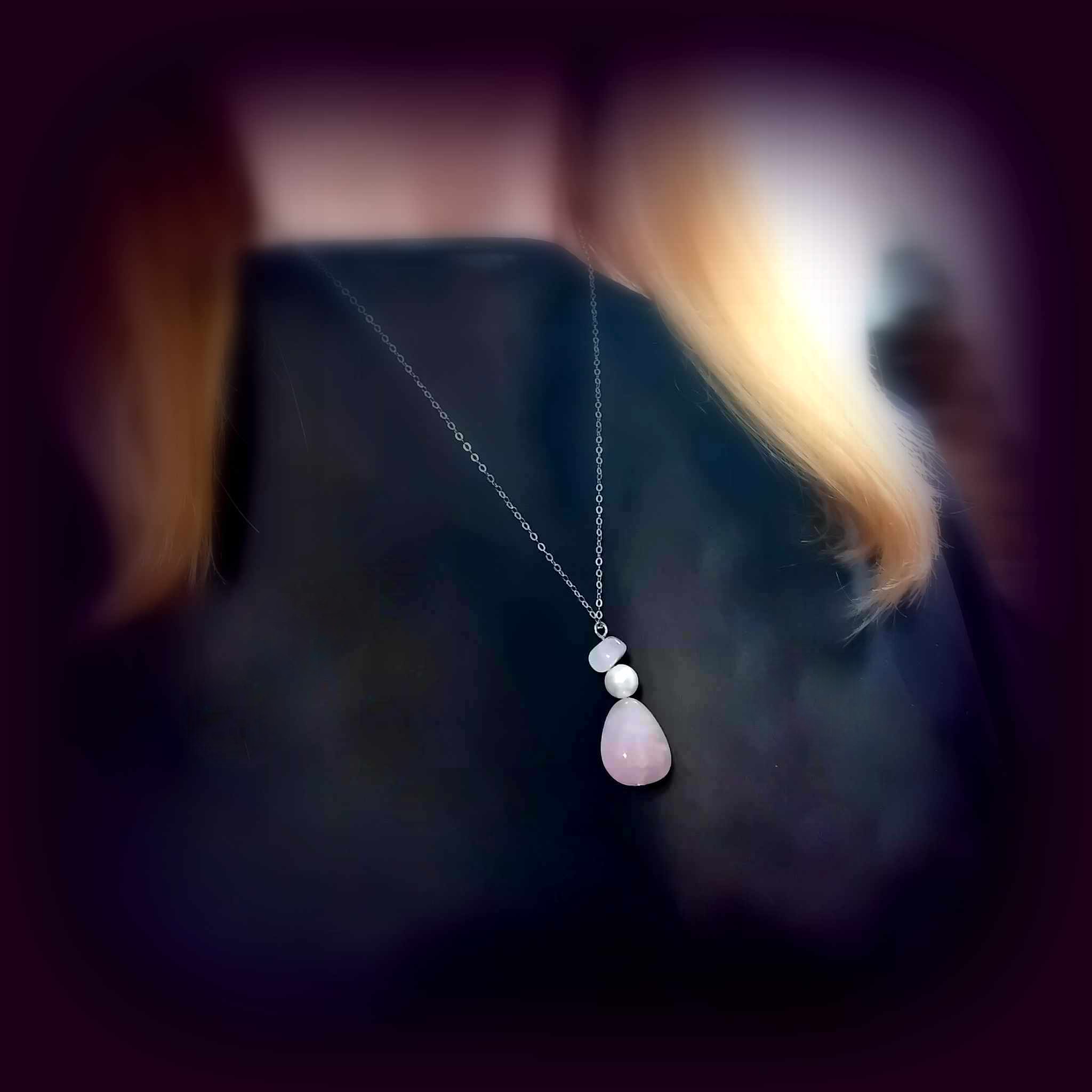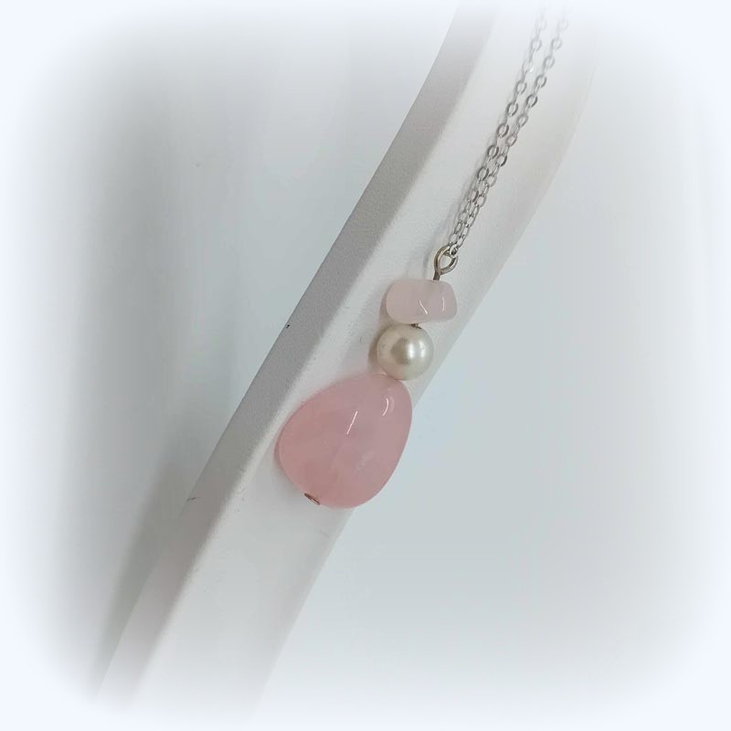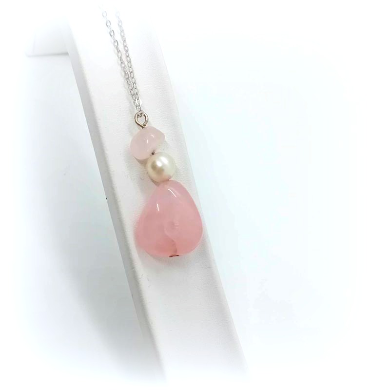 Μια χειροποίητη ρομαντική δημιουργία στο ντεκολτέ σας! Ημιπολύτιμος λίθος ροζ χαλαζίας, (η πέτρα που πολλοί υποστηρίζουν ότι προσελκύει την αγάπη) σε μεγάλο μέγεθος και σε μικρό, με ενδιάμεσα μια λευκή πέρλα, περασμένα σε μακριά αλυσίδα από ΑΣΗΜΙ 925.