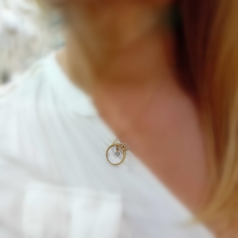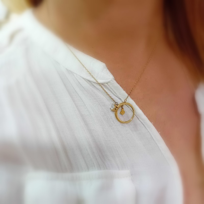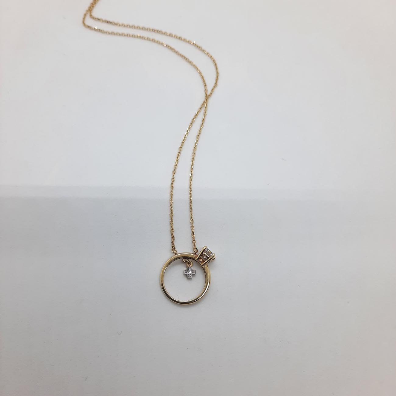 Η αγαπημένη σας έχει όνειρα μακριά από τα συμβατικά; Αν ναι, θα λατρέψει αυτό το χρυσό κολιέ 9 καρατίων, που ανεβάζει την αντίληψη του παραδοσιακού μονόπετρου σε άλλο επίπεδο! Μια πρωτότυπη πρόταση γάμου λοιπόν, με κρεμαστό δαχτυλίδι με λευκό ζιργκόν σε υπερυψωμένο καστόνι και διακριτικό μικρό σταυρό, διπλής όψης, η μια πλευρά λουστρέ χρυσό και η άλλη με διακριτικά λευκά ζιργκόν.