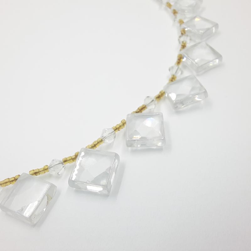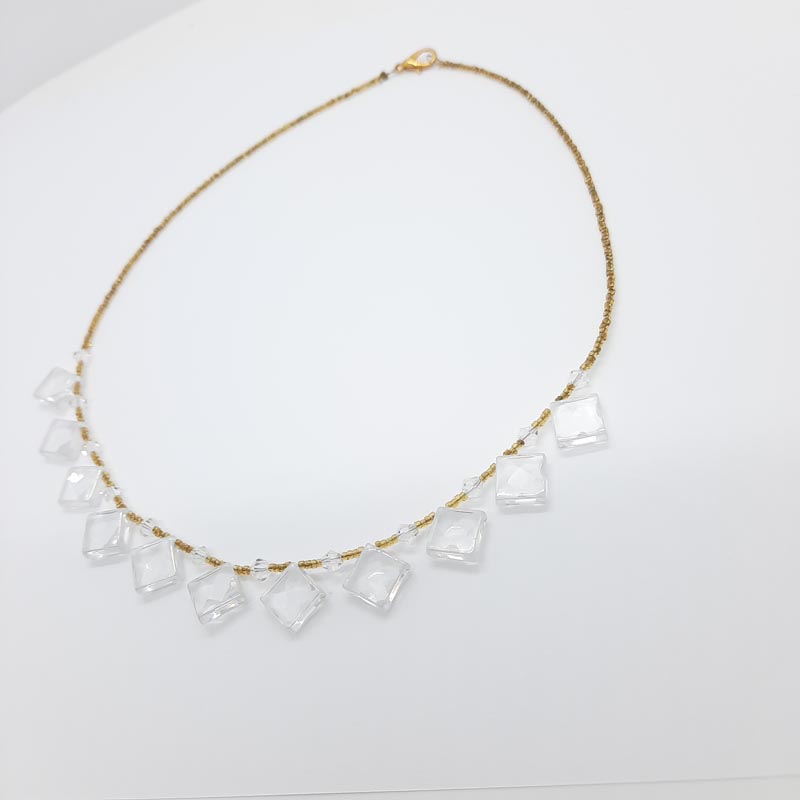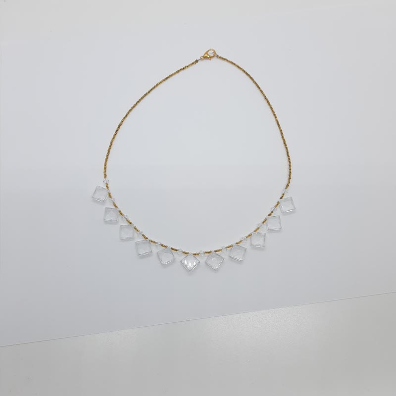 Για τις πιο γκλάμορους εμφανίσεις σας, κολιέ βραδυνό και εντυπωσιακό, με πολύ όμορφες μικρές χάντρες σε κίτρινο χρώμα και υπέροχα κρυσταλλάκια σε σχήμα ρόμβου .
