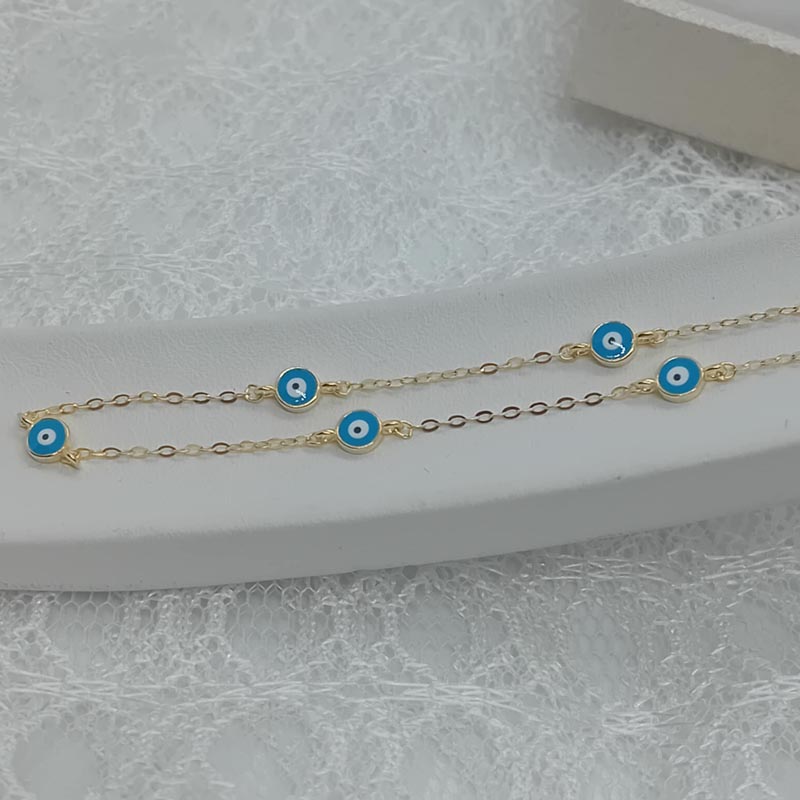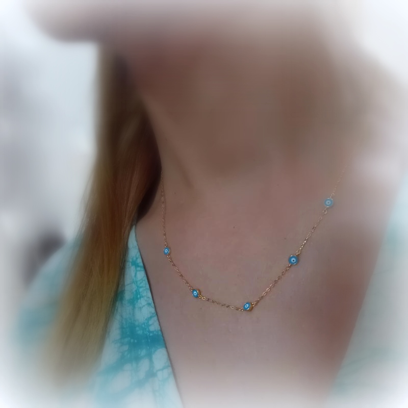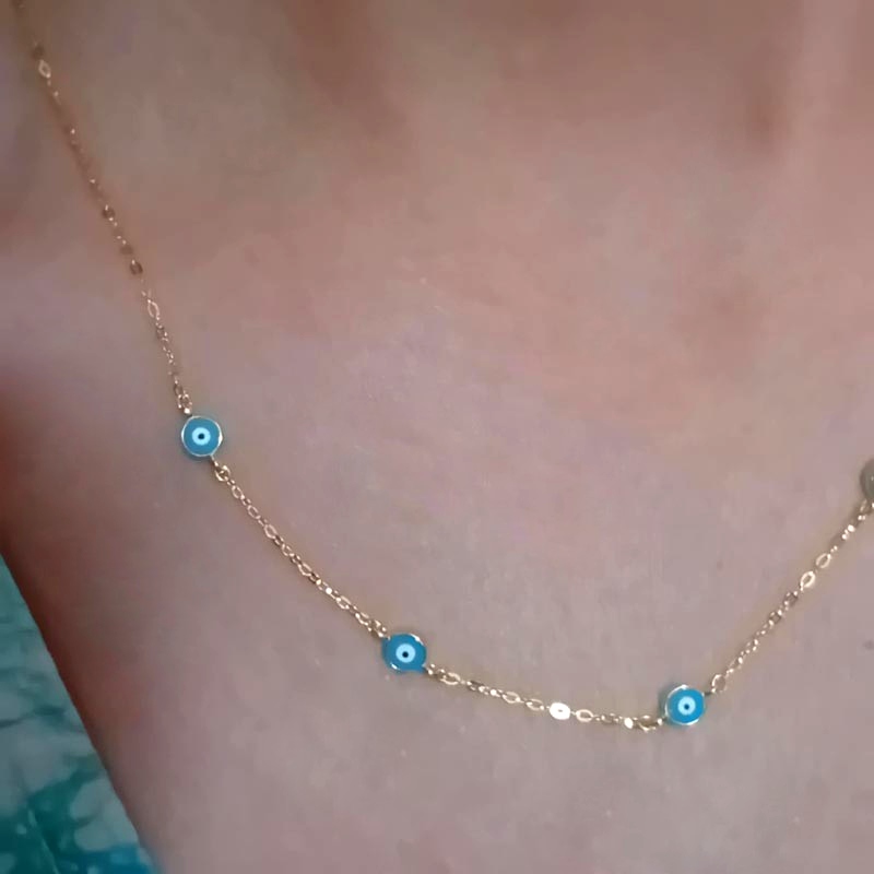 Λεπτό, διακριτικό κολιεδάκι από επιχρυσωμένο ασήμι με 5 μικρά ματόχαντρα για trendy εμφανίσεις και προστασία από κακό "μάτι".