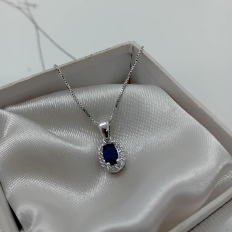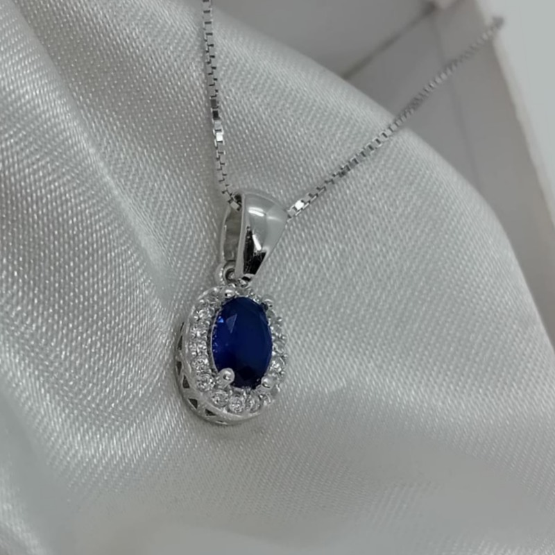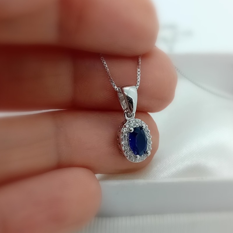 Κολιέ ασήμι λεπτή αλυσίδα με παντατίφ σε σχήμα οβάλ με σκούρη μπλε πέτρα ζιργκόν περιστοιχισμένη με λευκά ζιργκόν .