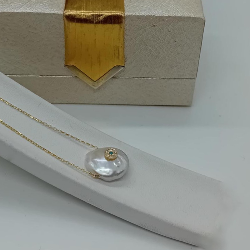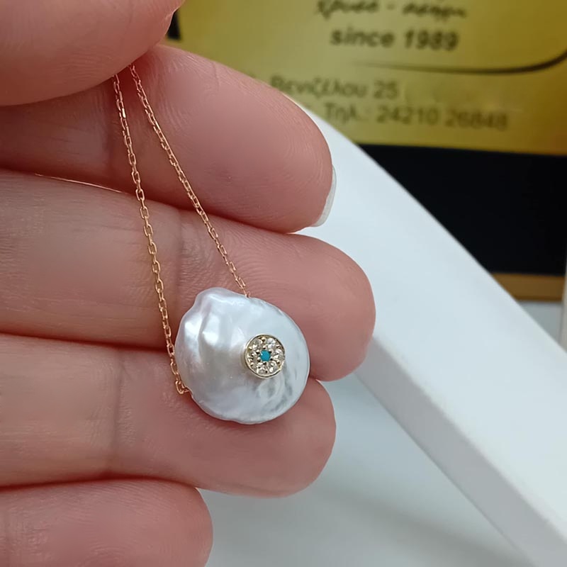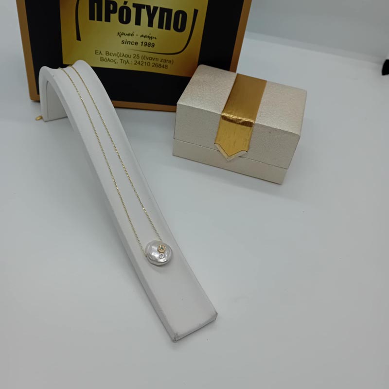 ΚΟΛΙΕ με ακατέργαστο ΜΑΡΓΑΡΙΤΑΡΙ, εντυπωσιακό , με αλυσίδα από επιχρυσωμένο ασήμι. Στο κέντρο του μαργαριταριού υπάρχει διακριτικό μπλε ζιργκόν ανάμεσα σε άλλα πολύ μικρά ζιργκόν.