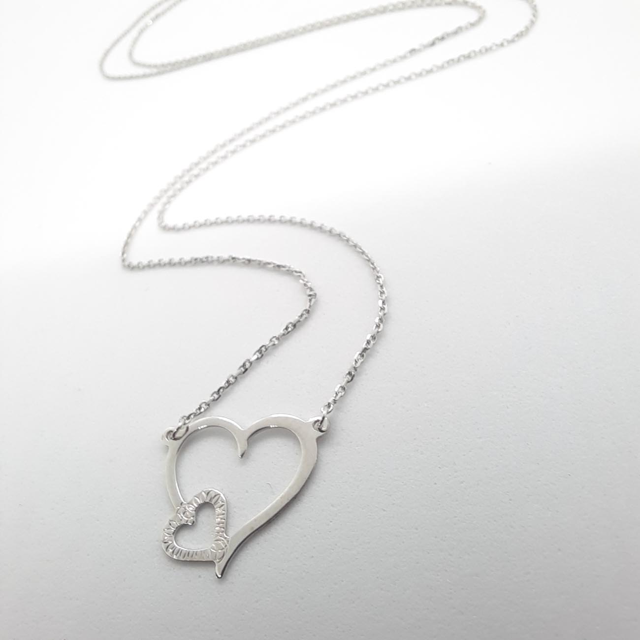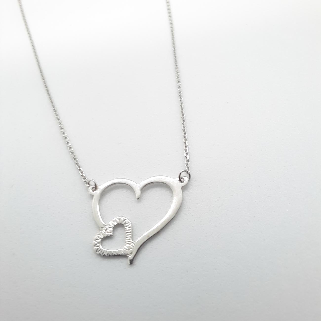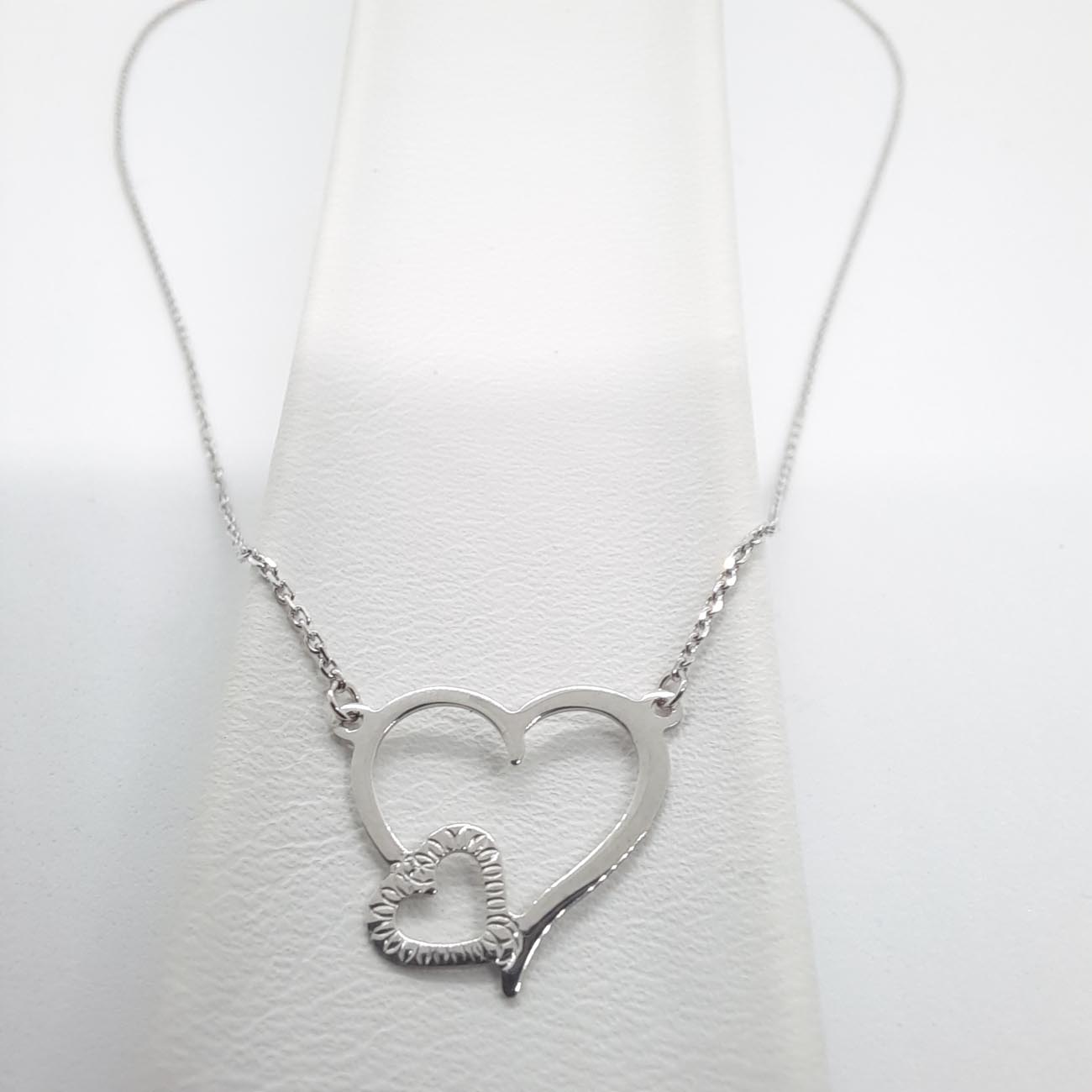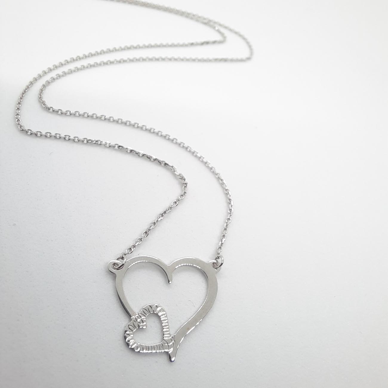 Ρομαντικό κολιέ από λευκόχρυσο Κ9 με μικρή καρδούλα, ζαγρέ επιφάνειας, αγκαλιασμένη από μια μεγαλύτερη καρδιά λουστρέ επιφάνειας, κομψό κόσμημα για όλες τις ηλικίες.