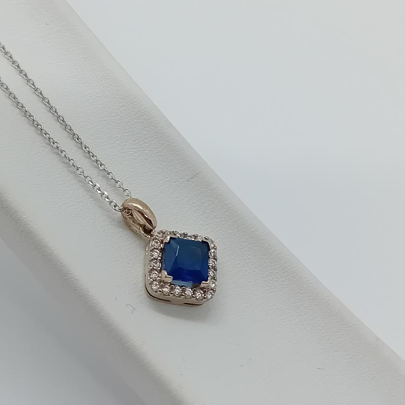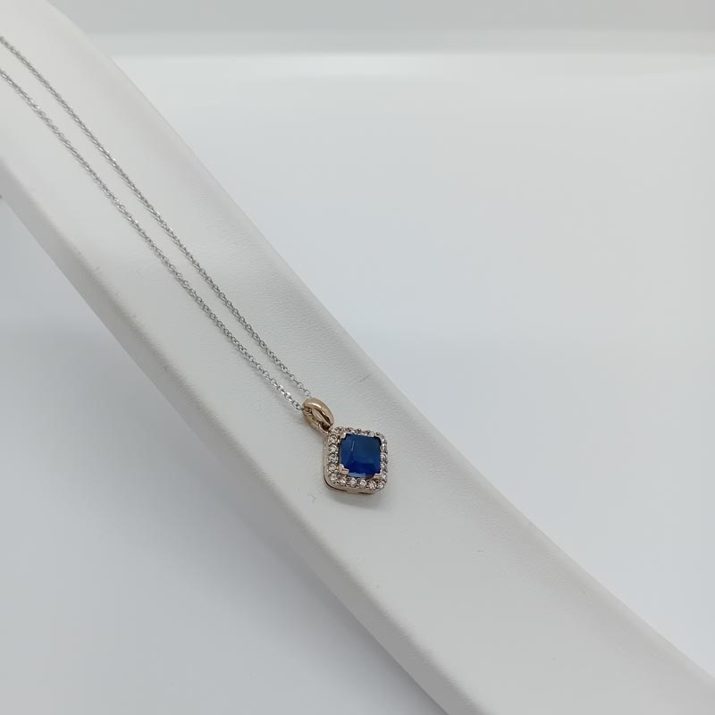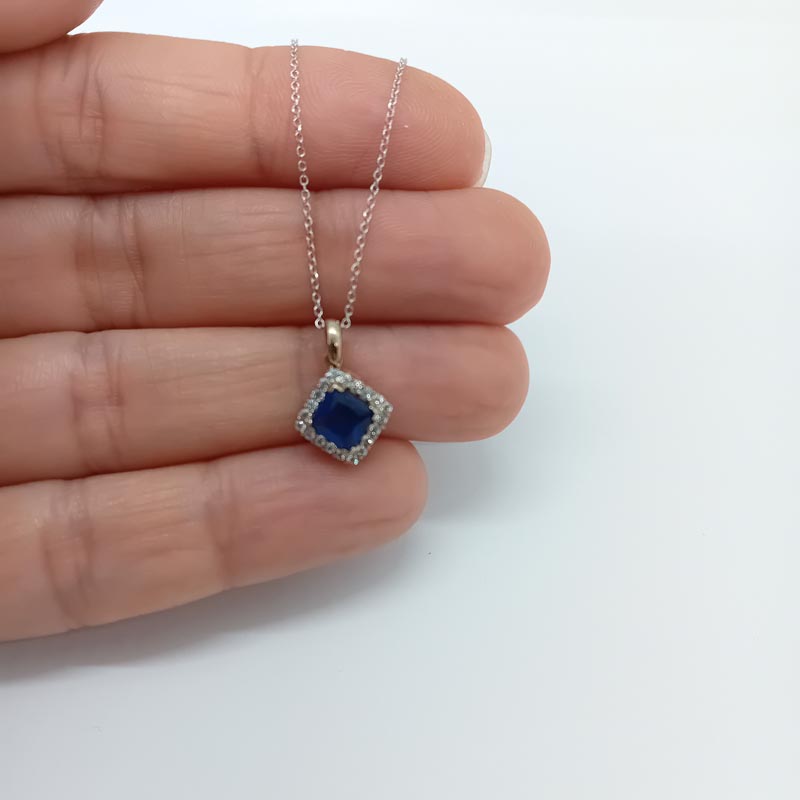 Ένα πολύτιμο κόσμημα που αποπνέει ρομαντισμό και αρχοντιά! Από λευκόχρυσο , με λεπτή αλυσίδα , μεγάλο ωραίο κρικάκι, πανέμορφο μενταγιόν σε σχήμα ρόμβου, μεγάλο ευδιάκριτο ζιργκόν σε απόχρωση μπλε του ουρανού , στολισμένο με αφθονία λευκών ζιργκόν στο καστόνι του, ένα κολιέ ιδανικό και για νυφικό κόσμημα!
