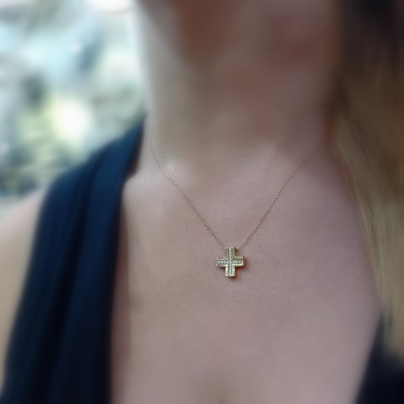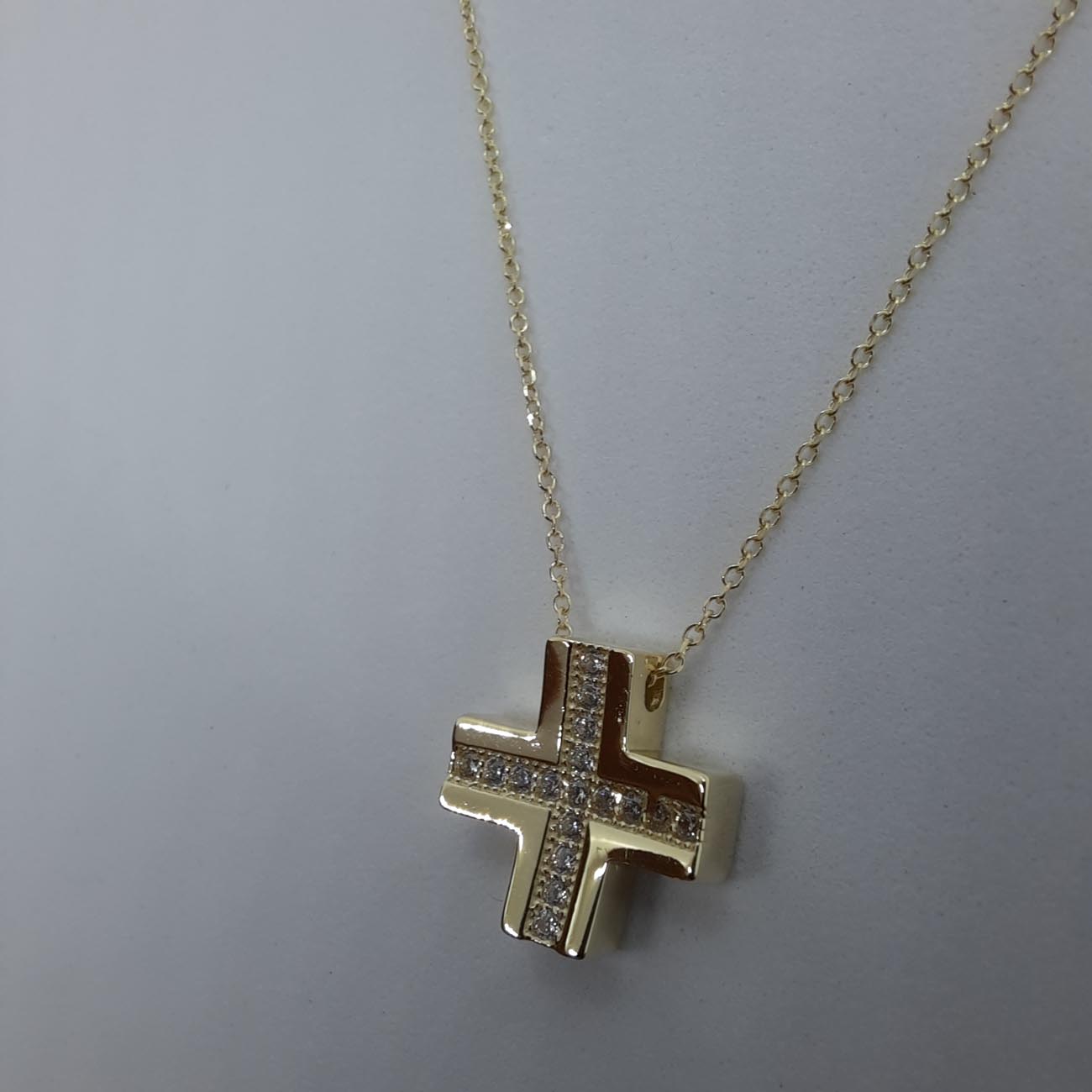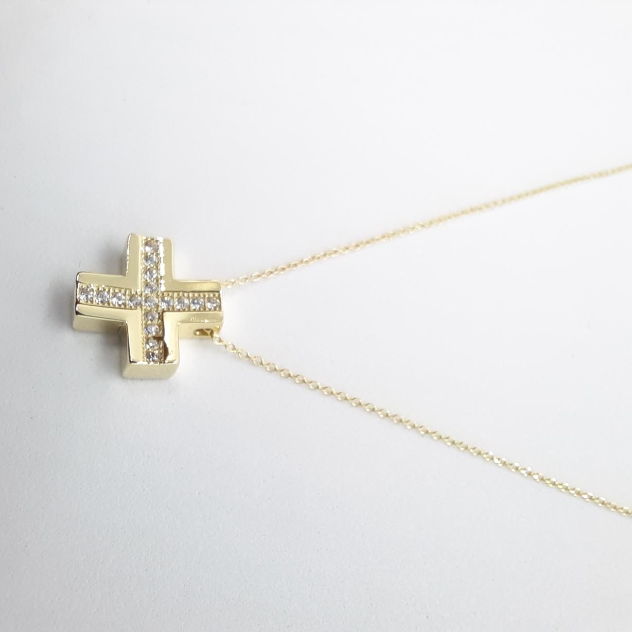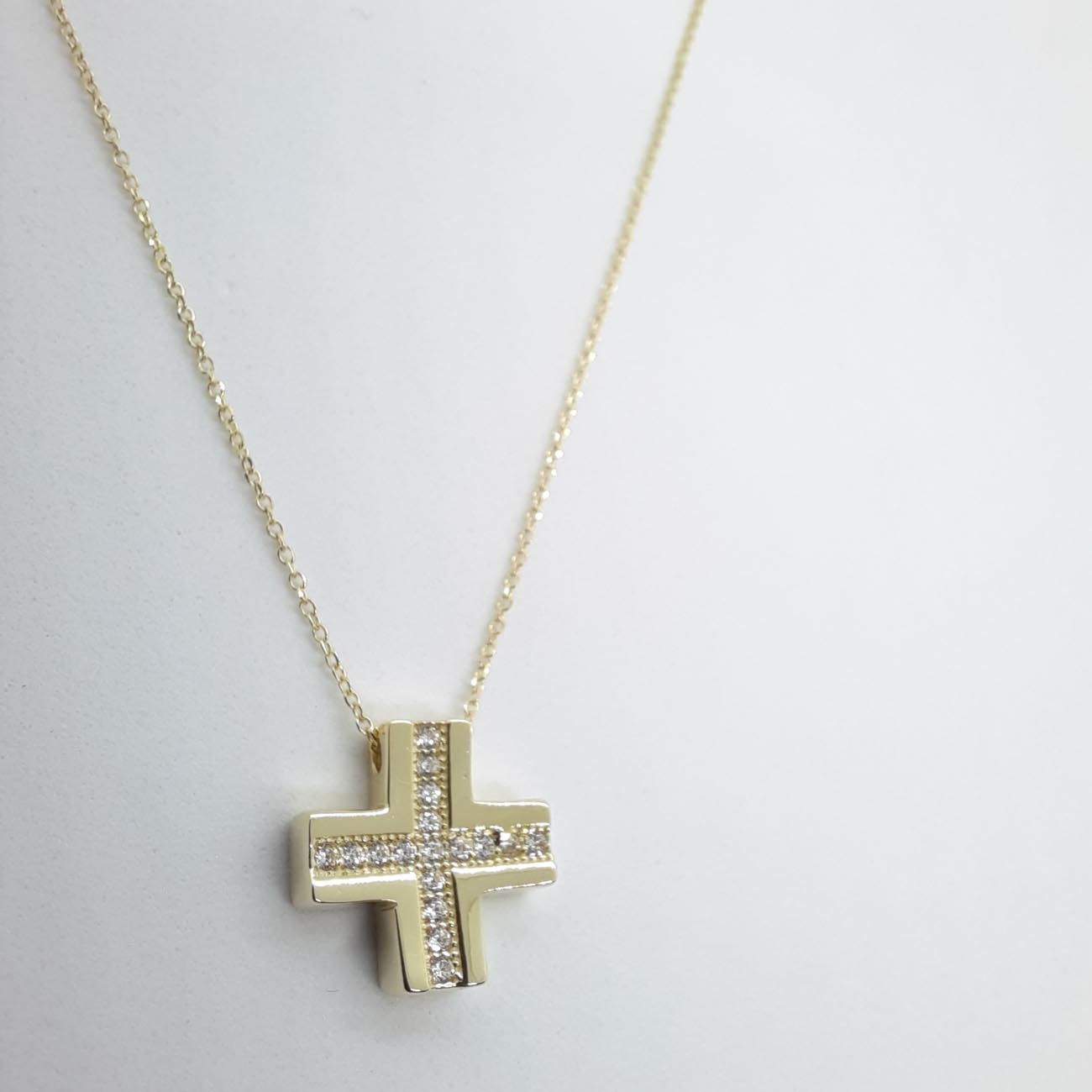 Ένας υπέροχος σταυρός από χρυσό Κ9 με λευκά ζιργκόν , τετραγωνισμένος και με όμορφο πάχος, μαζί με την φίνα αλυσίδα του!