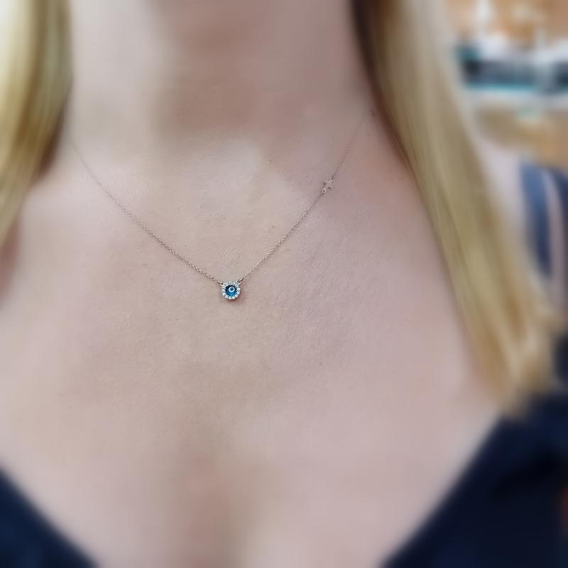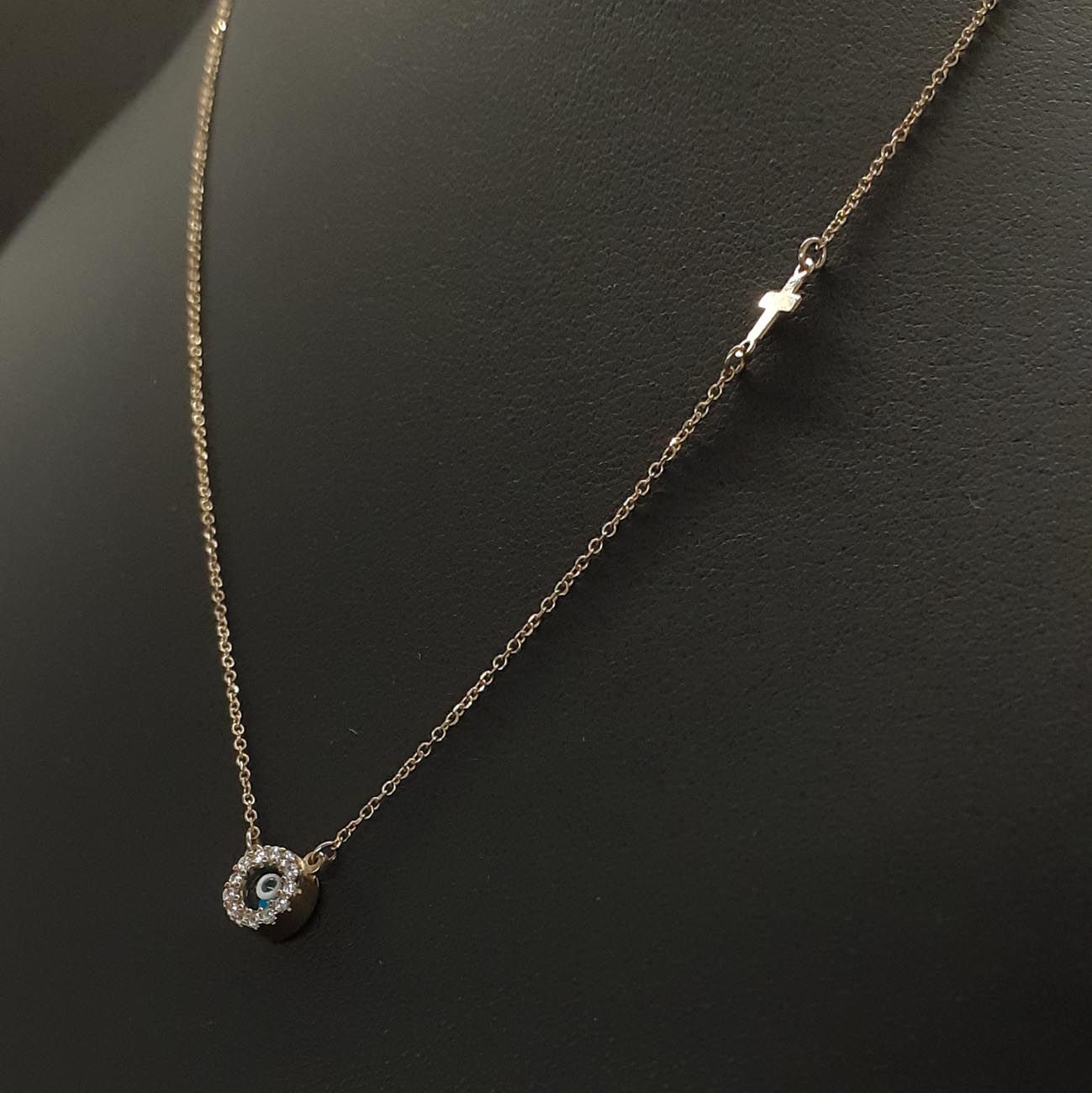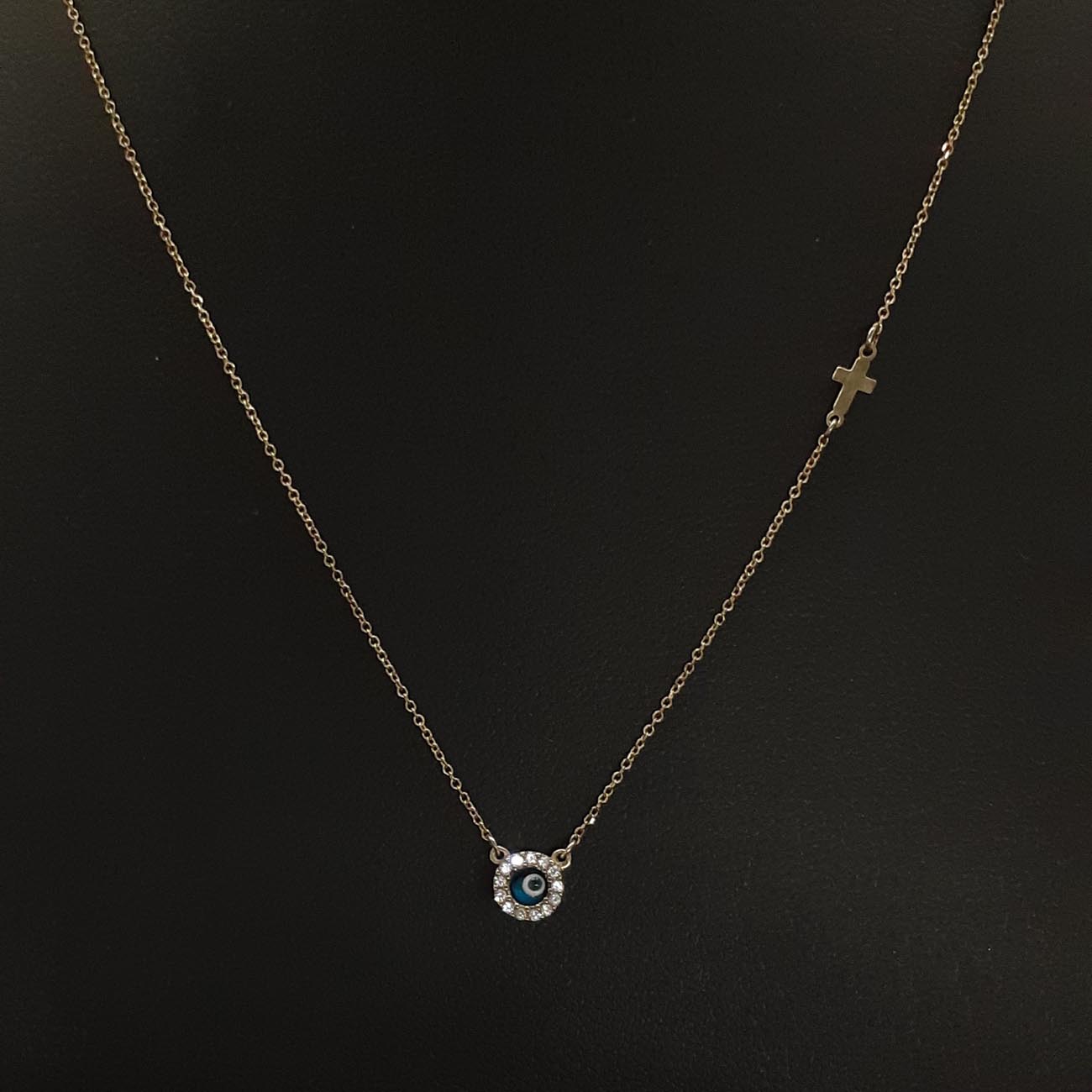 Διακριτικό και κομψό, νεανικό και πολύτιμο κολιεδάκι από χρυσό 9 ΚΑΡΑΤΙΑ, με κεντρικό ματόχαντρο πλαισιωμένο από λευκά λαμπερά ζιργκόν και έναν μικρό σταυρό στην αλυσίδα του.