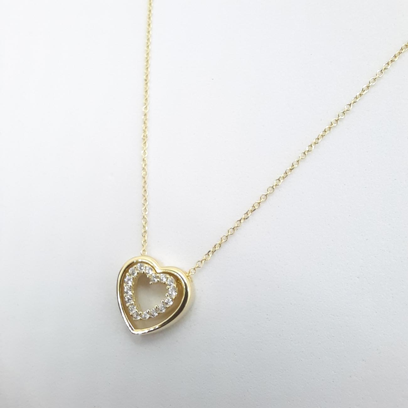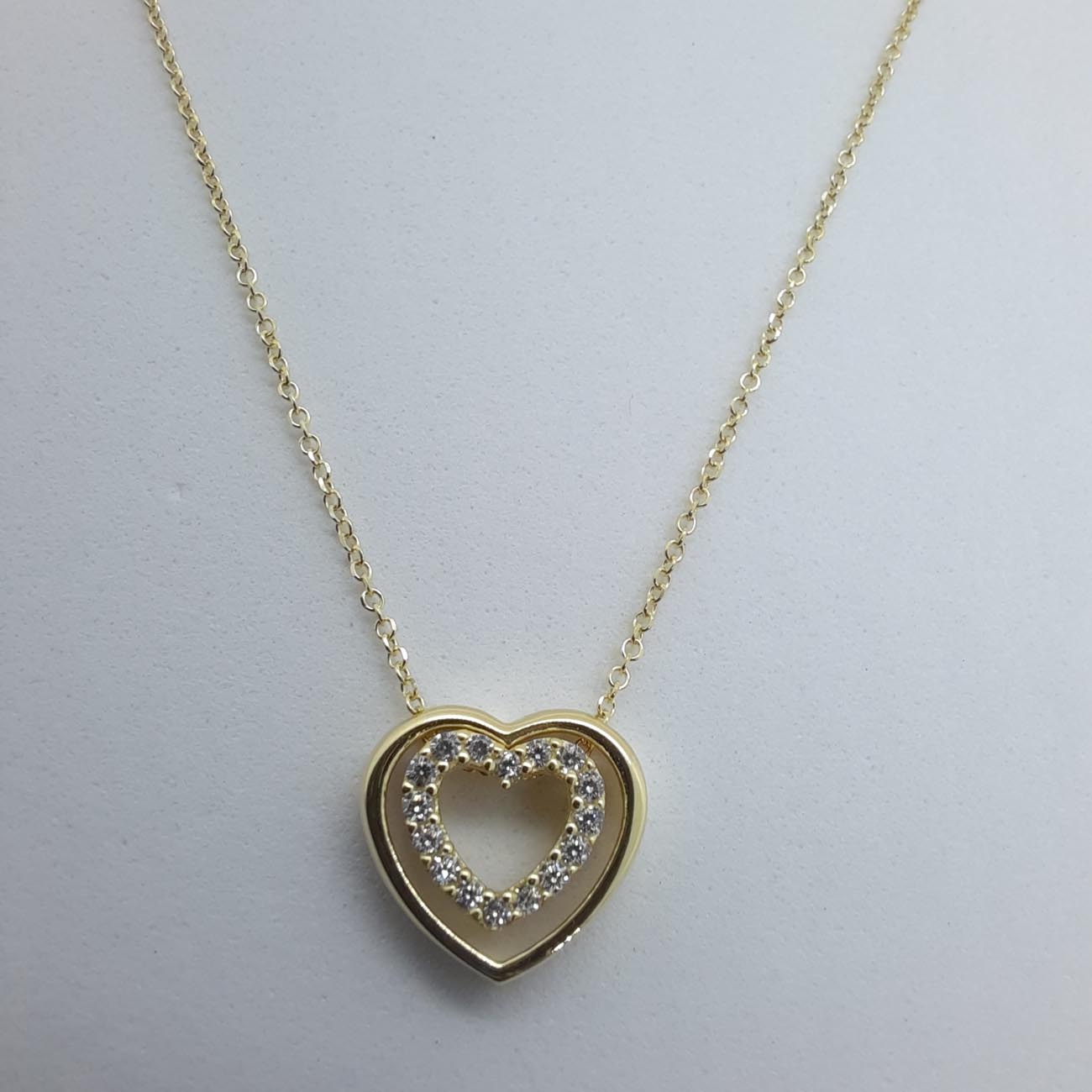 Ιδανικό δώρο αγάπης. Κολιέ με δύο υπέροχες καρδιές που ενώνονται αρμονικά, από χρυσό 9 καρατίων και λευκές πέτρες ζιργκόν.