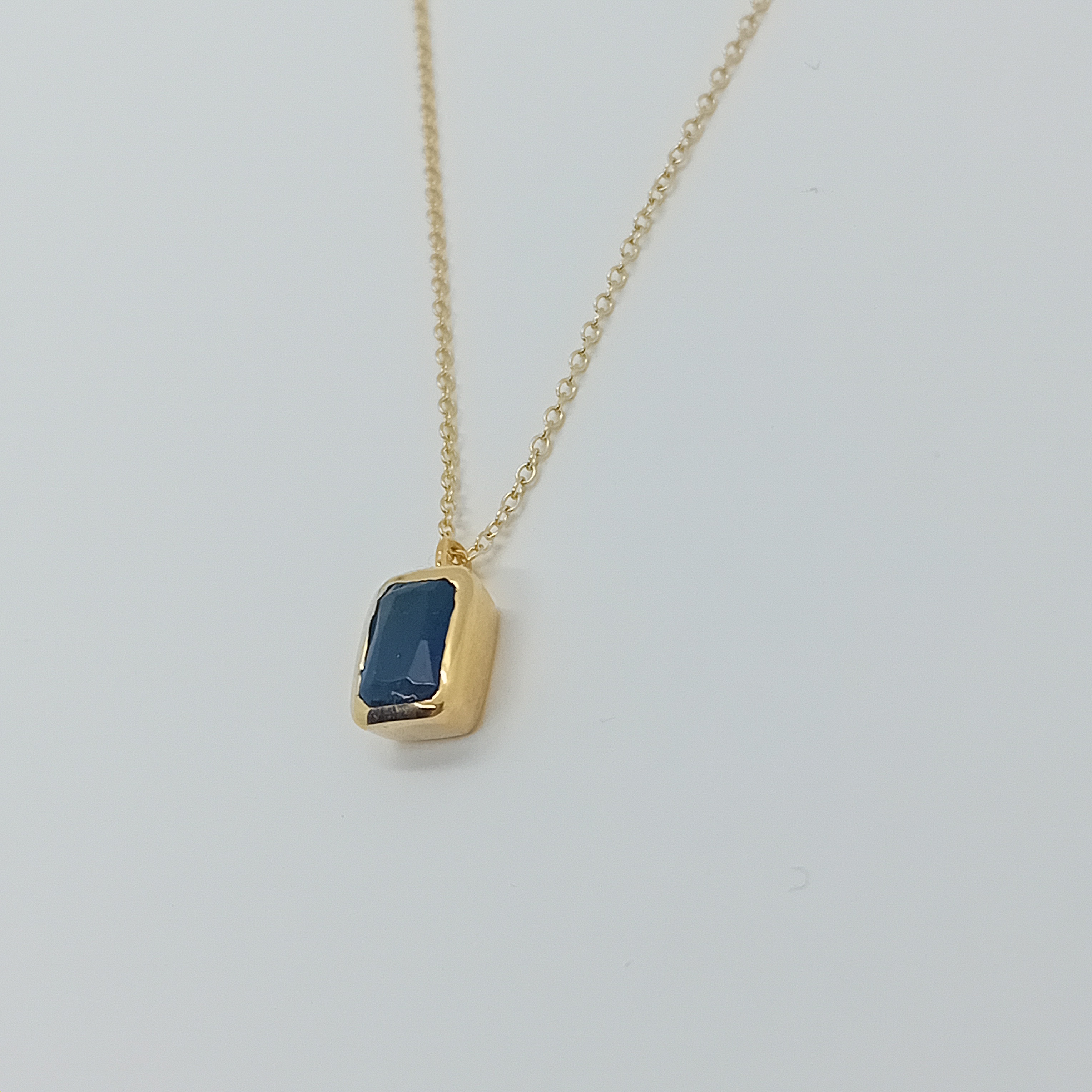 Η ομορφιά του μινιμαλισμού δεν χρειάζεται περιττά στολίδια ! Ένα λιτού σχεδιασμού κολιέ από ΧΡΥΣΟ 9 καρατίων, με ορθογώνια παραλληλόγραμμη πέτρα ζιργκόν σε σκούρα μπλε απόχρωση, ιδανικό για κάθε περίσταση.
