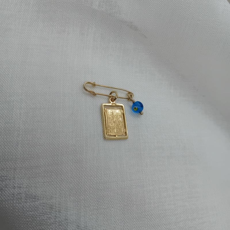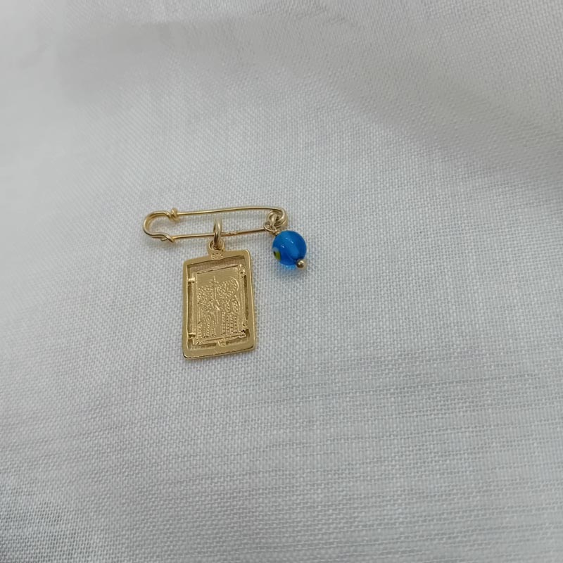 Φυλαχτό ΚΩΝΣΤΑΝΤΙΝΑΤΟ, ντουμπλ φας, ορθογώνιο, με ματόχαντρο στην παραμάνα, ιδανικό για κούνια, κρεβατάκι, ρουχαλάκι μωρού, από επιχρυσωμένο ασήμι.