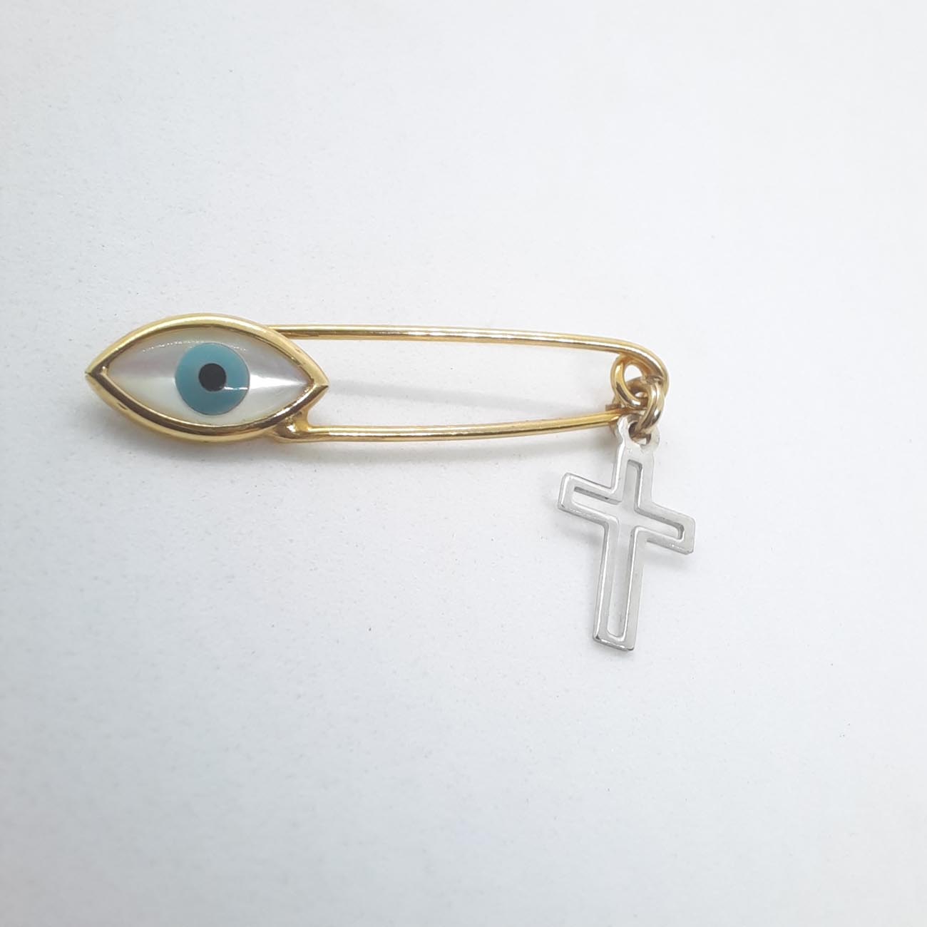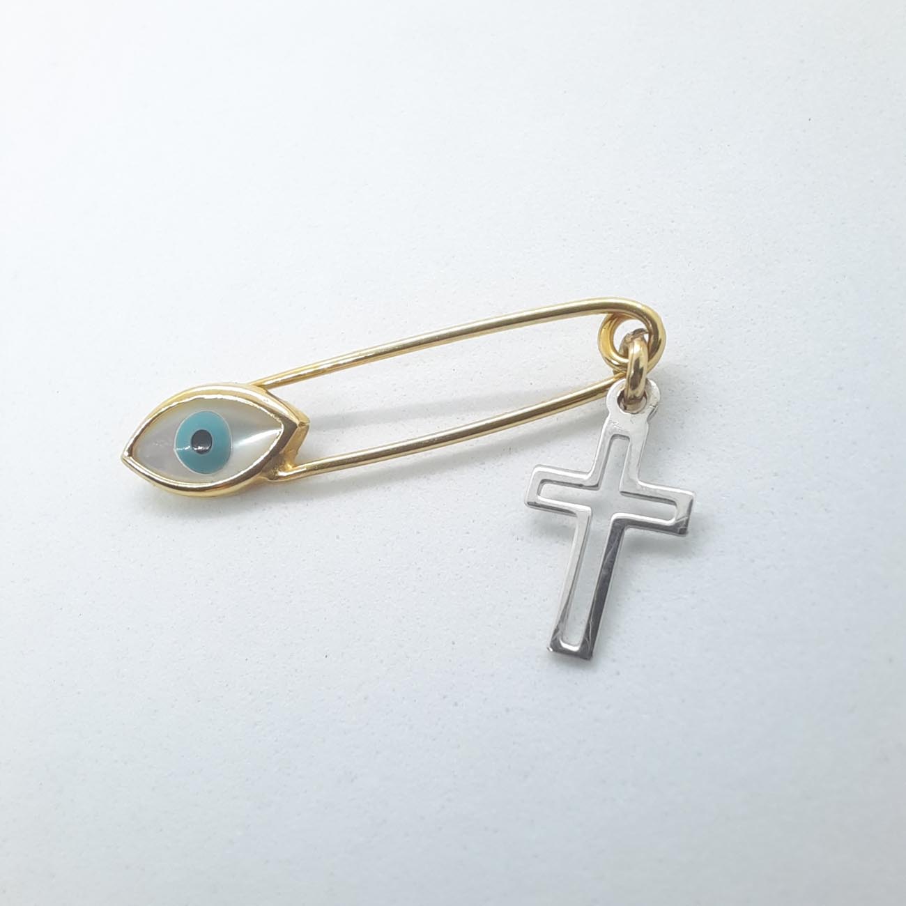 Όμορφο χρυσό ματόχαντρο 14 καράτια, περασμένο σε χρυσή παραμάνα, στην οποία υπάρχει σταυρουδάκι λευκόχρυσο, ένα ιδανικό δώρο για μπέμπη και μπέμπα, για ευλογία και προστασία! ΒΑΡΟΣ: 1 gr