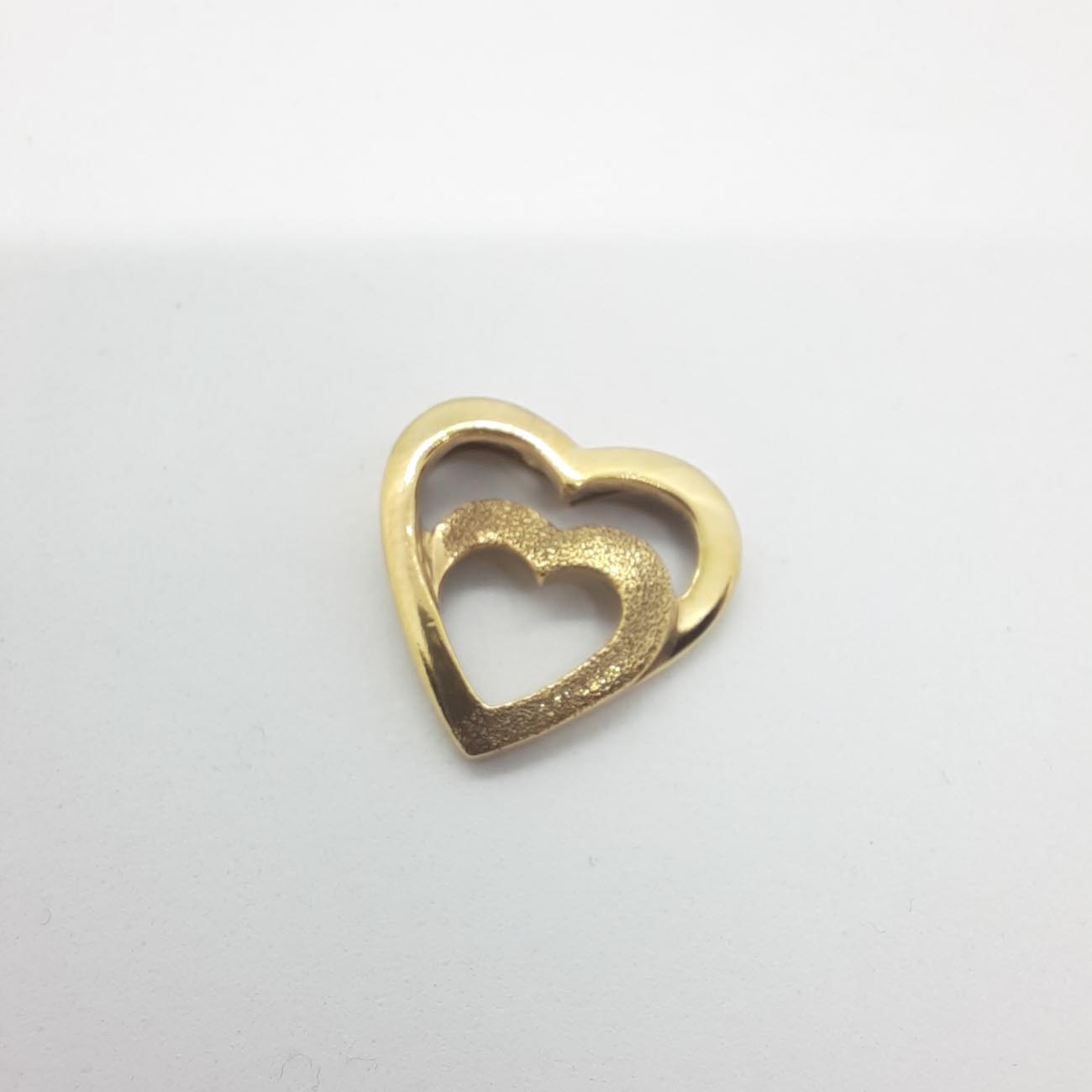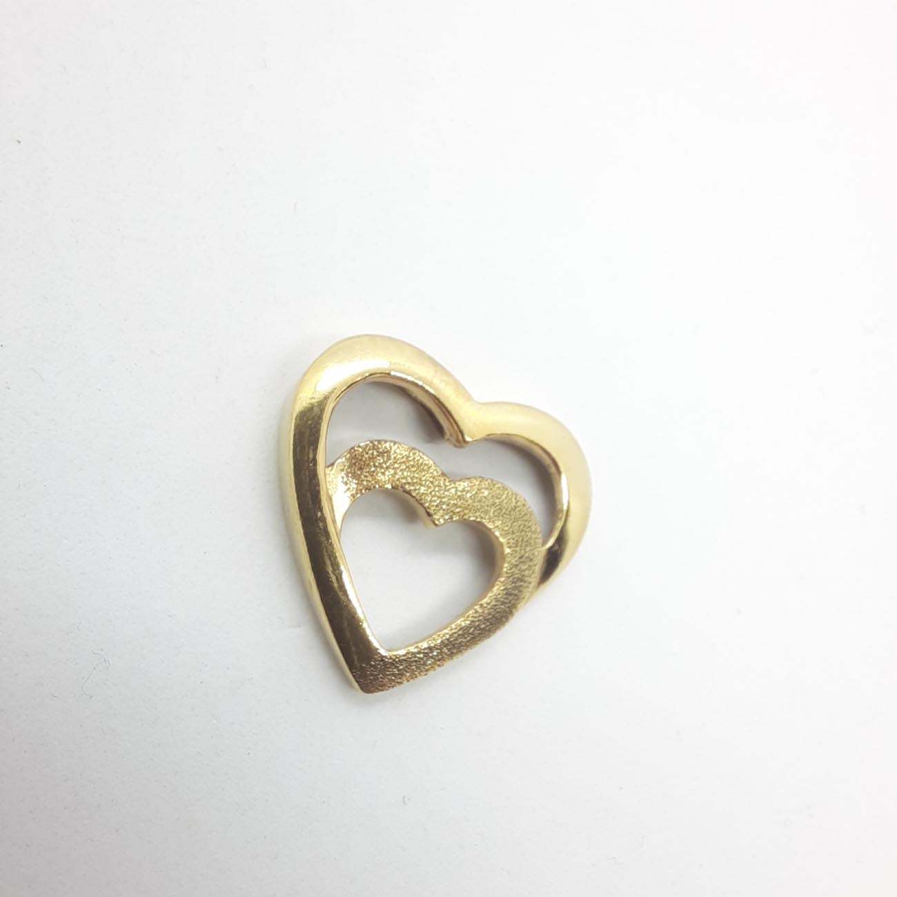 Μια μεγάλη καρδιά με λουστρέ επιφάνεια που περικλείει μια μικρότερη καρδιά με ζαγρέ επεξεργασία, ένα μενταγιόν από επιχρυσωμένο ασήμι, ιδιαίτερα θηλυκό που μπορείτε να το φορέσετε άνετα με αλυσίδα ή δερμάτινο λουράκι.