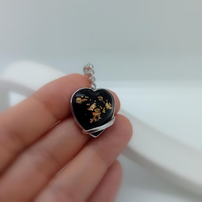 Σαν βγαλμένη από μεσαιωνικό παραμύθι, καρδιά μαύρη πέτρα με αστραφτερά στοιχεία μέσα της, σε πλαίσιο από ΑΣΗΜΙ και μακρύ κρικάκι από ασήμι με4 λευκά ζιργκόν.
