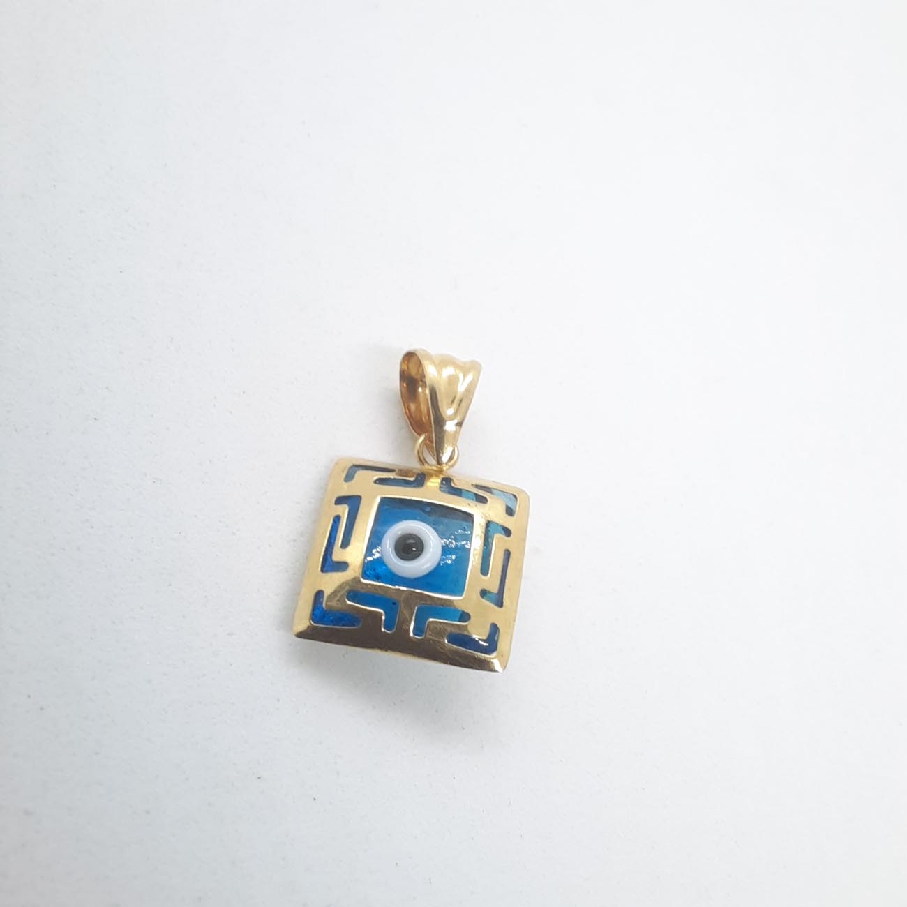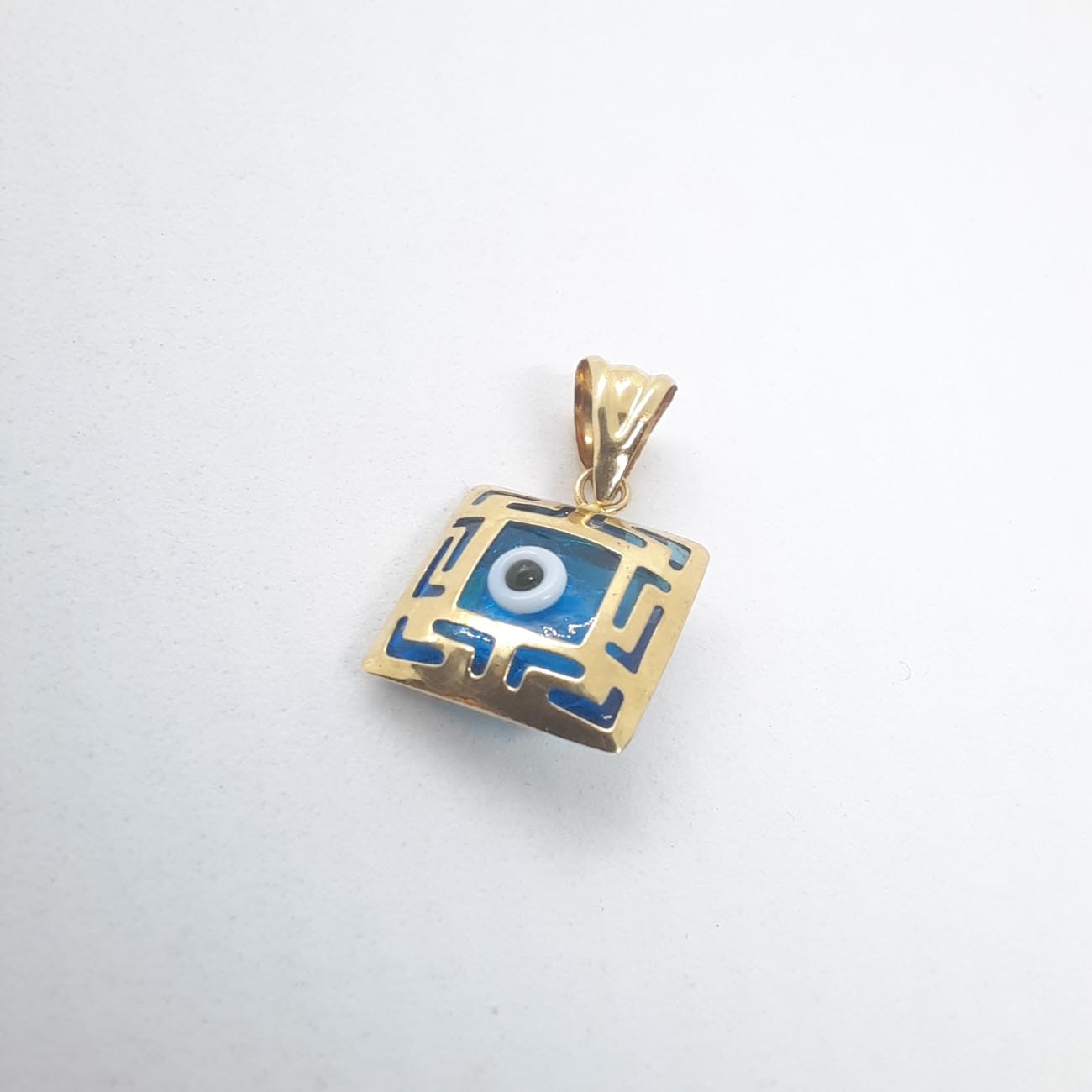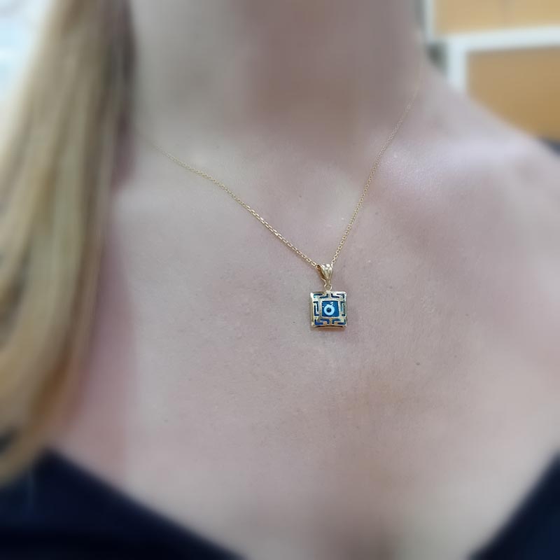 Ματόχαντρο για μωράκι που θα φορεθεί αργότερα ως κολιέ, σε μπλε απόχρωση, διάφανο, μέσα σε μενταγιόν ΧΡΥΣΟ 14 ΚΑΡΑΤΙΩΝ, με σκάλισμα μαίανδρο εμπνευσμένο από αρχαία Ελλάδα, σε τετράγωνο design για μοντέρνες εμφανίσεις, πρωί -βράδυ! (Προσοχή: ΣΤΗΝ ΤΙΜΗ ΔΕΝ ΠΕΡΙΛΑΜΒΑΝΕΤΑΙ Η ΑΛΥΣΙΔΑ)