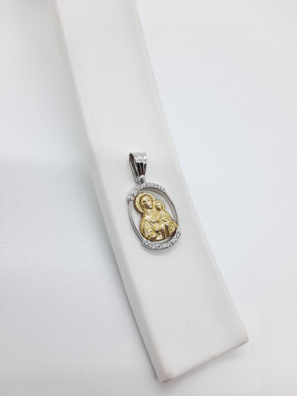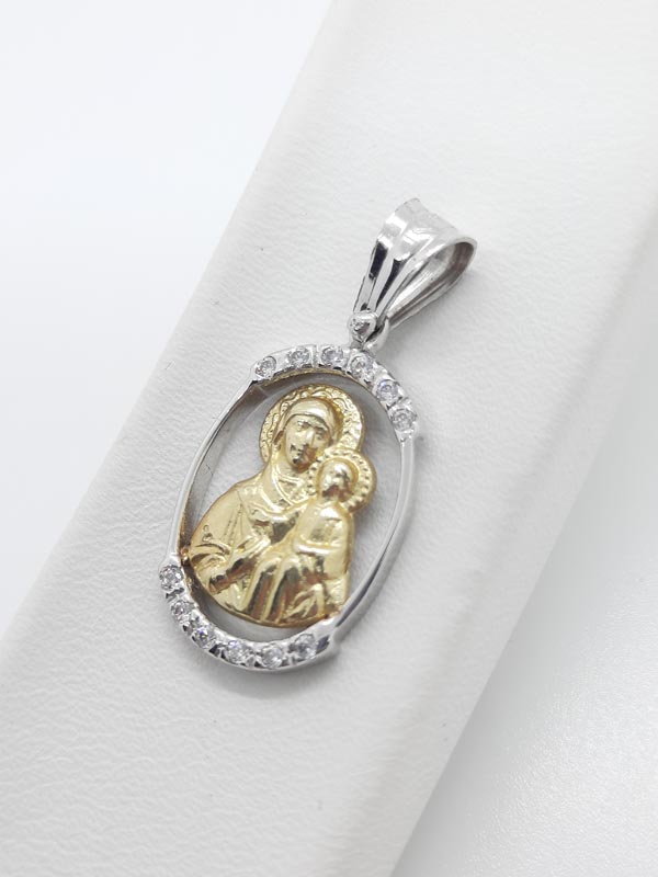 Πολύ κομψό μενταγιόν, σε οβάλ σχήμα από λευκόχρυσο 14 ΚΑΡΑΤΙΩΝ , με ανάγλυφη σκαλιστή Παναγία με Χριστό από χρυσό 14 ΚΑΡΑΤΙΩΝ, με μεγάλο κρίκο και λευκά ζιργκόν επάνω και κάτω. Ιδανικό για δώρο νεογέννητου, αλλά και για κόσμημα στο λαιμό μας!