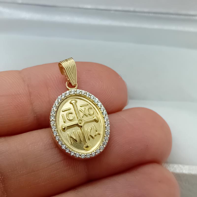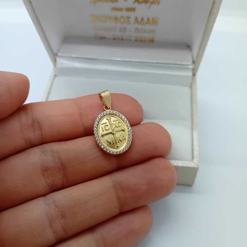 Ιδανικό κόσμημα πίστης και ομορφιάς με υπέροχο σκαλισμένο σταυρό και σύμβολα ΙCXC NIKA σε οβάλ μενταγιόν, χρυσό 9 καρατίων, με πολύ διακριτικά λευκά ζιργκόν στην περίμετρο και κομψό ριγέ κρικάκι.