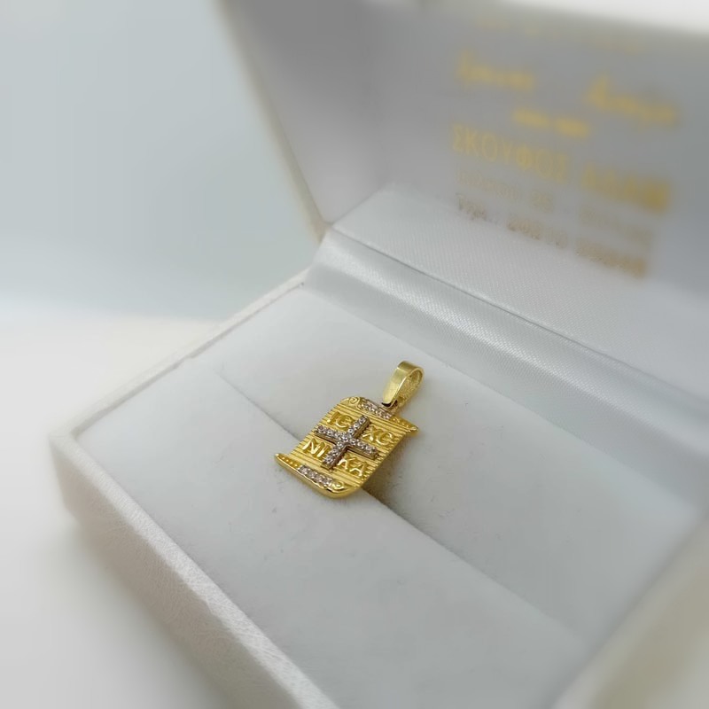 Εντυπωσιακό μενταγιόν, διαχρονικό πολύτιμο κόσμημα, σε design πάπυρου, με μεγάλο κρικάκι, πρωτότυπη ζαγρέ όψη, με κεντρικό σταυρό από μικρά αστραφτερά ζιργκόν και ανάγλυφα IC CX NICA (ΙΗΣΟΥΣ ΧΡΙΣΤΟΣ ΝΙΚΑ), από χρυσό 9 καράτια.