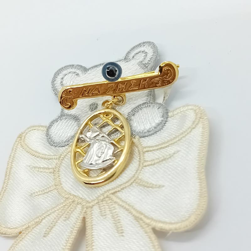Ευλαβικό δώρο για την προστασία του μωρού σας από βασκανία και ασθένεια , χρυσό φυλαχτό 14 καρατίων με ματόχαντρο , ευχή και οβάλ σκαλιστή εικόνα της Παναγίας .