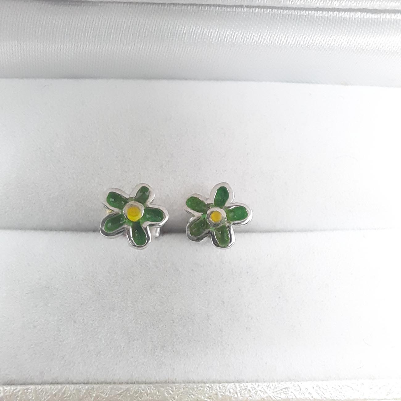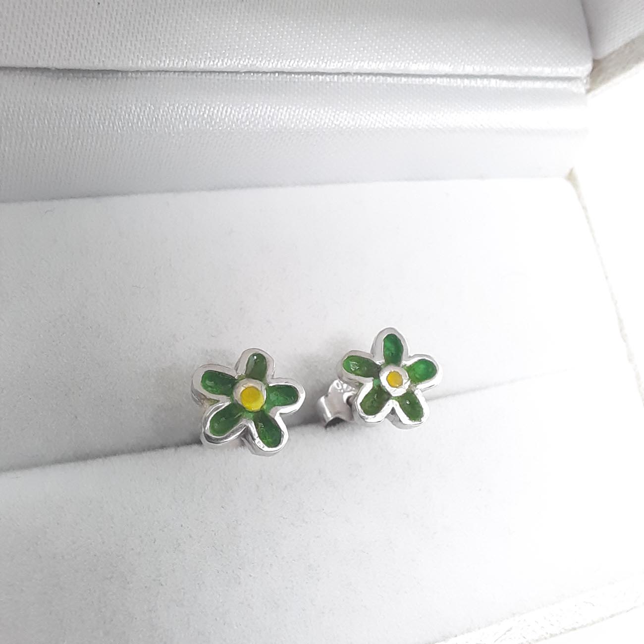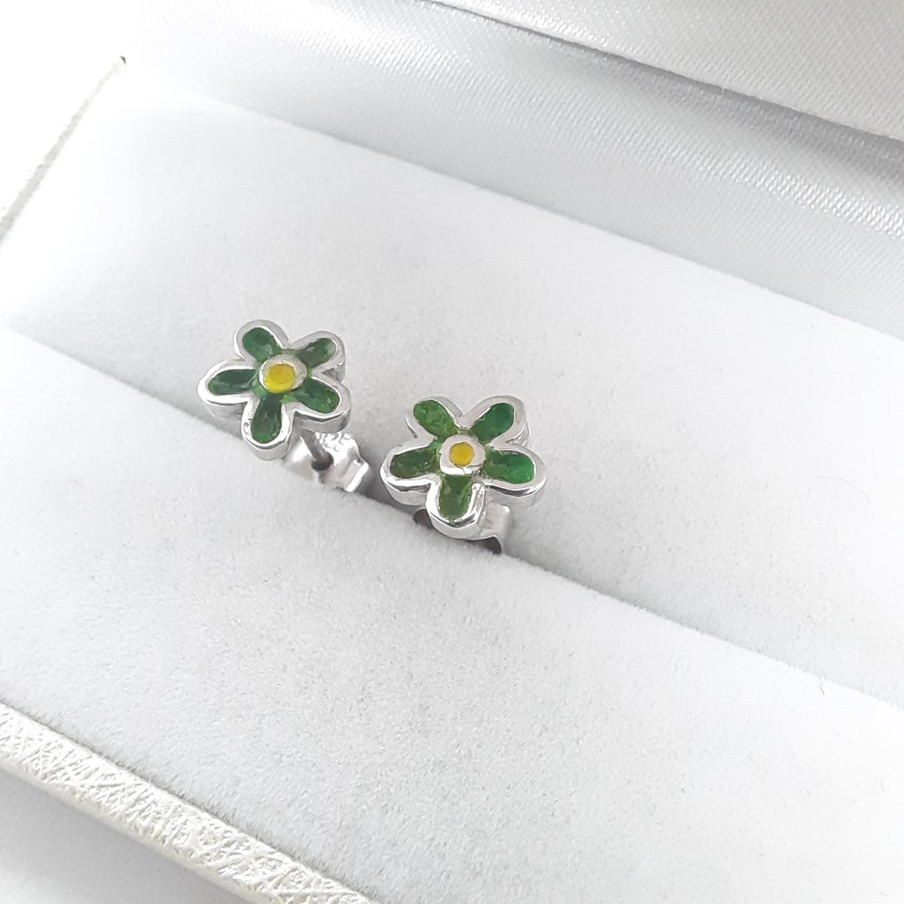 Ασημένια σκουλαρίκια design άνθη με πράσινο σμάλτο, χαριτωμένο κόσμημα για μικρές δεσποινίδες.