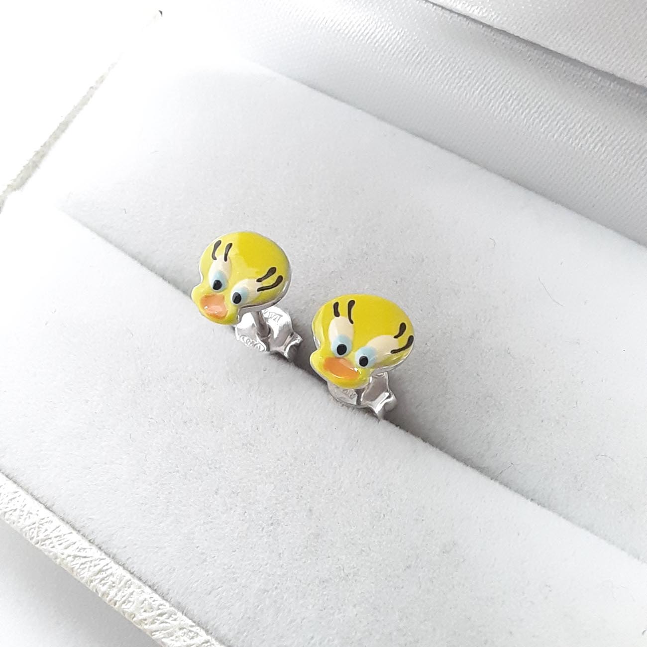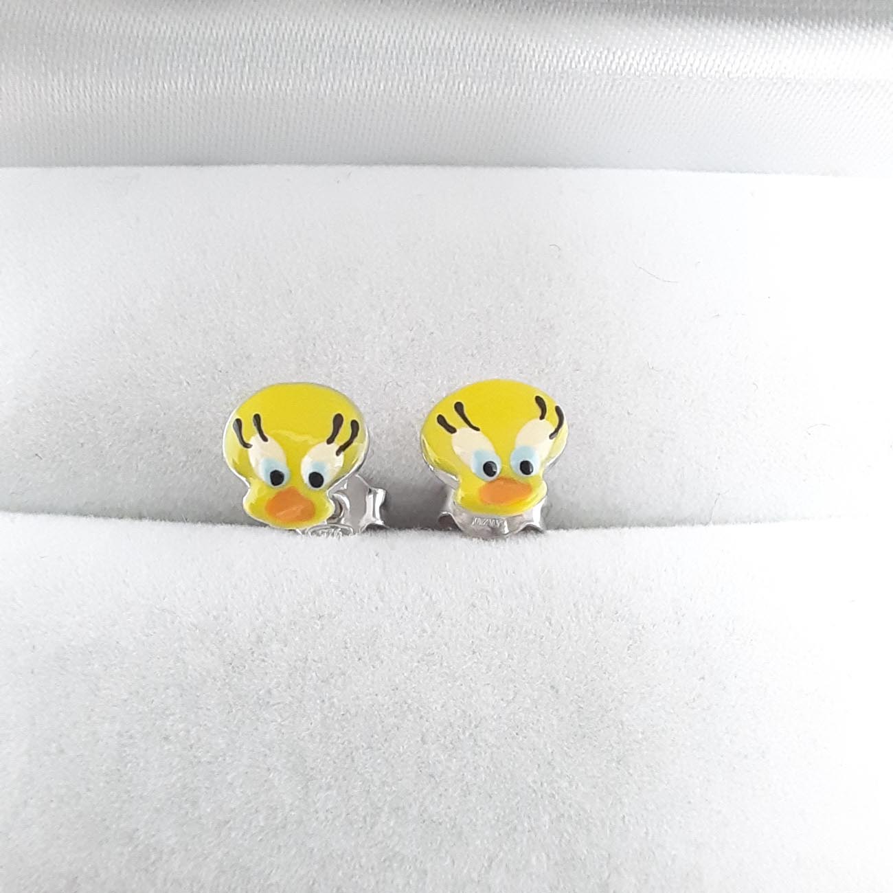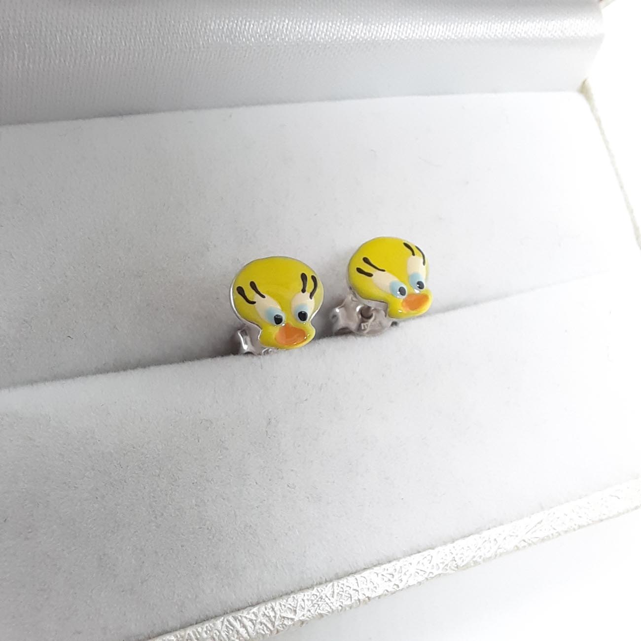 Παιδικά ασημένια σκουλαρίκια με χαριτωμένα πουλάκια, σε κίτρινη απόχρωση, με λεπτομέρειες από σμάλτο.