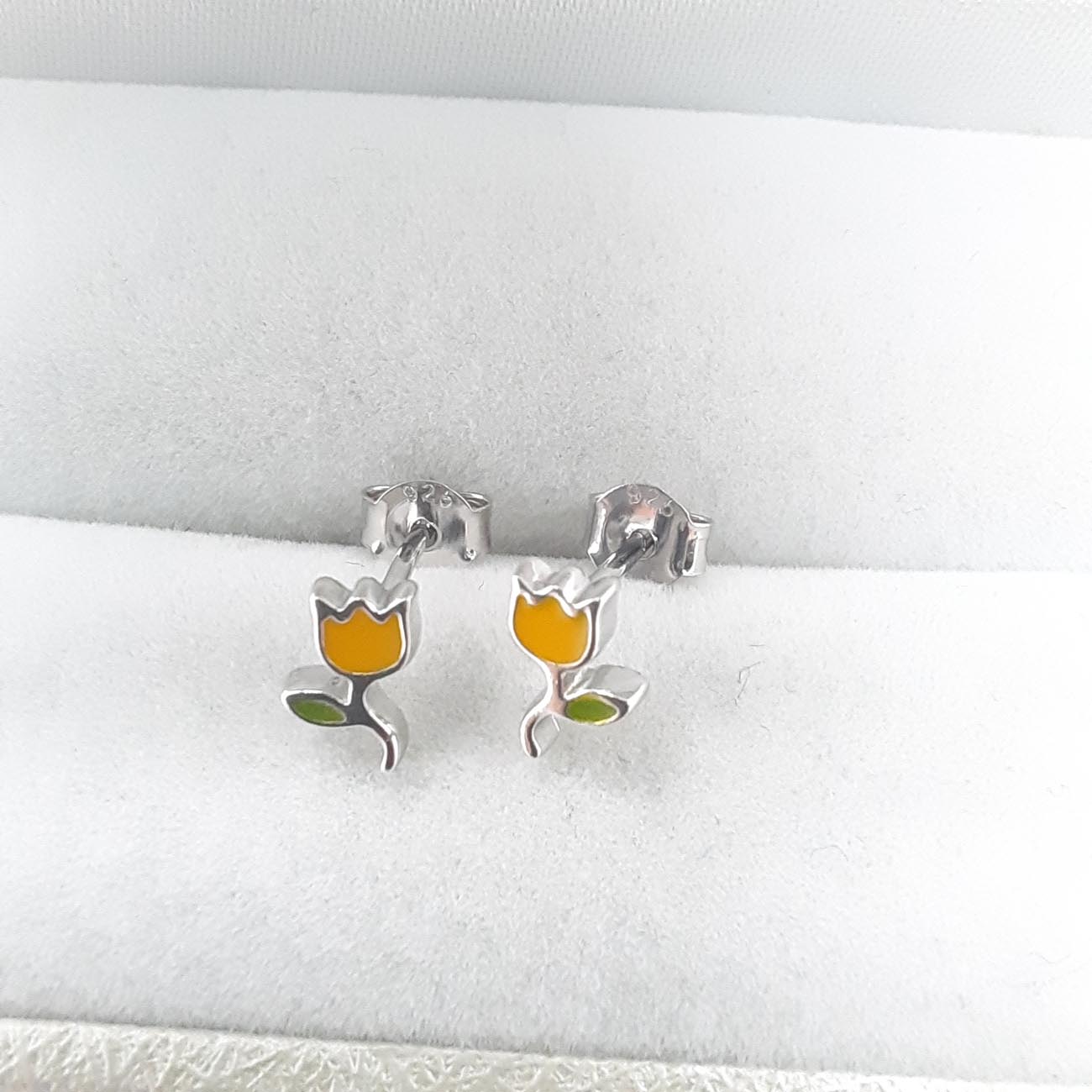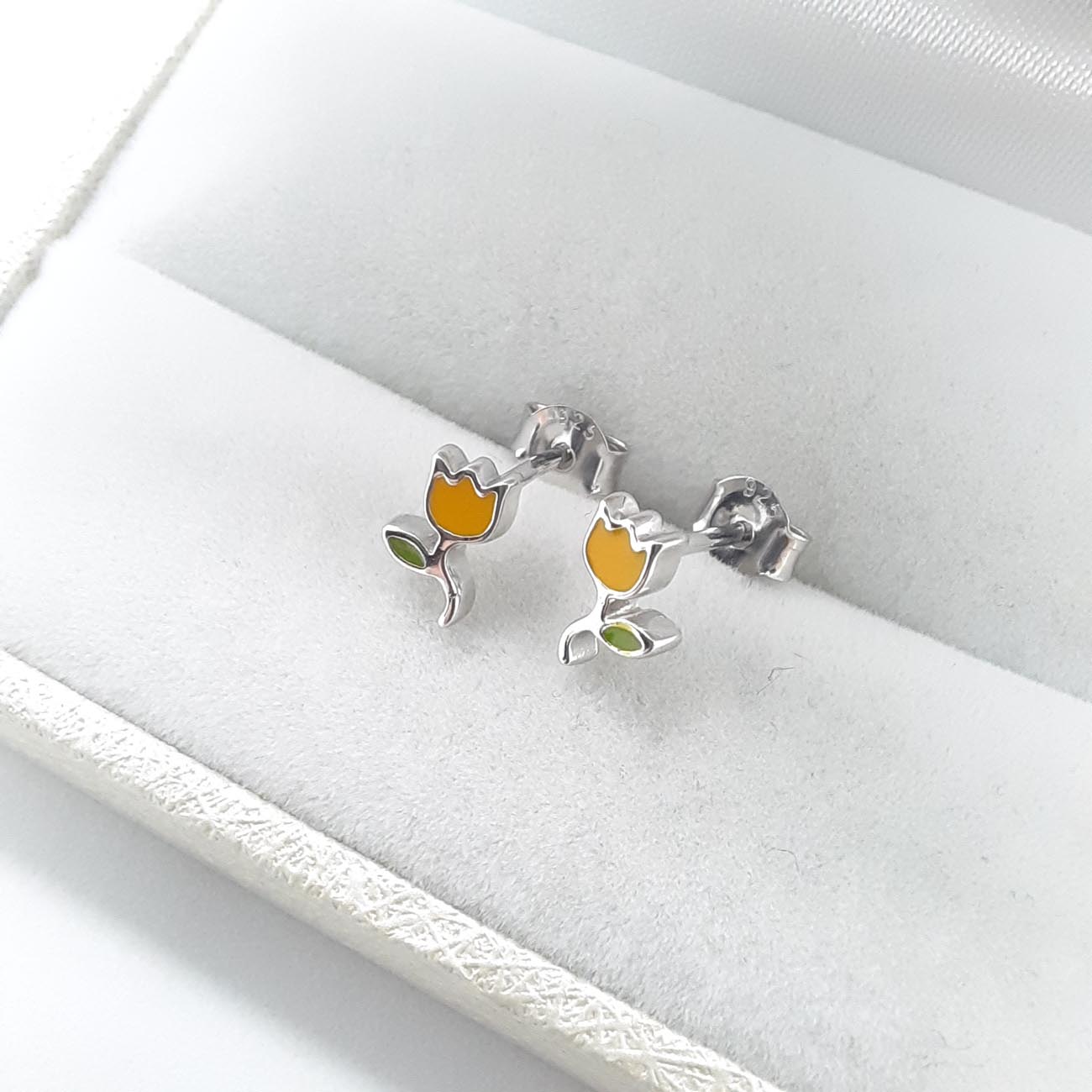 Ασημένια σκουλαρίκια για τις μικρές μας, σε design τουλίπας, πολύ διακριτικό μέγεθος, με λεπτομέρειες σμάλτου.