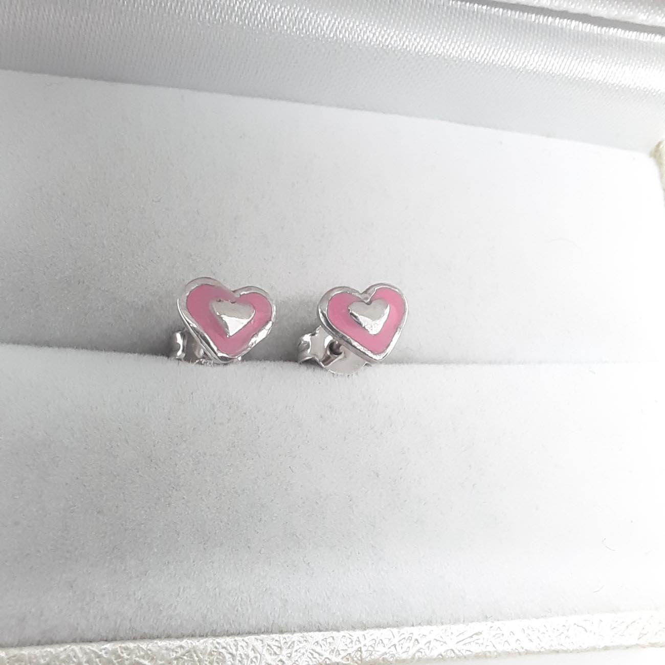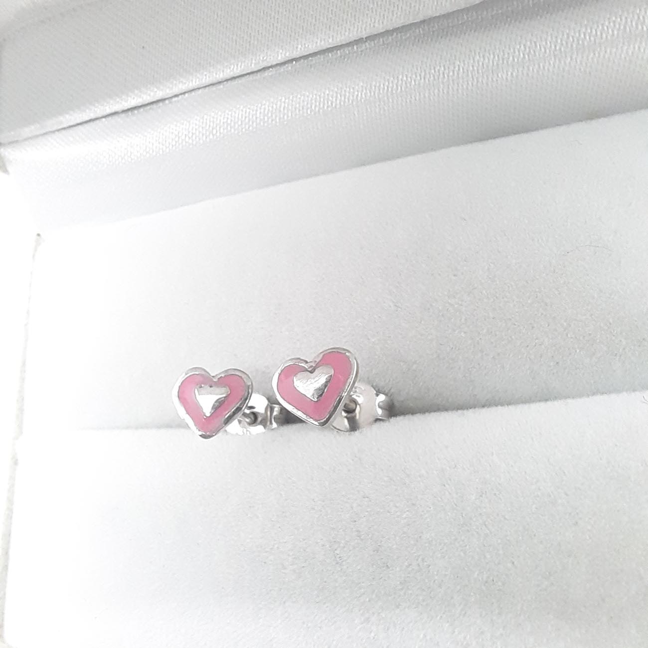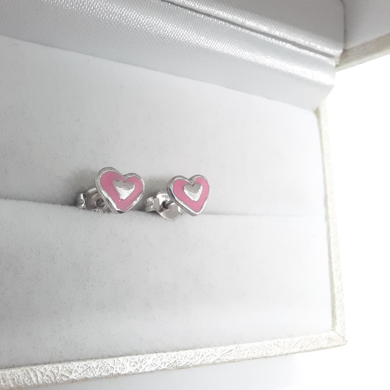Χαριτωμένα σκουλαρίκια από ασήμι σε design καρδιά με ροζ σμάλτο, ιδανικό κόσμημα για μικρές δεσποινίδες.