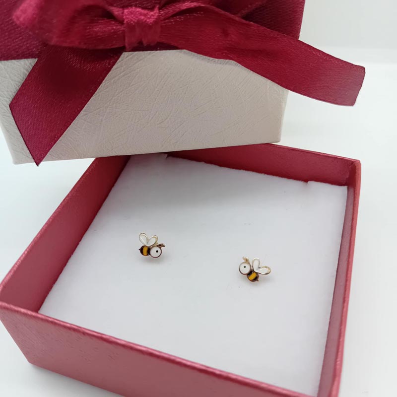 Το πρώτο κόσμημα για τρυφερά αφτάκια! Χαριτωμένες μικρούτσικες πολύτιμες μελισσούλες, με λεπτομέρειες σμάλτου, πολυαγαπημένο design, από χρυσό 9 καρατίων !
